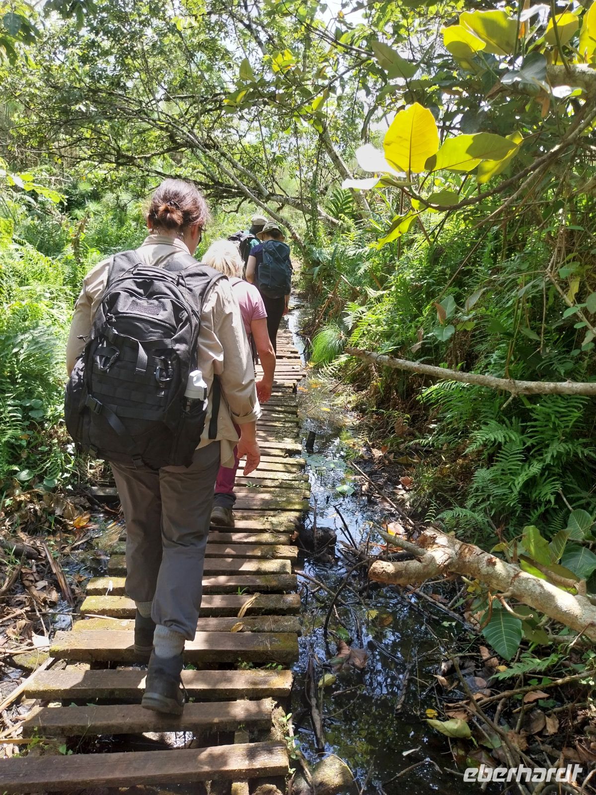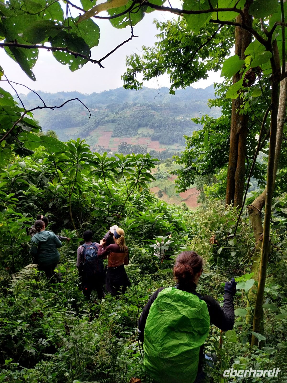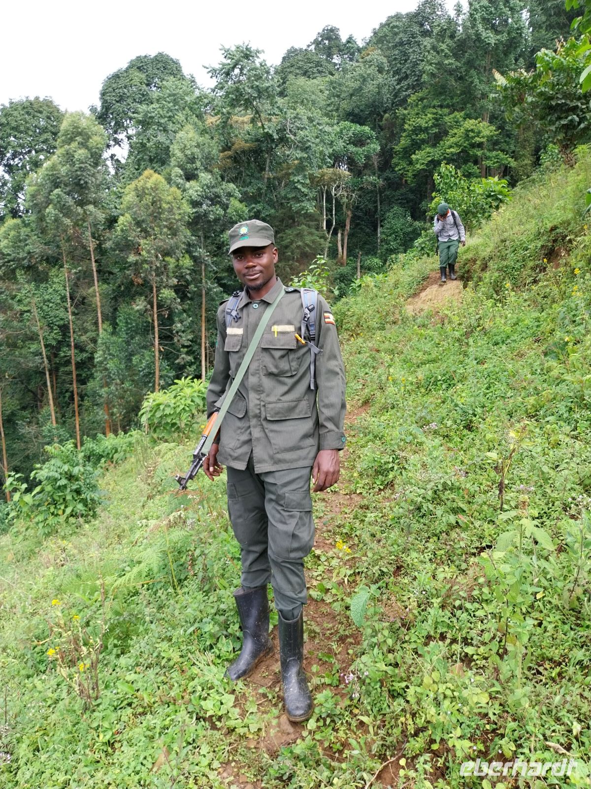 Mit Wanderstöcken, 3 Rangern sowie 4 Trägern, welche uns beim Transportieren der Rucksäcke halfen sowie später beim Abstieg im steilen Gelände unterstützen, begannen wir unsere Wanderung in Richtung Regenwald. Es war noch etwas matschig vom Vortag, doch nun schien die Sonne. Immer wieder telefonierte unser Ranger mit den "Trackern". Sie waren bereits vorausgegangen um die Gorillafamilie, bestehend aus 14 Tieren aufzuspüren.