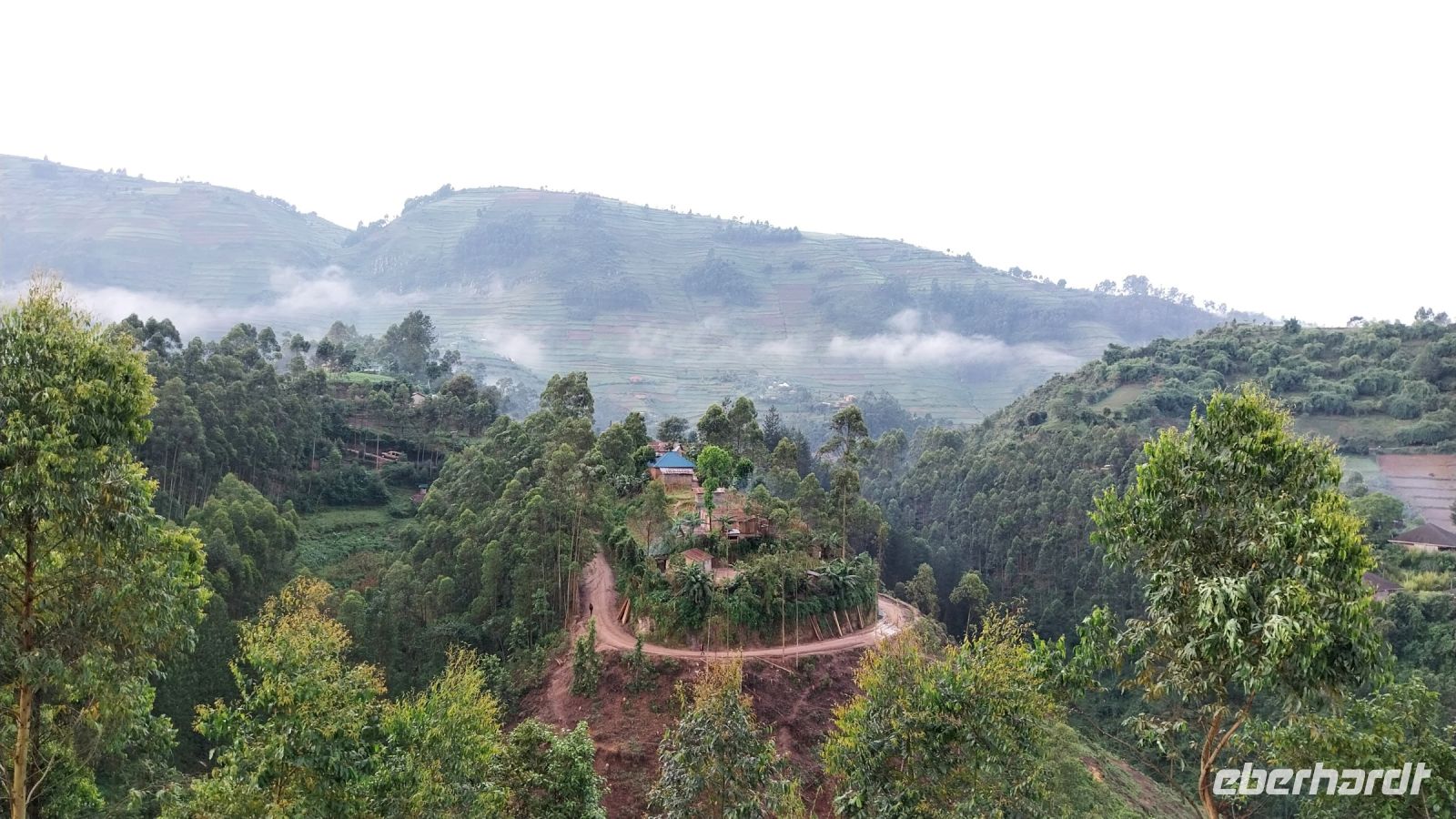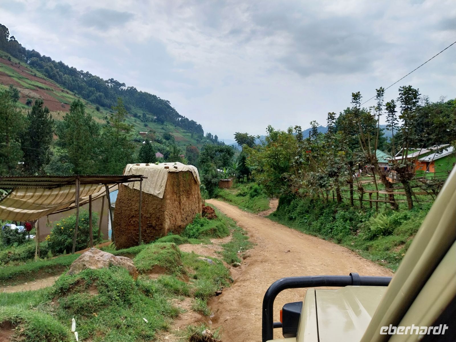 Nach unserem Frühstück fuhren wir zunächst einige wenige Kilometer um ein Dorf der Batwa-Pygmäen zu besuchen. Das letzte Stück bewältigten wir zu Fuß über schmale Wege entlang der Berghänge.