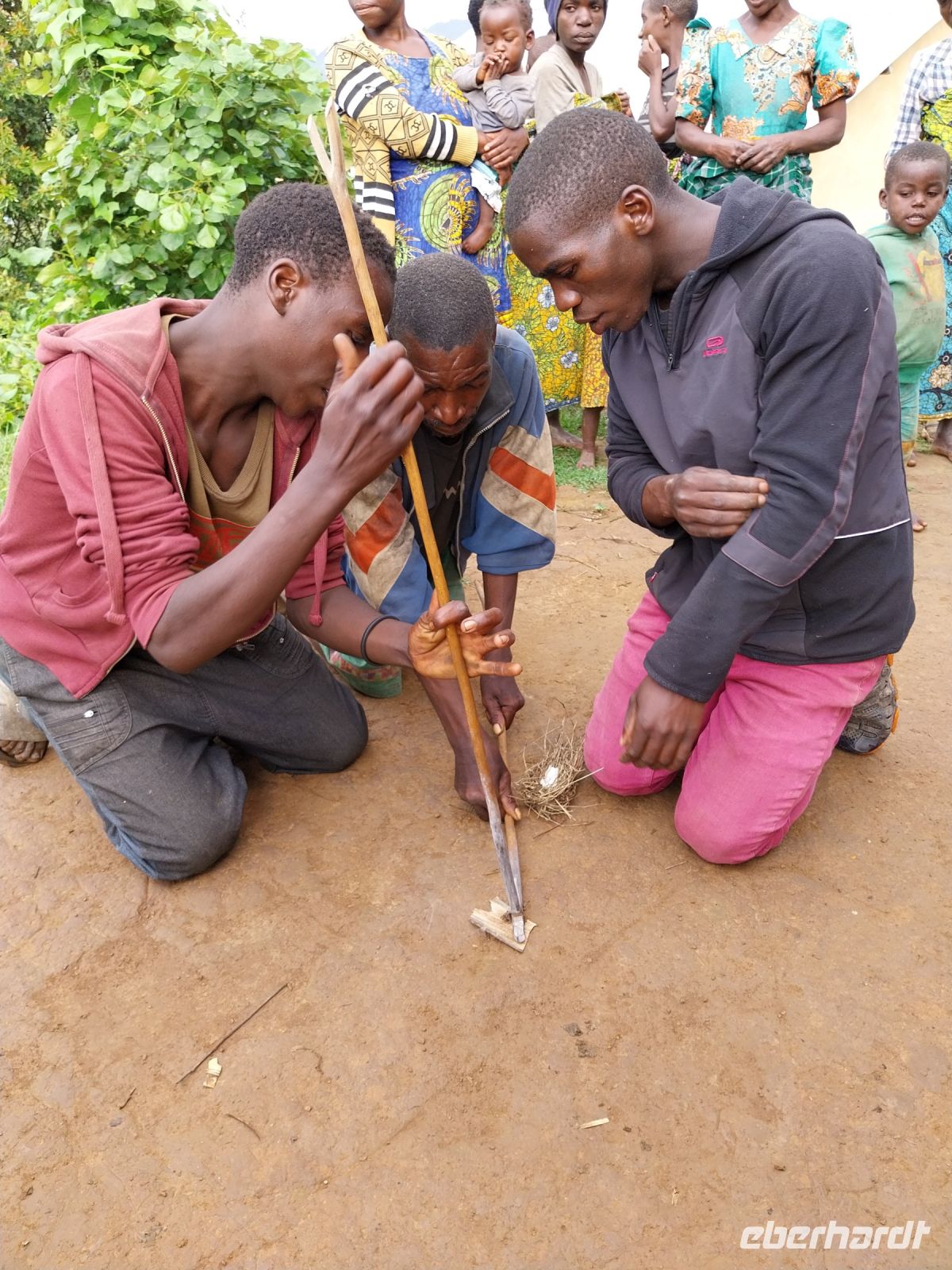 Die Einwohner des besuchten Dorfes mussten 1991 den Regenwald aufgrund der Ansiedlung der Gorillas verlassen. Das Dorf bestand aus 35 Mitgliedern, davon 22 Erwachsene. Sie führten mehrere Tanzstücke auf und zeigten uns wie sie ein Feuer durch Reiben von Stöcken entfachen können. Außerdem beantworteten sie uns viele Fragen.