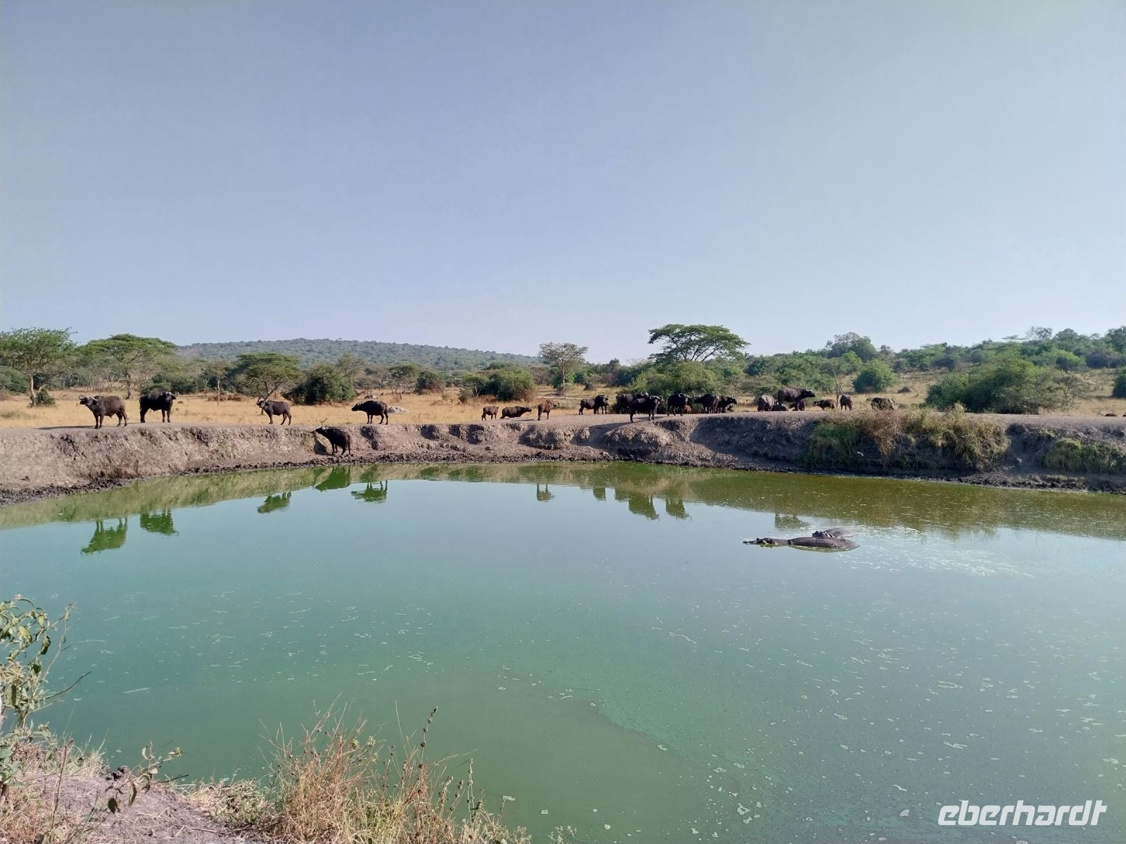 Heute stand ein weiterer Gamedrive an. Wir sahen wieder unzählige Tiere: Büffel- und Elefantenherden, Nilpferde, Wasserböcke, (Kop-)Antilopen, ein Löwenpärchen sowie eine Python. Als weiteres Abenteuer fuhr sich unserer Toyota Landcruiser im Schlamm fest. Dank eines anderen Jeeps, welcher uns von hinten anschob, kamen wir wieder frei. Auch ohne Sichtung eines Leoparden war es ein spannender Tag.