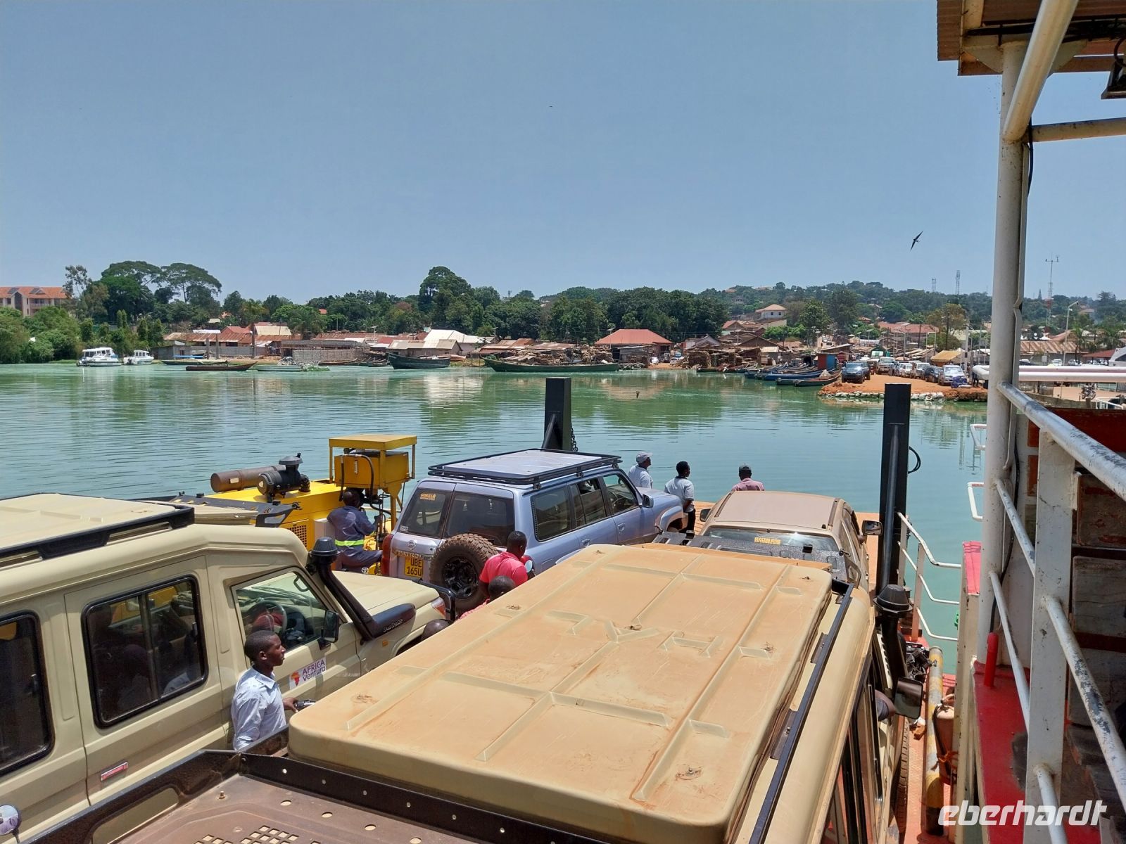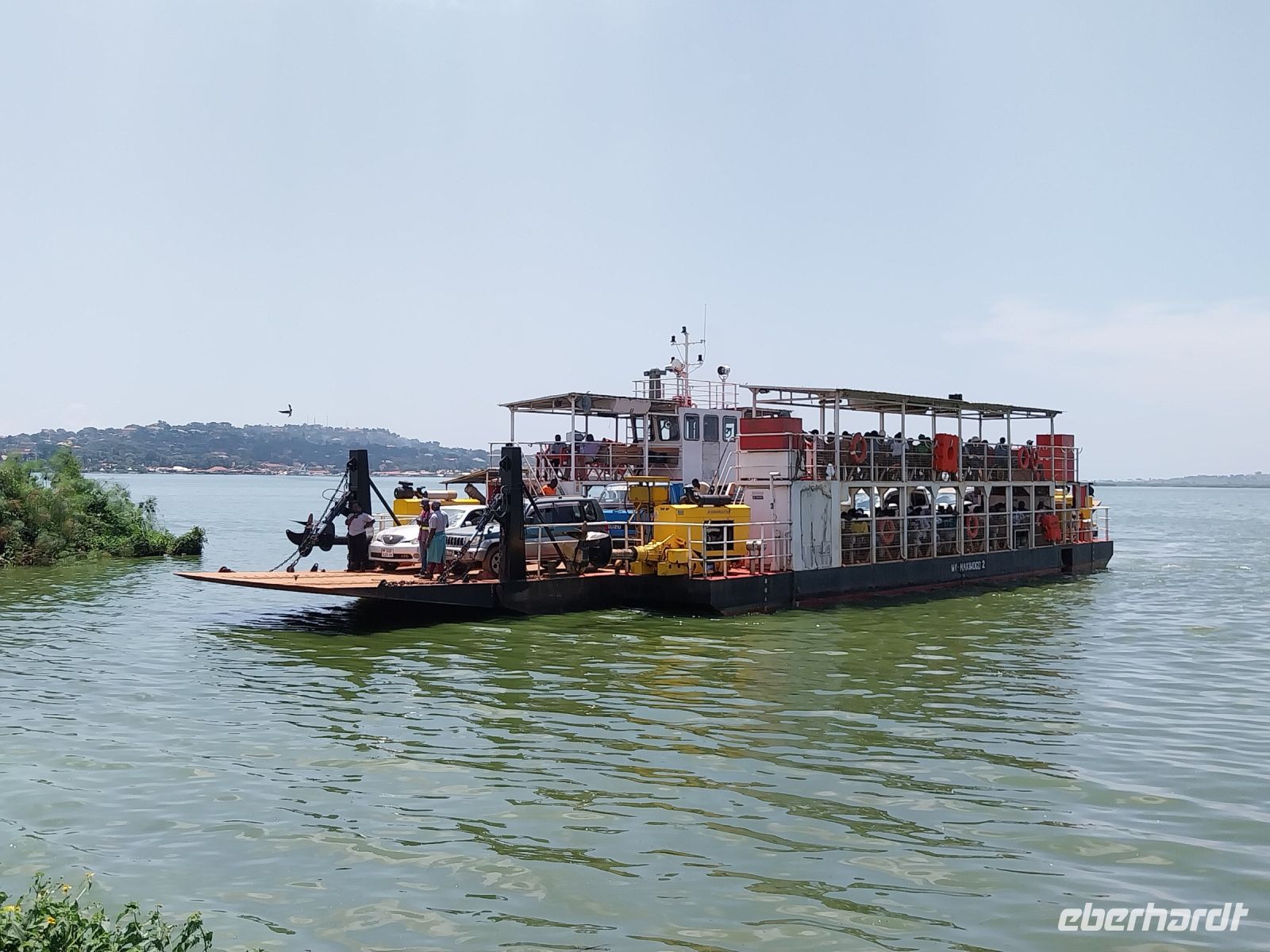 Heute war leider bereits der letzte Tag unserer Reise in Uganda angebrochen. Wir trafen uns zum Frühstück und begannen danach unsere Rückfahrt in Richtung Entebbe. Unterwegs hielten wir am Äquator und kauften letzte Souvenirs ein. Der Verkehr nahm deutlich zu. Viele schwer beladene LKW befuhren die Straße in Richtung Hauptstadt. Außerdem gab es unterwegs viele Polizeikontrollen. Akim erfüllte uns auch noch den letzten Wunsch und so nahmen wir eine Abkürzung und fuhren mit der Fähre über den Victoriasee.