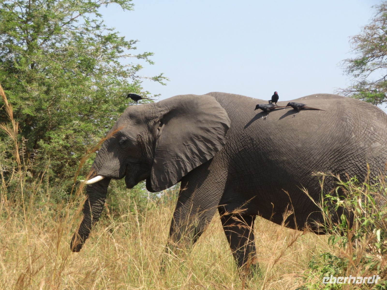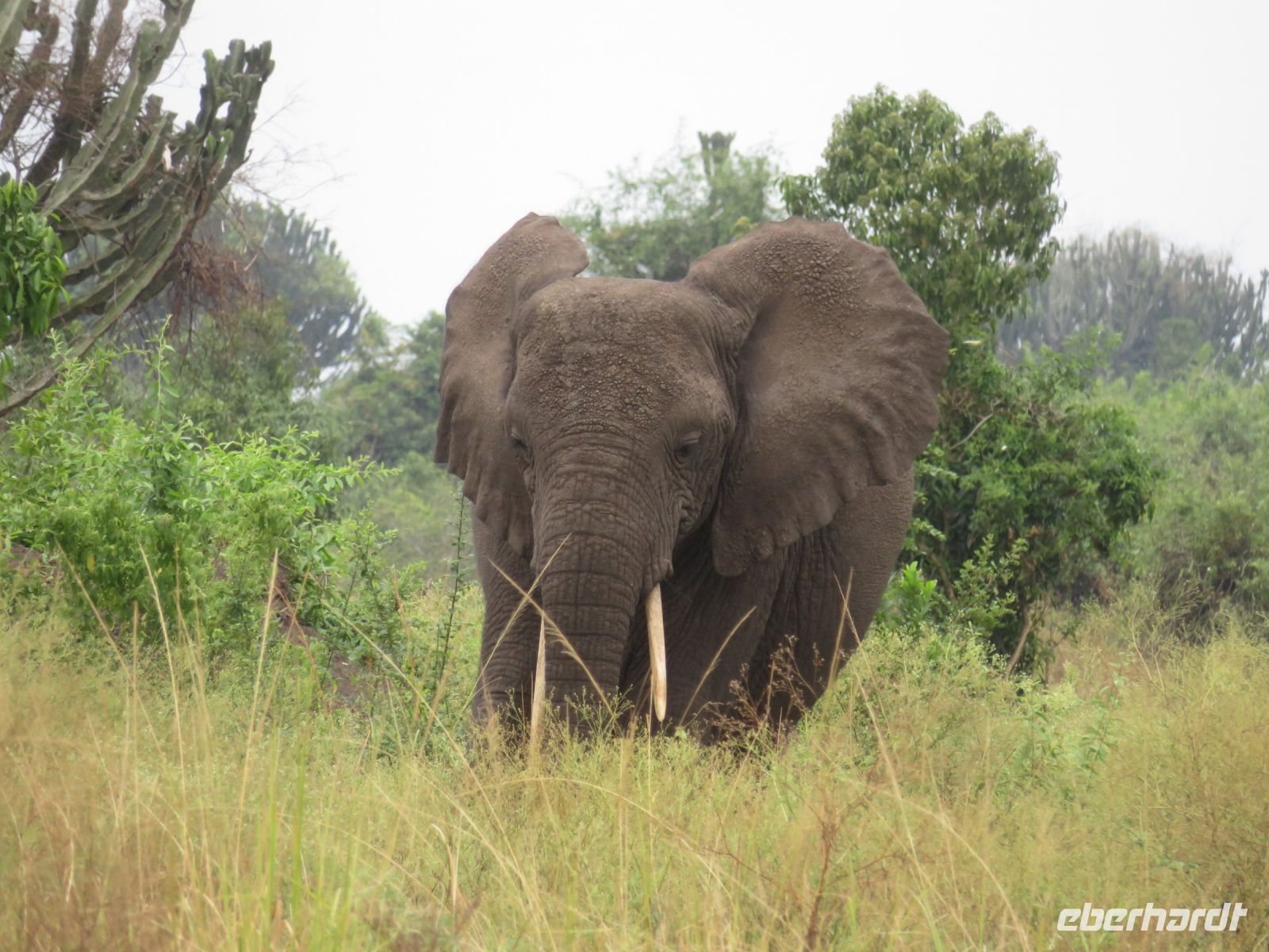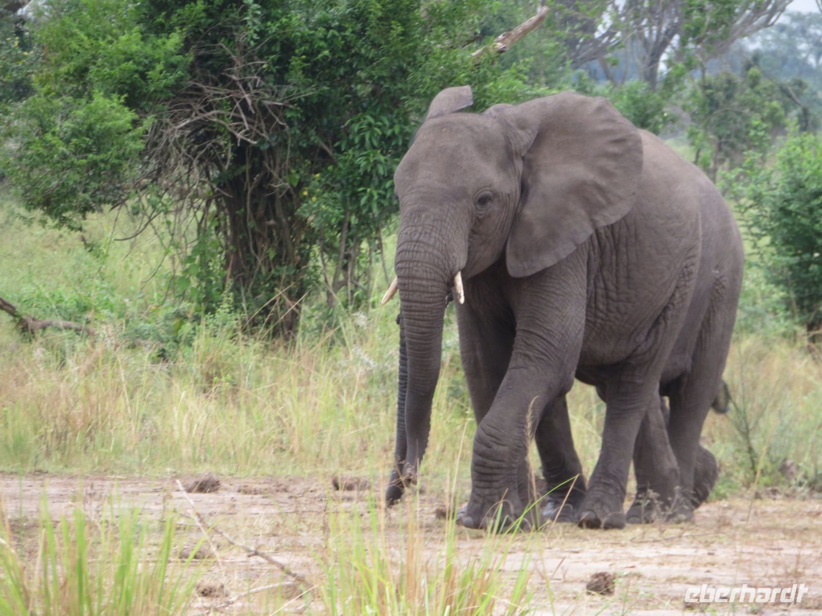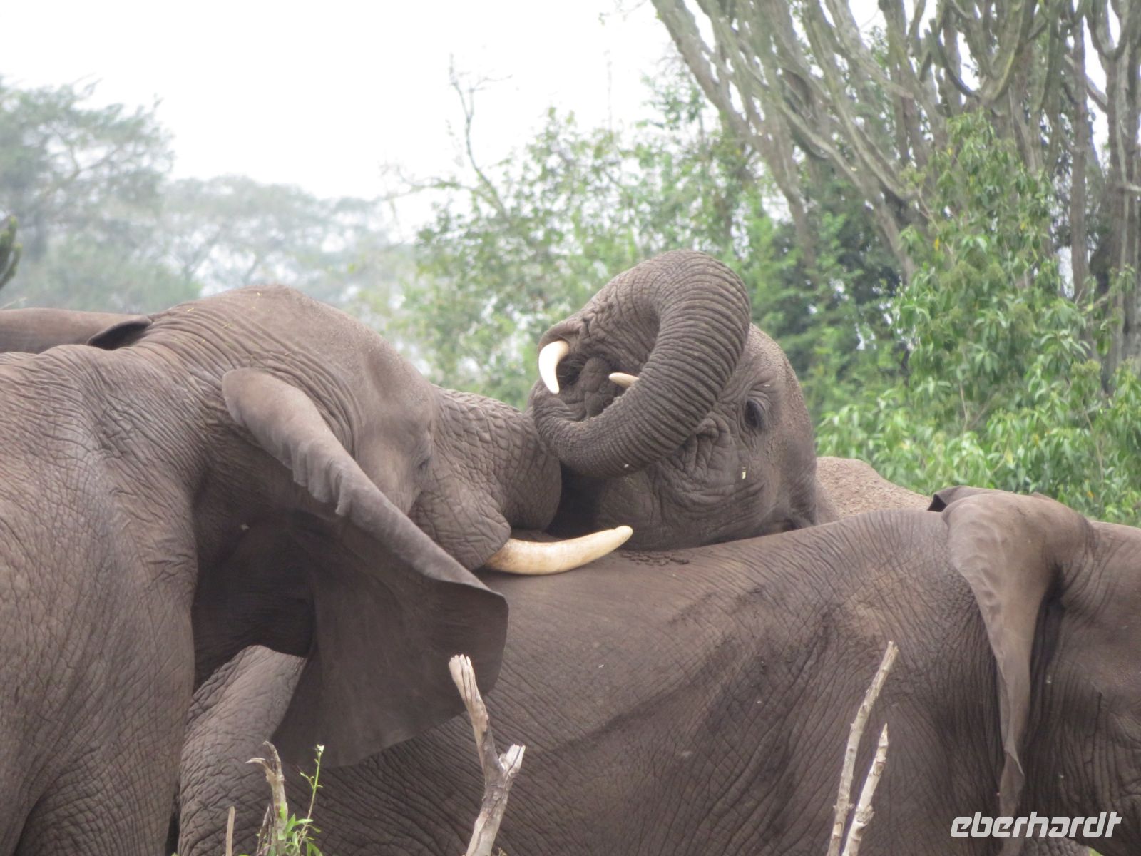 Wir verabschiedeten uns von dem Hotel der letzten zwei Nächte und setzten unsere Reise in südwestlicher Richtung durch den Queen Elizabeth-Nationalpark fort. Die Straßen wurden schlechter und schmaler. Die Landschaft und die Tiere blieben atemberaubend. Uhus, Nilpferde, Affen - im Ishasha-Sektor folgten Halbmondantilopen (auch Topi genannt), Büffelherden, Elefanten, ein Riesenschwein und ein Leopard streifte durch die Landschaft und kreuzte vor unserem Auto. Die Big 5 waren "erlegt".