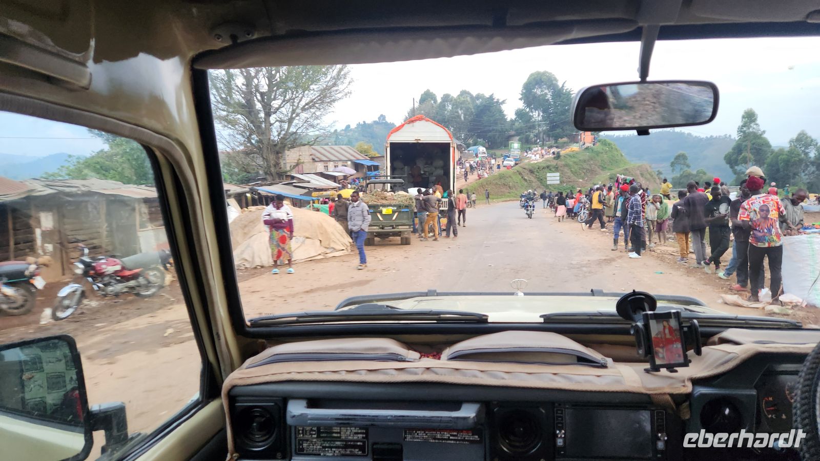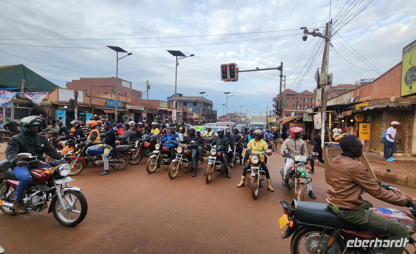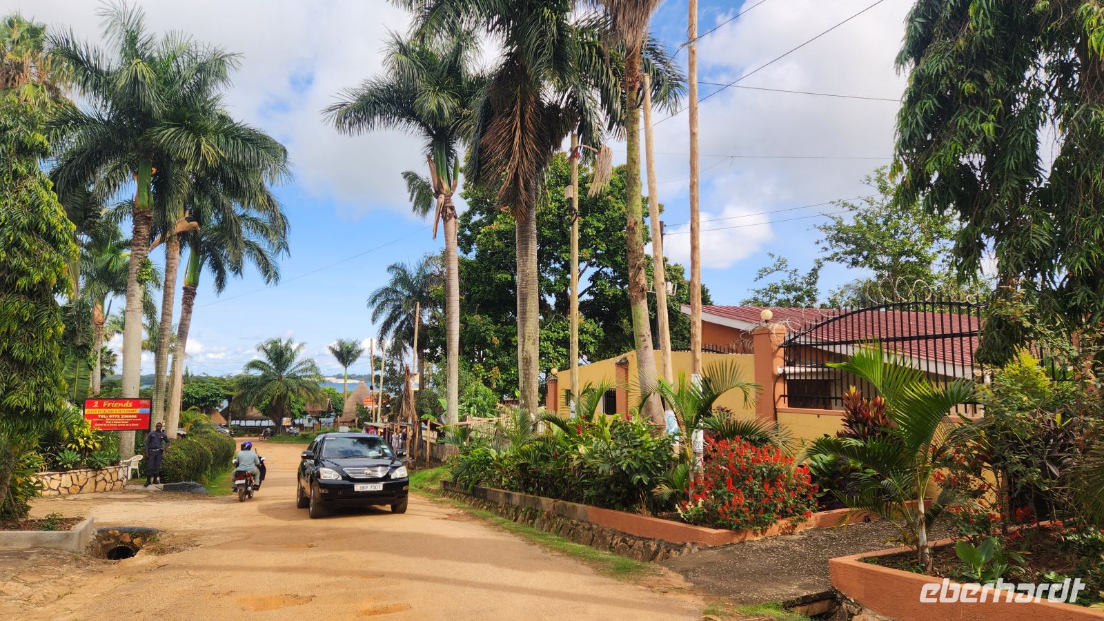 Zunächst heißt es, Kampala, die Hauptstadt, zu durchqueren. Der Verkehr ist dicht, immer wieder stehen wir im Stau und kommen nur langsam voran. Schlagartig fühlen wir uns in einer anderen Welt: einfache Verkaufsstände am Straßenrand, überladene Mopeds, die sich ihren Weg bahnen, Hitze, Staub und die tiefrote Erde Ugandas.