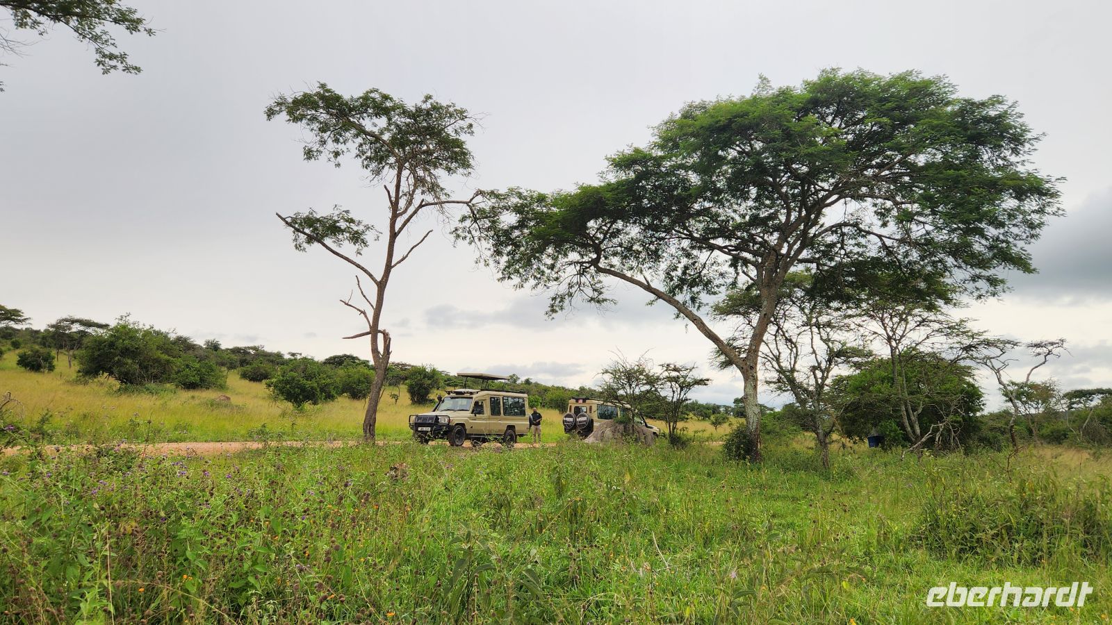 Heute ist unser Ziel der Queen Elizabeth National Park. Wie fast schon traditionell, macht unser Jeep zunächst Probleme. Kaum stehen wir am Straßenrand, dauert es keine fünf Minuten, bis sieben Helfer an der Motorhaube stehen und den Wagen unter die Lupe nehmen. Glücklicherweise findet Akim eine gute Werkstatt, die das Fahrzeug schnell wieder fit macht. Von nun an wird es uns sicher bis zum Ende der Reise begleiten. Zwei Jeeps nehmen uns an diesem Tag mit und bringen uns komfortabel zu unserer Lodge.