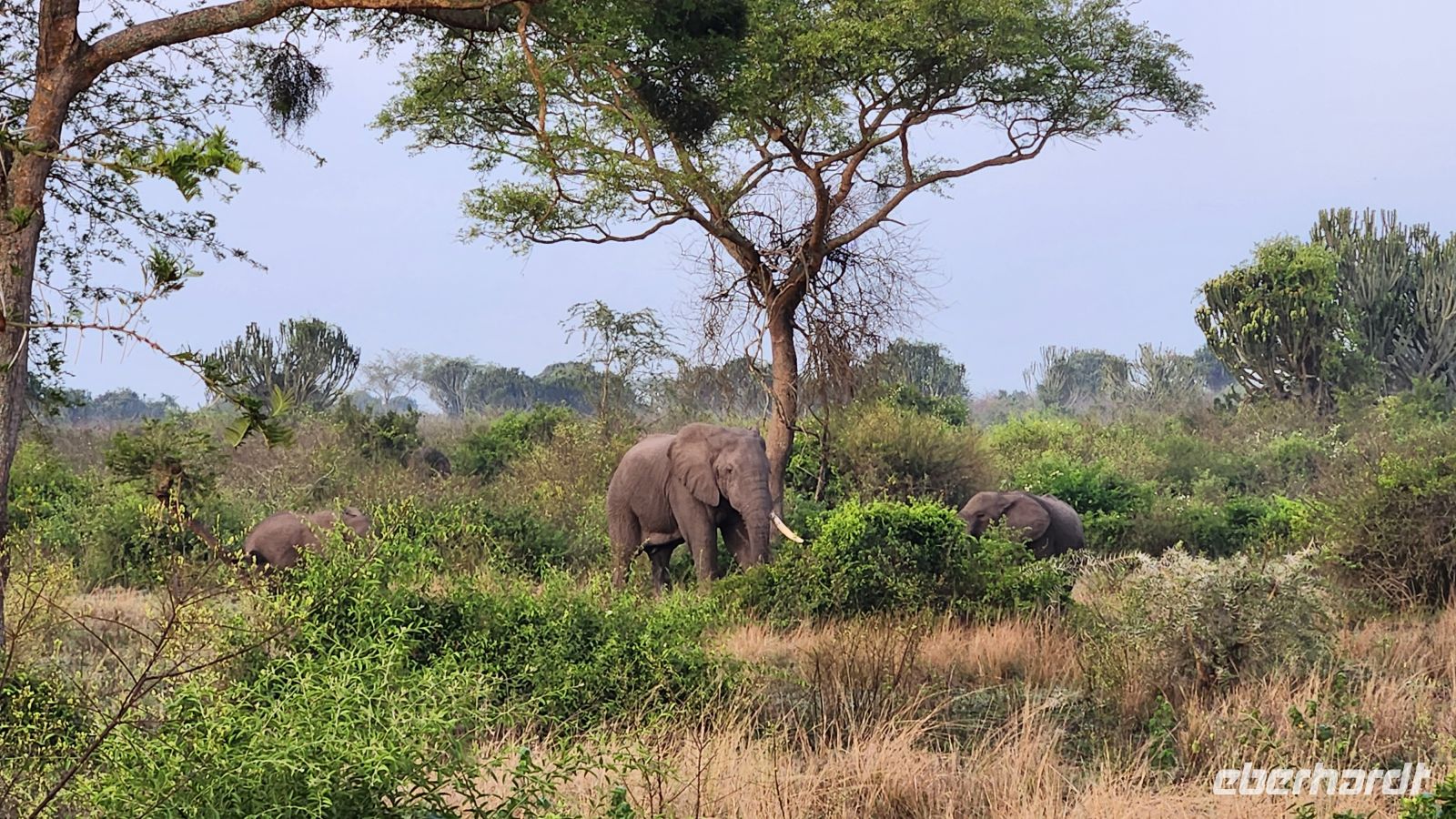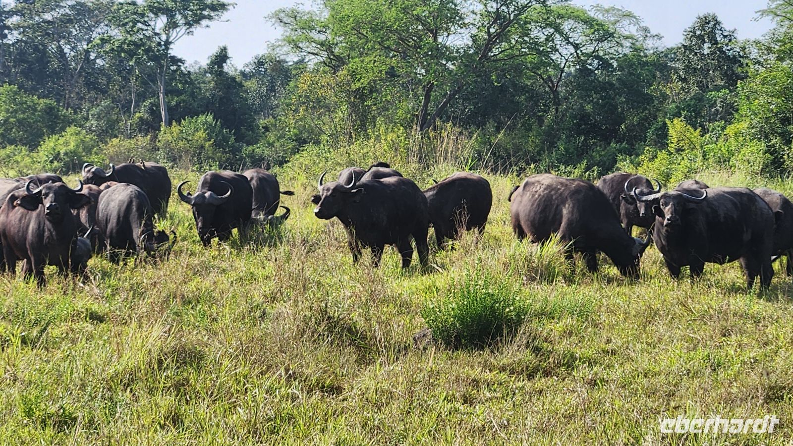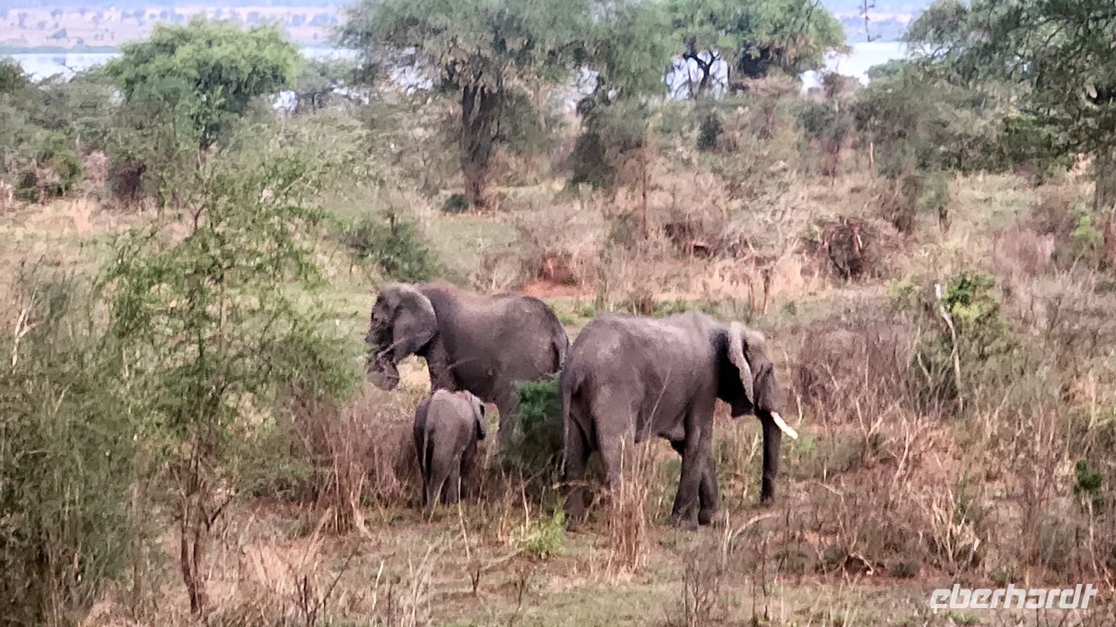Schon bald entdecken wir Elefanten, die gemächlich durch die Savanne ziehen, mächtige Büffelherden, Wasserböcke und Warzenschweine. Immer wieder halten wir Ausschau nach Löwen – so sehr wir es uns auch wünschen, heute zeigen sie sich leider nicht. Dennoch belohnt uns die beeindruckende Landschaft mit ihren weiten Ebenen, Akazien und dem fernen Schimmer der Ruwenzori-Berge.