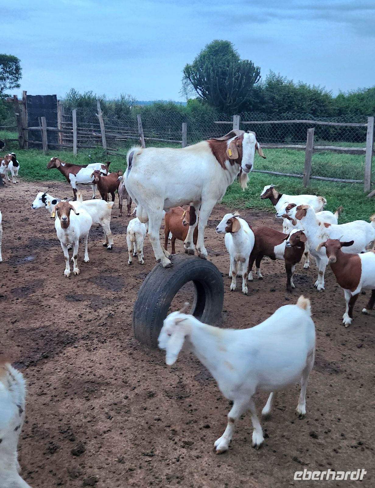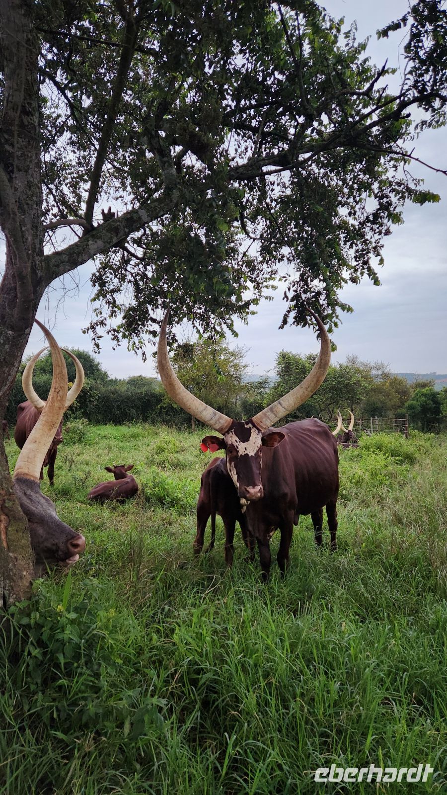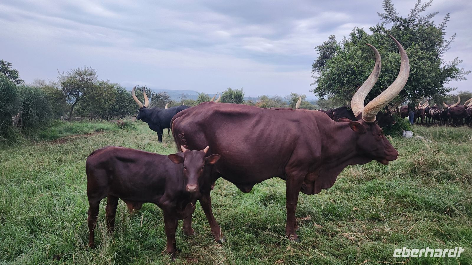 Am Nachmittag erreichen wir schließlich unsere Lodge am Rande des Lake Mburo Nationalpark. Es handelt sich um eine weitläufige Farm mit Ankole-Rindern, Ziegen und Hühnern. Besonders die eindrucksvollen Ankole-Rinder mit ihren großen, geschwungenen Hörnern faszinieren uns.