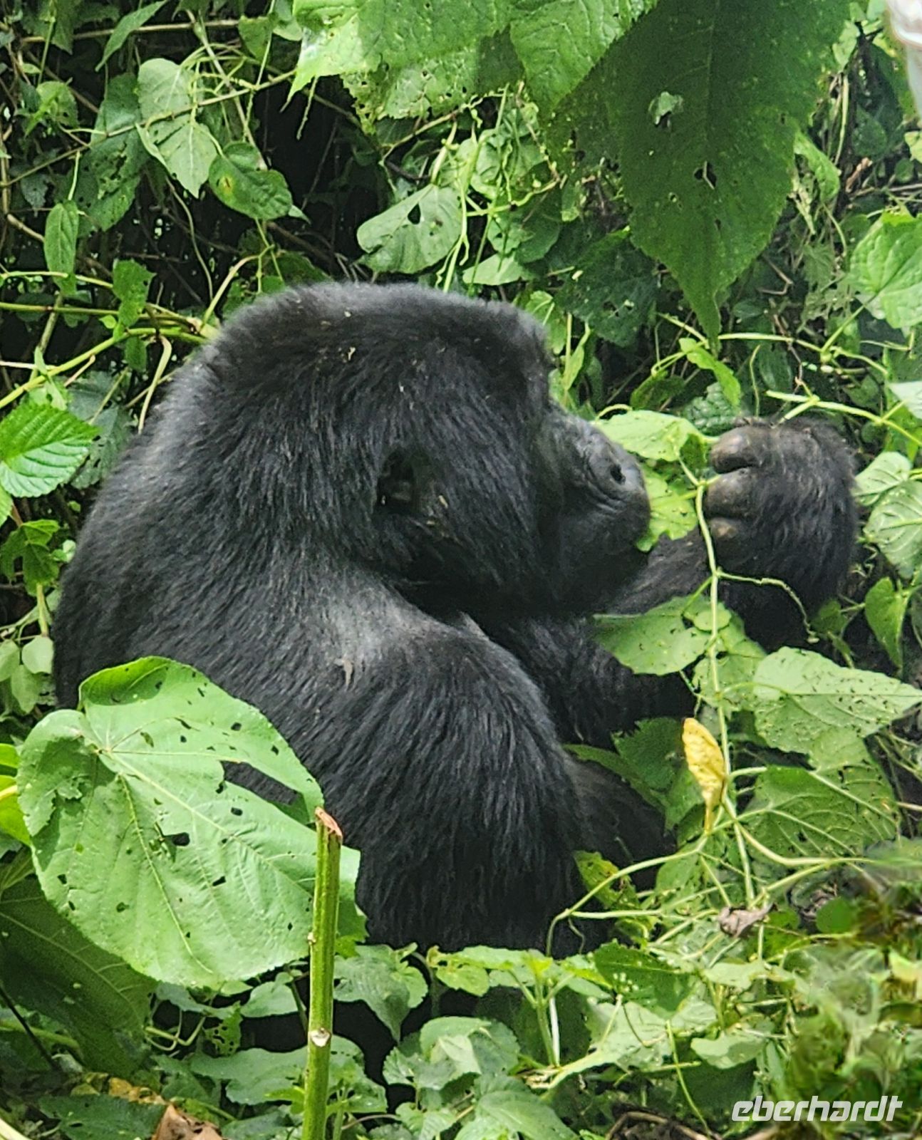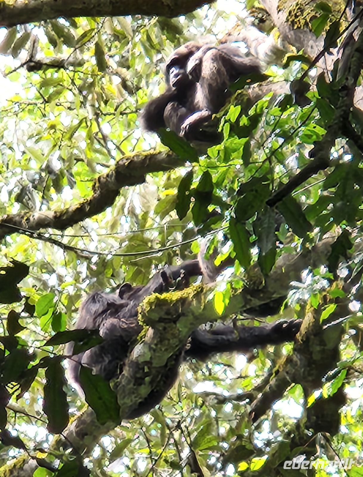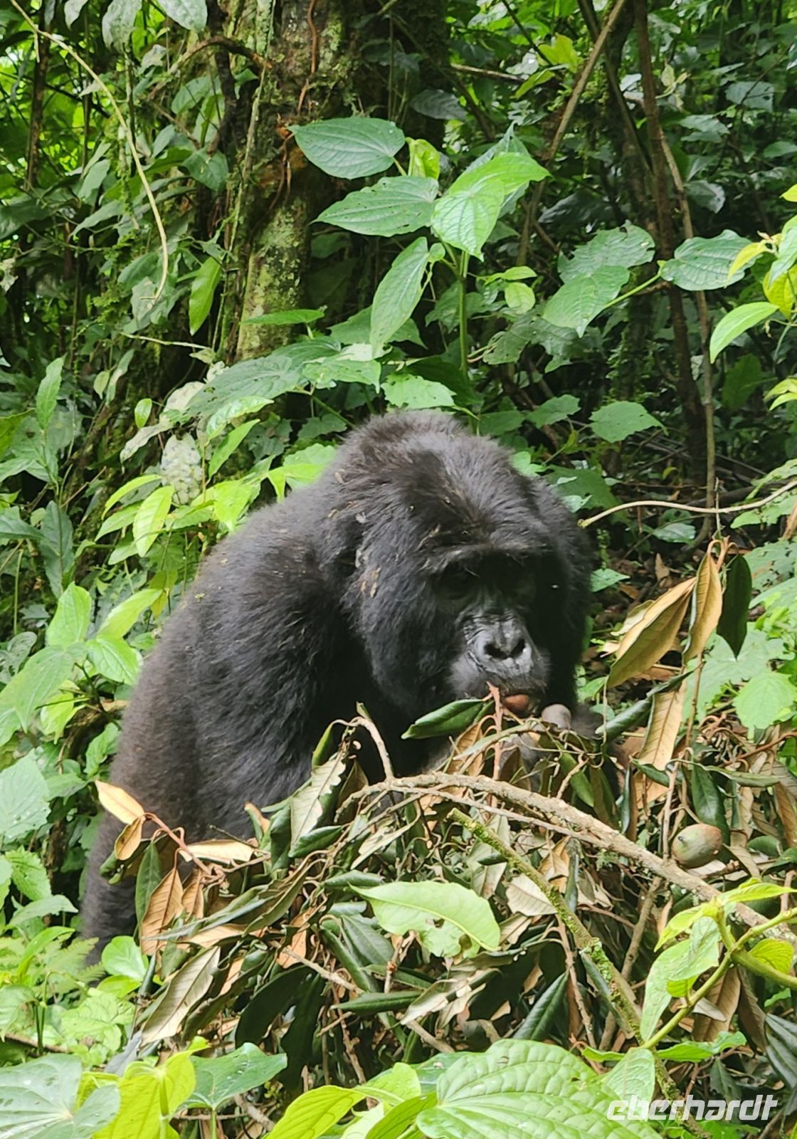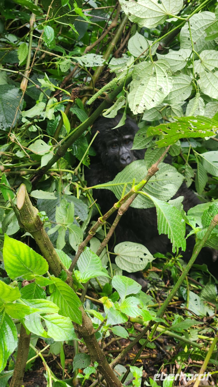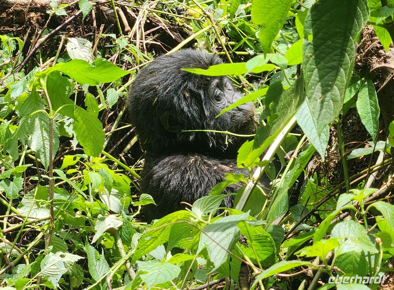 Ein halbstarker Gorilla möchte offenbar Eindruck machen: Er trommelt sich auf die Brust und versucht, sich schwungvoll an einem Ast entlangzuschwingen – purzelt dabei jedoch herunter und rollt sich mehrfach über den Boden. Ein anderer rutscht geschickt einen geraden Baumstamm hinunter, mit einem kleinen Gorilla auf dem Rücken. Zufällig filmt einer von uns genau diesen Moment – es wird das schönste Video unserer gesamten Reise.