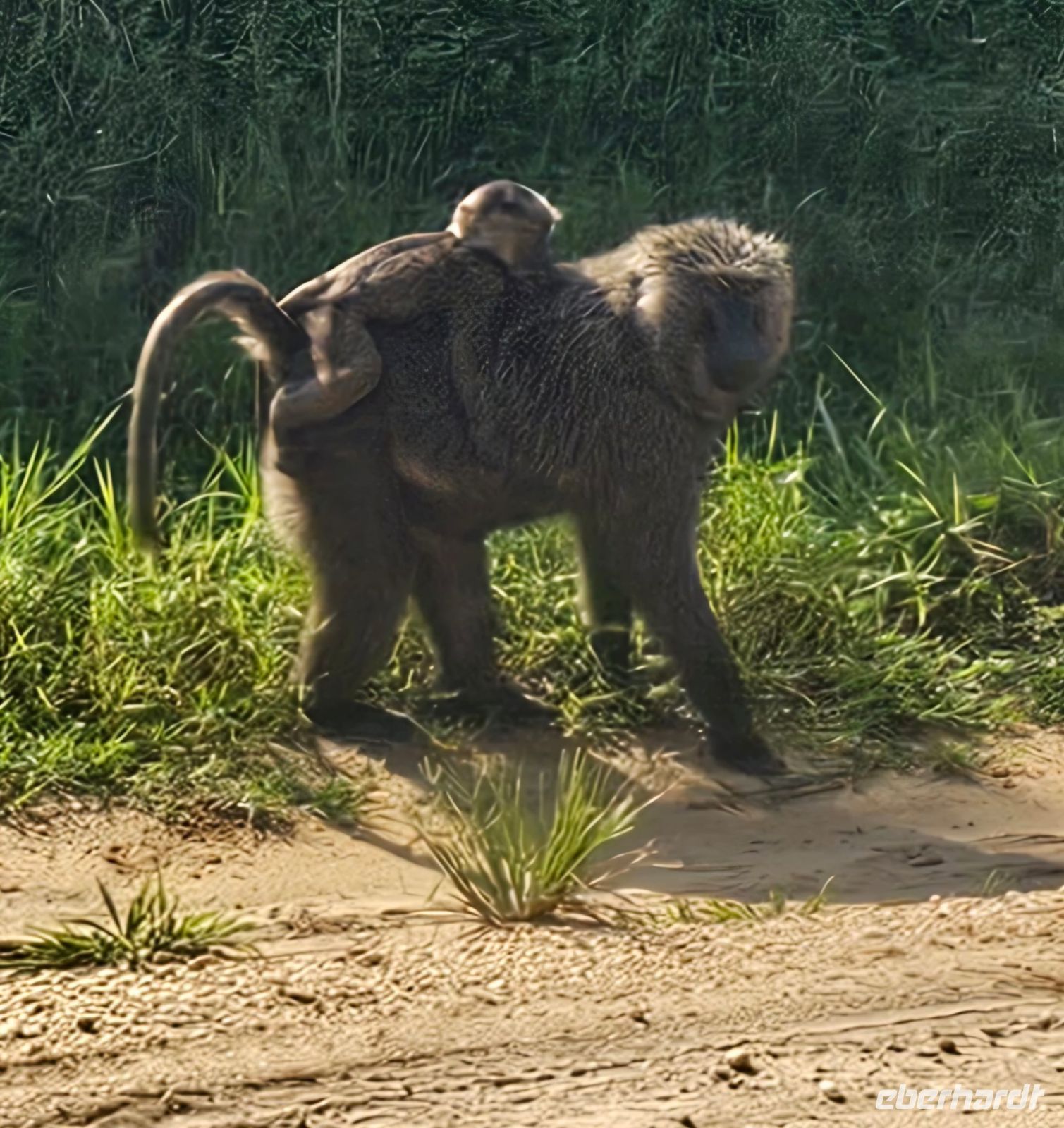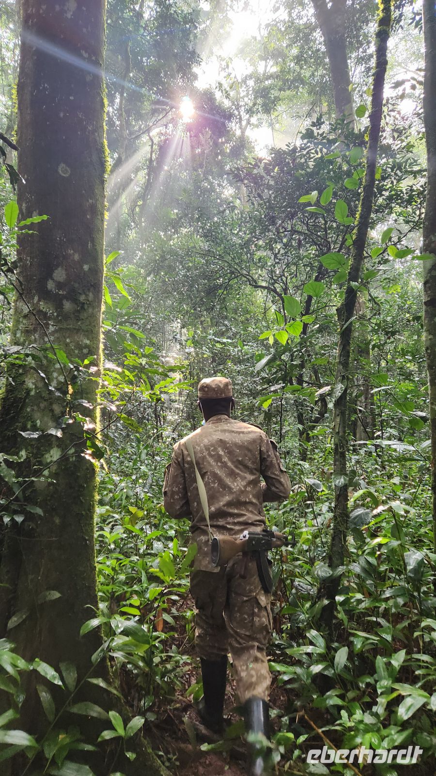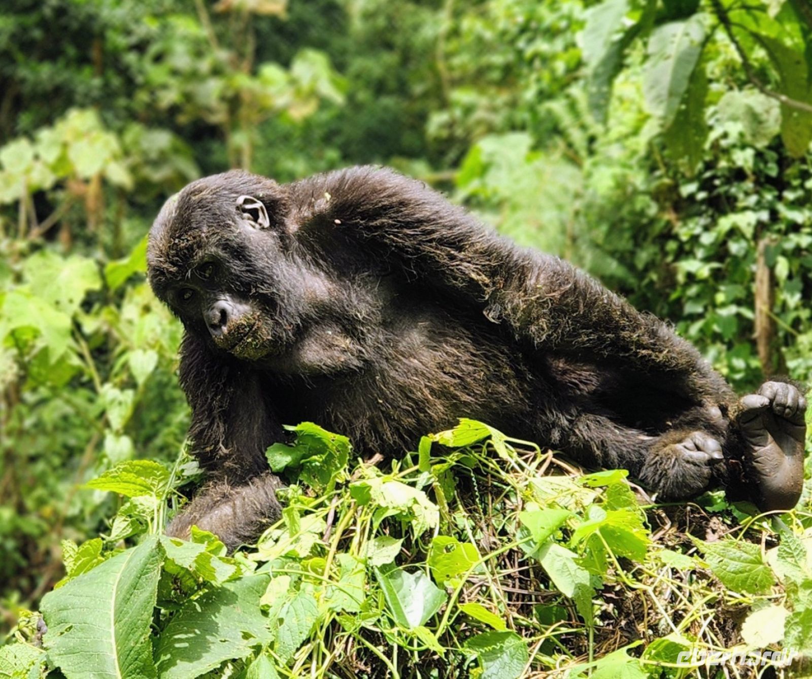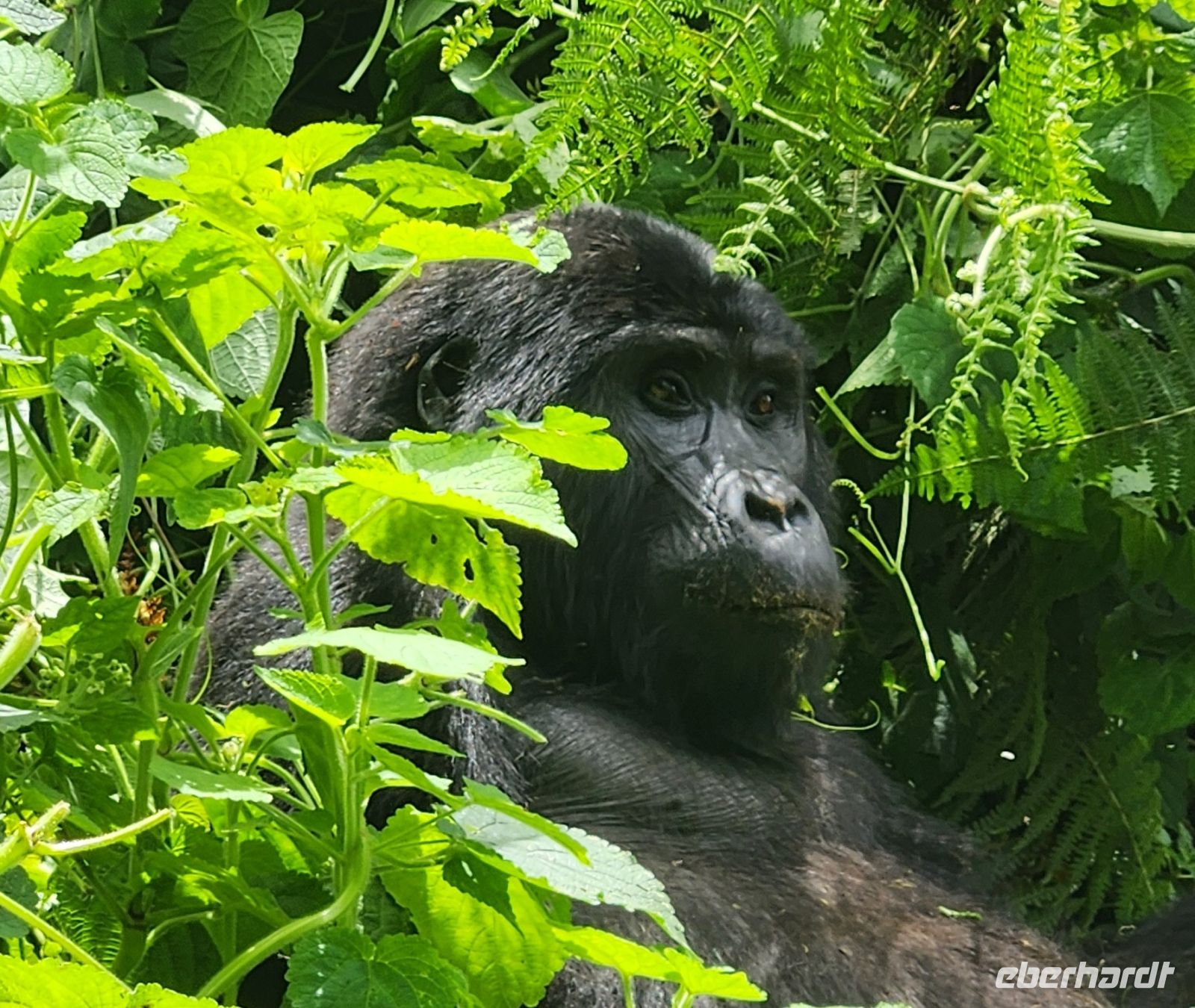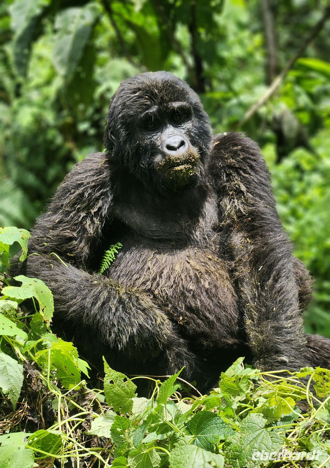 Ein halbstarker Gorilla möchte offenbar Eindruck machen: Er trommelt sich auf die Brust und versucht, sich schwungvoll an einem Ast entlangzuschwingen – purzelt dabei jedoch herunter und rollt sich mehrfach über den Boden. Ein anderer rutscht geschickt einen geraden Baumstamm hinunter, mit einem kleinen Gorilla auf dem Rücken. Zufällig filmt einer von uns genau diesen Moment – es wird das schönste Video unserer gesamten Reise.