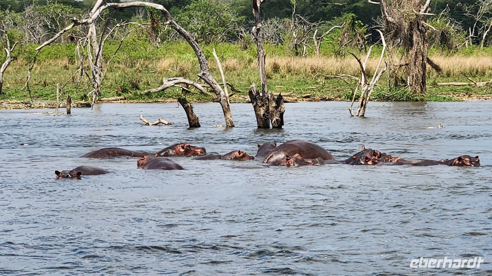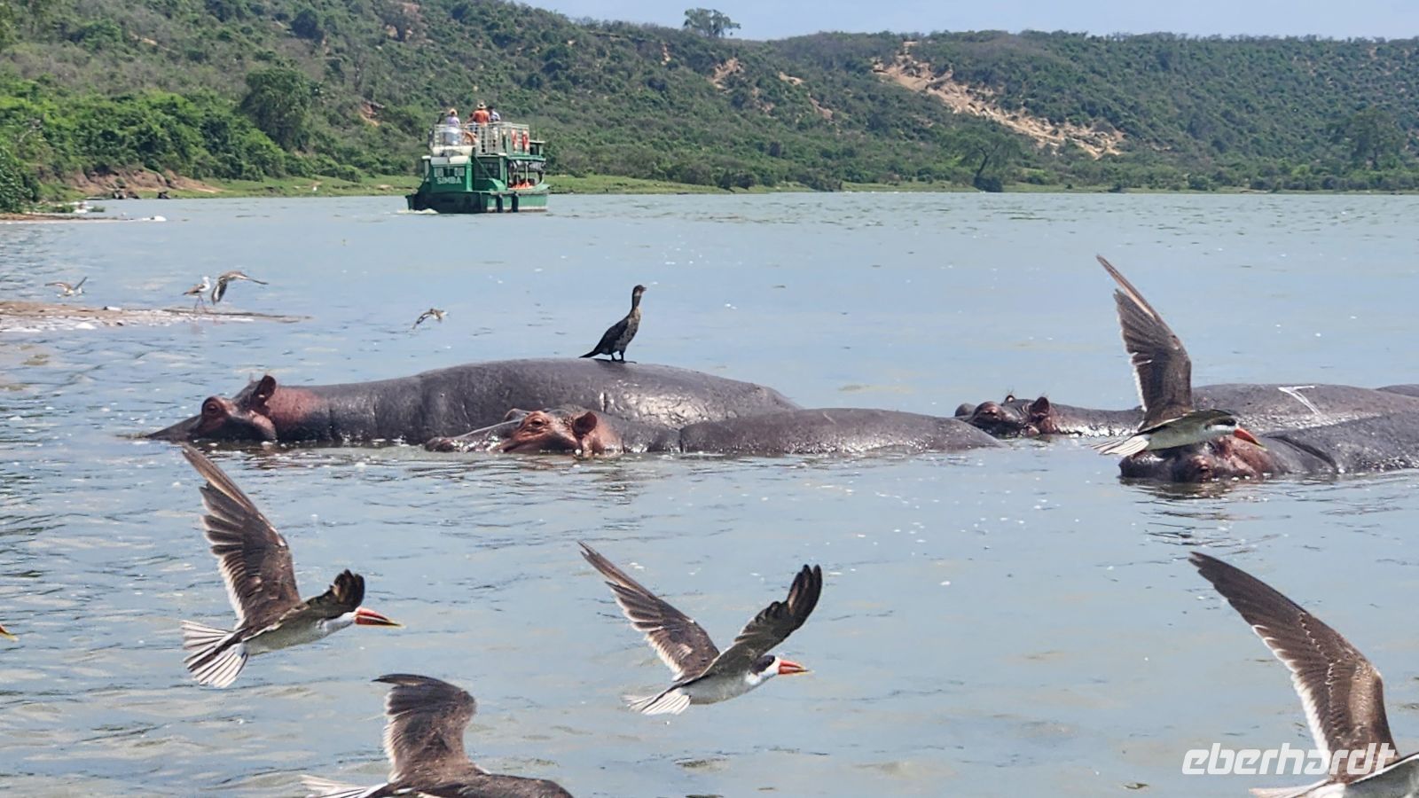 Am Nachmittag brechen wir zu einer Bootsfahrt auf dem berühmten Kazinga-Kanal auf, der den Lake George mit dem Lake Edward verbindet. Kaum sind wir unterwegs, reiht sich ein Fotomotiv an das nächste – so schnell können wir gar nicht fotografieren. Zahlreiche Nilpferde tummeln sich im Wasser, Büffel stehen am Ufer und über uns kreisen Fischadler. Unzählige Vogelarten bevölkern die Uferzonen – ein wahres Paradies für Natur- und Tierliebhaber.
