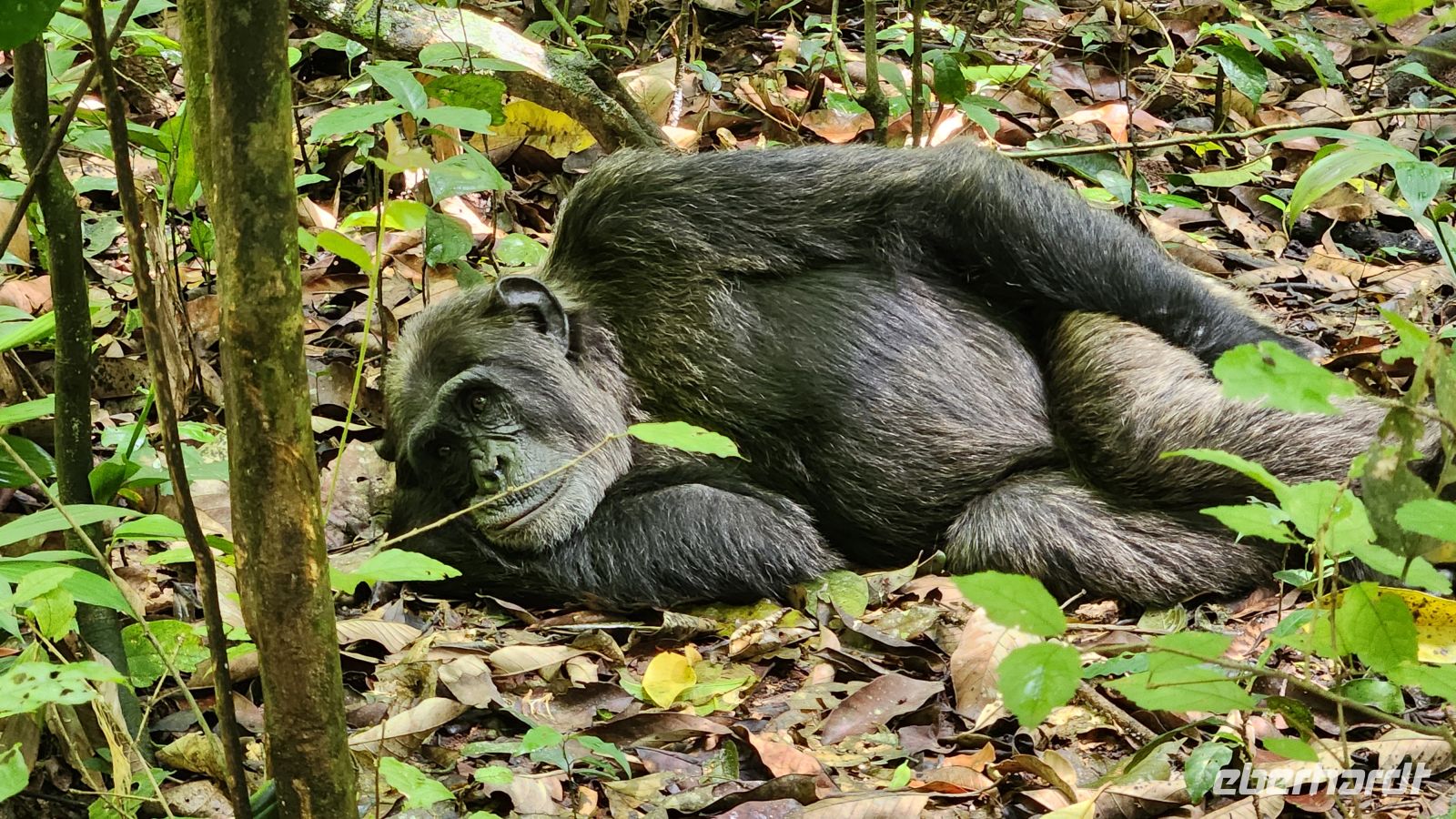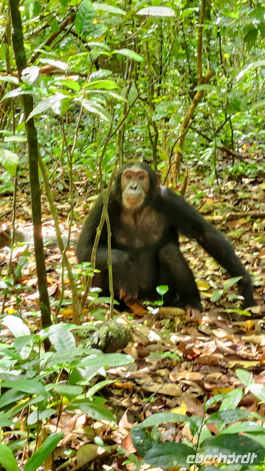 Die nächste Gruppe hält sich ebenfalls überwiegend in den Bäumen auf, nur zwei Schimpansen sind auf dem Waldboden, und wir können ihnen einige Zeit folgen. Fast am Ende unseres Trekkings haben wir dann doch noch das große Glück: mehrere Schimpansen sitzen entspannt auf dem Boden, direkt vor unseren Füßen. Sie laufen umher, legen sich gemütlich hin und scheinen sich überhaupt nicht an unserer Anwesenheit zu stören – sie sind an Touristen gewöhnt. Zum Schutz der Tiere tragen wir selbstverständlich Masken. Die Nähe, die Gelassenheit und die unbeschwerte Art dieser Schimpansen hinterlassen bei uns allen einen tiefen Eindruck.