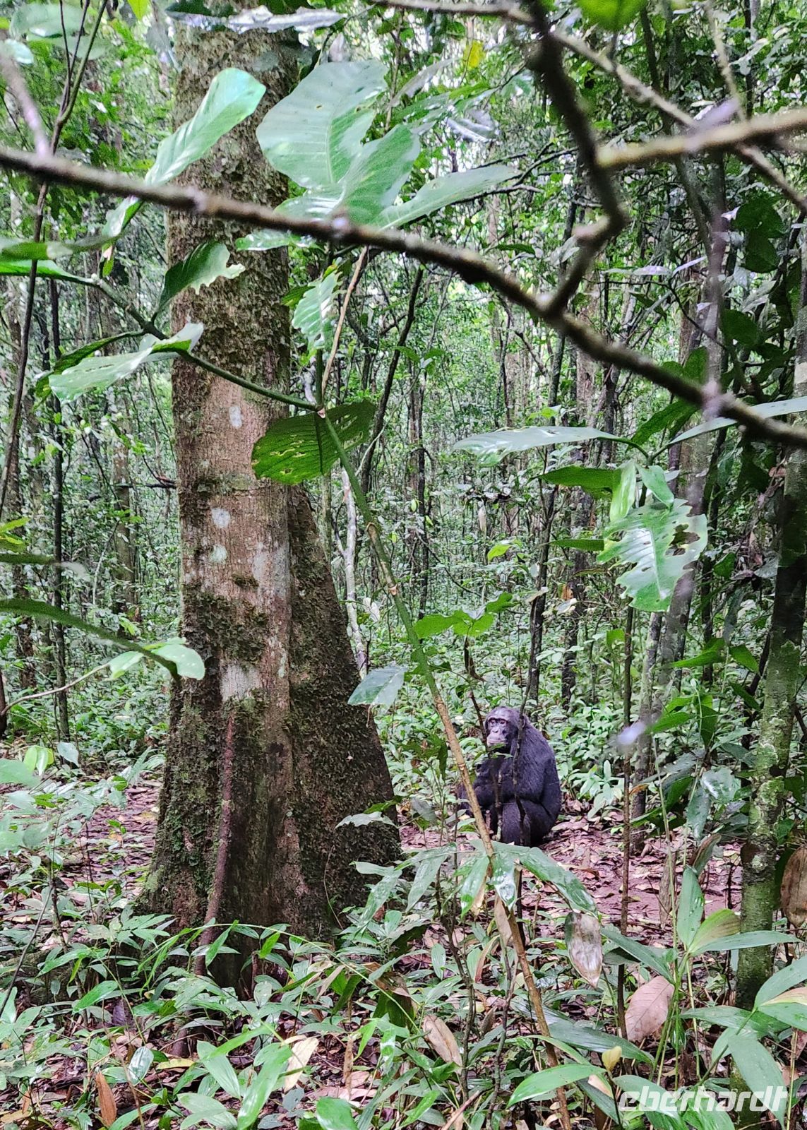 Mit unserem Ranger geht es schließlich durch den dichten Regenwald von Kibale National Park. Hohe Bäume, üppiges Grün und das leise Rascheln der Blätter umgeben uns. Nach einer halben Stunde hören wir die ersten Schimpansen – unverwechselbar ihr lautes Schreien. Schon bald entdecken wir sie in den Baumkronen: ruhend, kletternd, spielend. Wir beobachten diese beeindruckenden Tiere eine Weile, bevor wir uns auf den Weg machen, um noch weitere Gruppen zu finden.