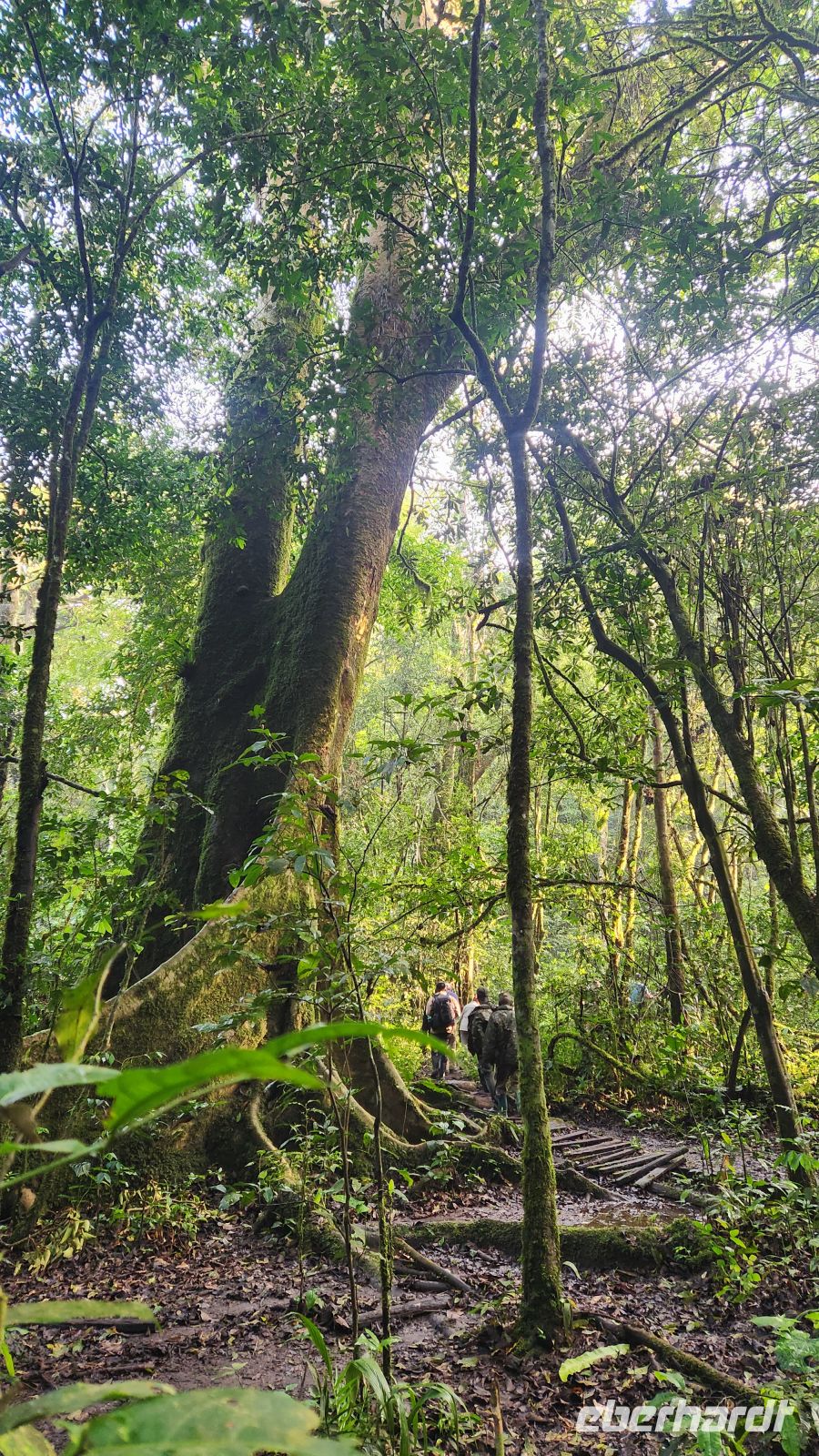 Wir werden der zweitleichtesten Gruppe zugeteilt – das bedeutet etwa drei Stunden Aufstieg durch dichten, teils steilen und rutschigen Regenwald und später rund zwei Stunden Abstieg. Jeder von uns bekommt einen Träger zur Seite gestellt. Er nimmt uns nicht nur den Rucksack ab, sondern reicht uns vor allem immer wieder eine helfende Hand, wenn der Boden matschig oder der Hang besonders steil ist. Ohne diese Unterstützung wäre es deutlich schwieriger.