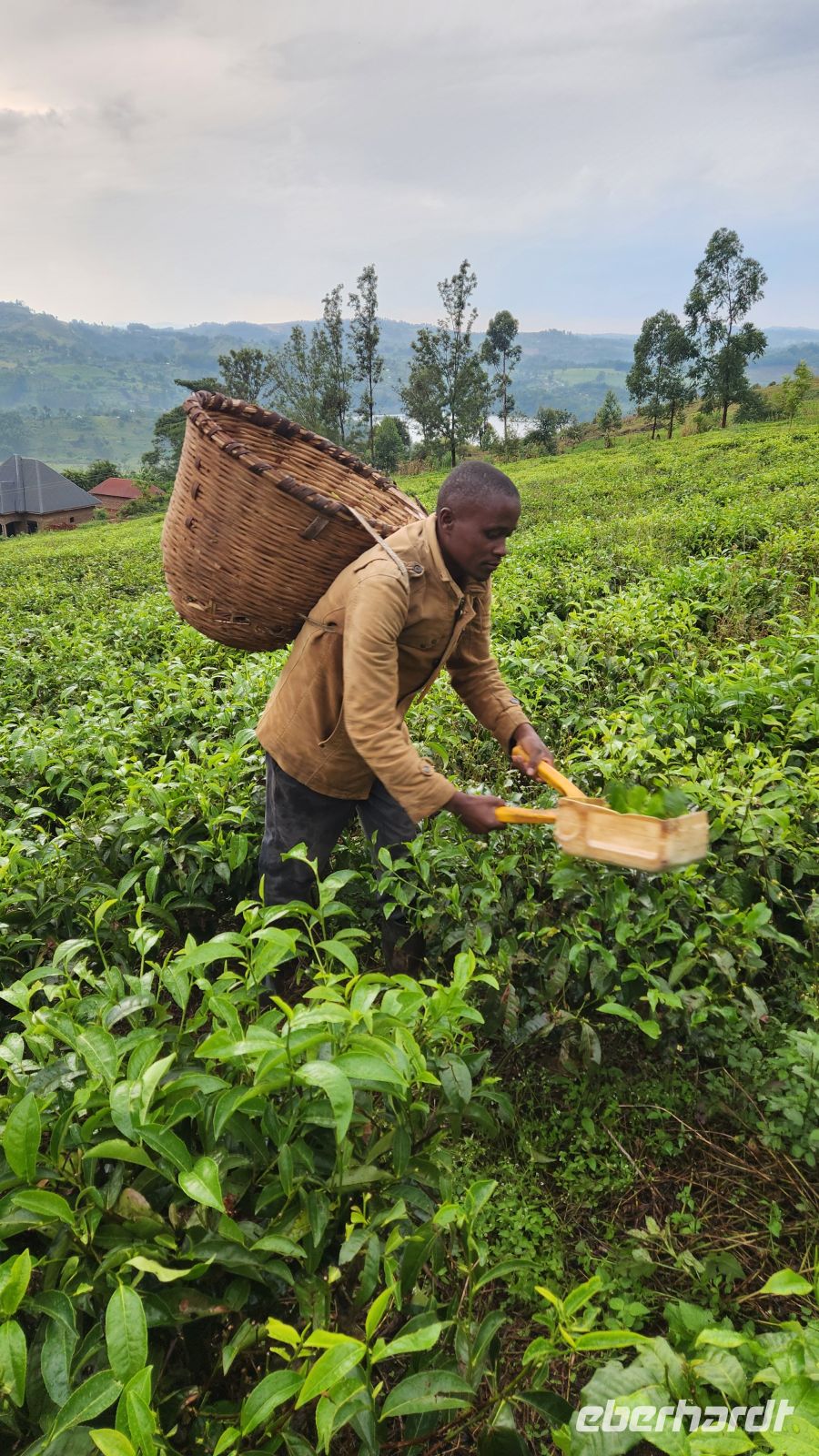 Wir selbst dürfen es ausprobieren: Man bekommt einen Korb und ein kleines Schneidegerät, und vorsichtig pflücken wir die jungen Blätter – ein eindrücklicher Einblick in den Alltag der Plantagenarbeiter.