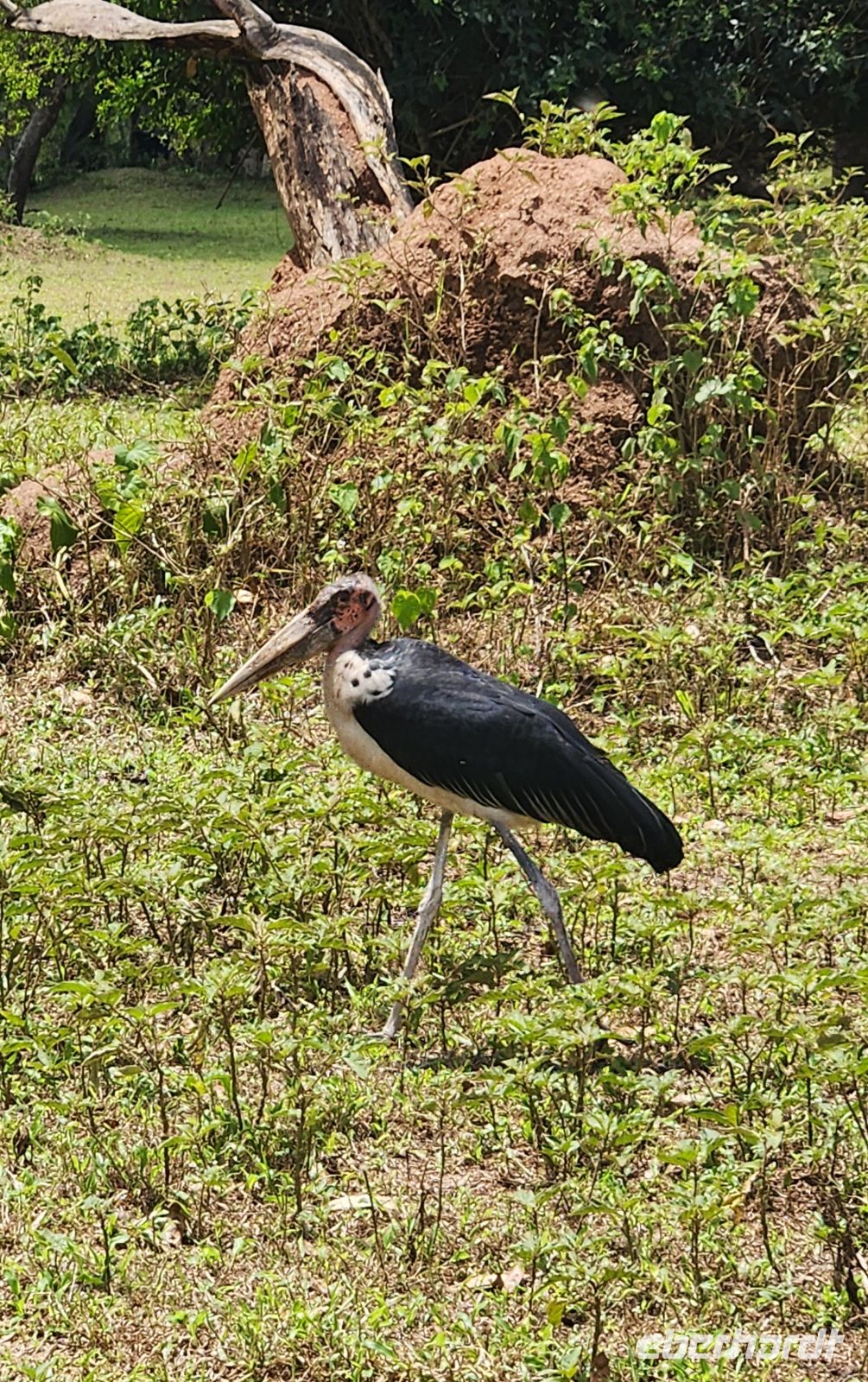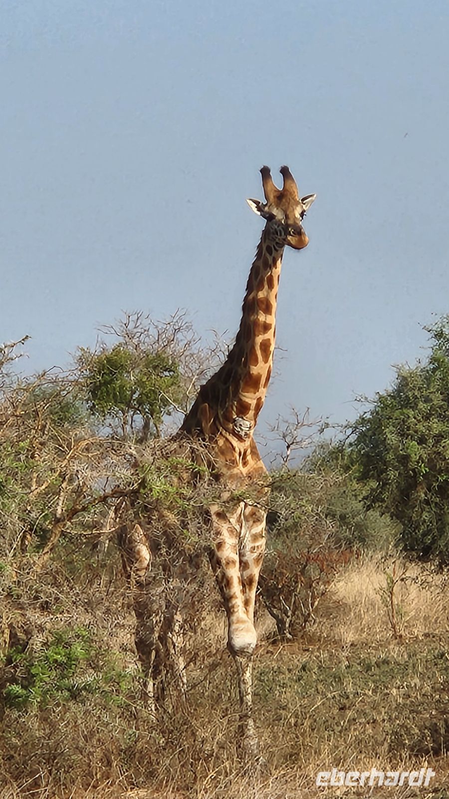 Das Verdeck unseres Jeeps wird geöffnet, sodass wir geschützt stehen und freie Sicht haben. Schon bald entdecken wir Elefanten, Warzenschweine, Wasserböcke, Paviane, Marabus, für eine Sekunde eine Löwendame und Giraffen. Und dann, in weiter Ferne, tatsächlich ein Leopard auf einem Baum – mehr geht kaum für den ersten Safari-Tag.
