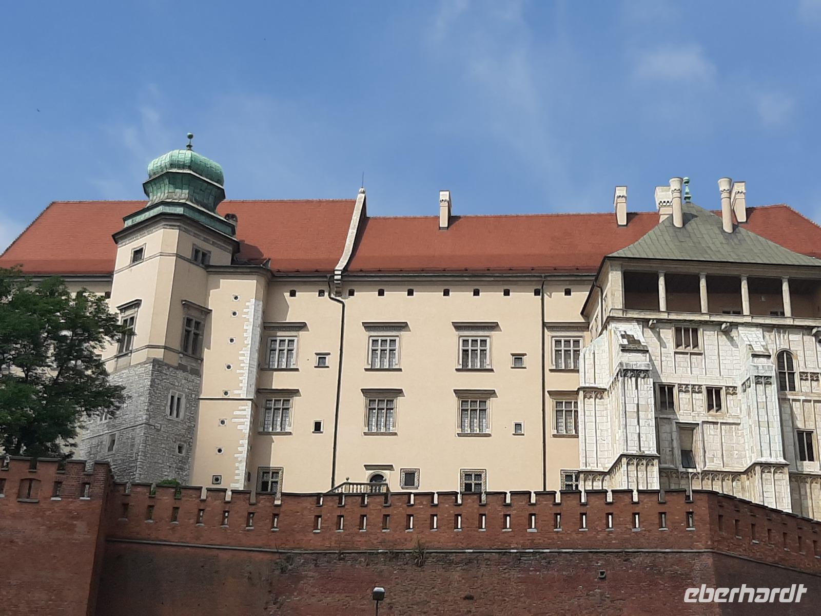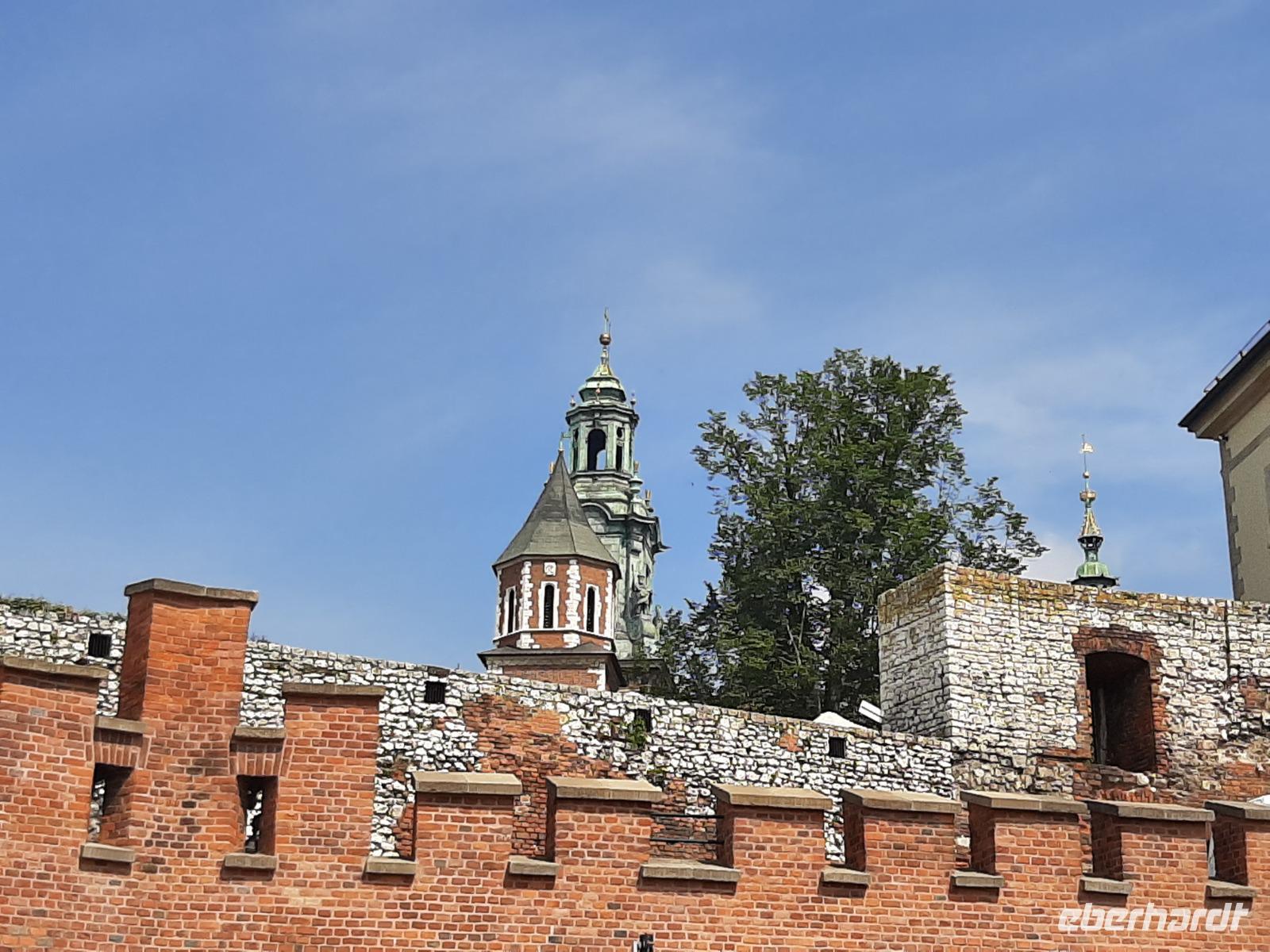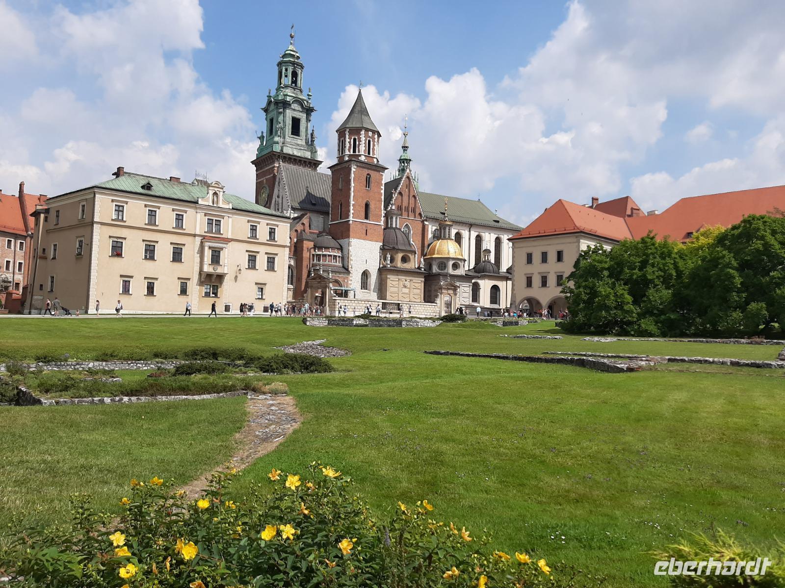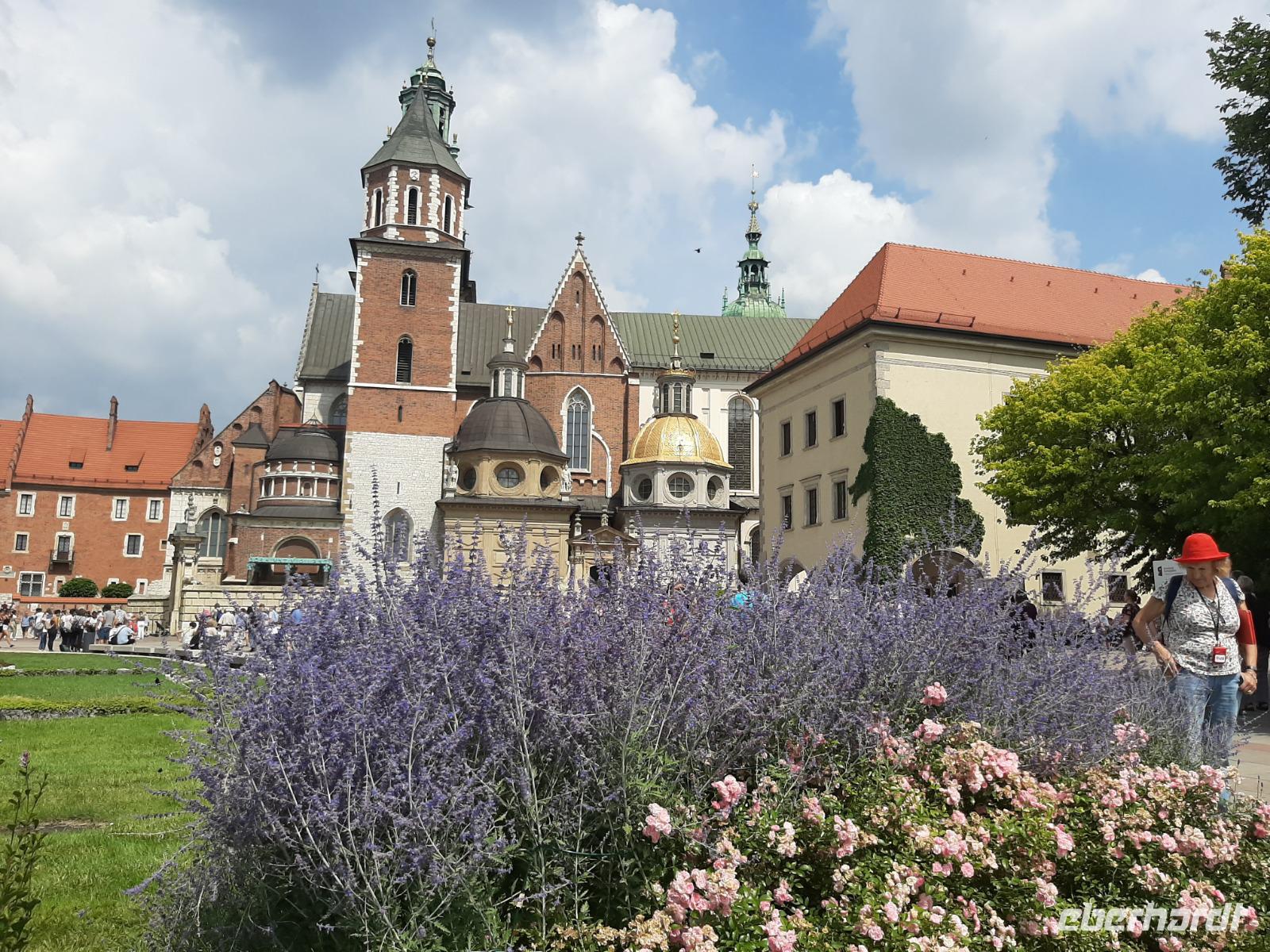 In Krakau hatte es heute nach Tagen starker Hitze unwetterartig geregnet. Als wir am Nachmittag auf dem Flughafen Johannes Paul II., dem zweitgrößten Polens, landen, steht noch überall die Nässe. Der Krakauer Artur Grzybowski heißt uns herzlich willkommen; er wird unser örtlicher Reiseleiter für die Tage in Polen sein. Der Flughafen befindet sich etwa 10 km westlich des Stadtzentrums von Krakau. Somit dauert die Fahrt mit dem komfortablen Kleinbus zu unserem Hotel „Wyspianski" nicht lang. Bei der Fahrt gibt Artur erste Erläuterungen zur Stadt und wir sehen bereits die unterschiedlich hohen Türme der Marienkirche, die das Stadtbild prägen. Wir checken ein und beziehen unsere Zimmer. Bald danach schon treffen wir uns zum ersten gemeinsamen Abendessen., welches kulturell künstlerisch umrahmt wird. Die gebürtige Ukrainerin Zoriana Grzybowska hat Gesang studiert und spielt auf der Bandura, dem alten ukrainischen Instrument, klassiche und volkstümliche Musik und singt dazu. So geht der Anreisetag, der ja meist auch mehr oder weniger anstrengend ist, kulturell sehr anspruchsvoll und entspannend zu Ende.