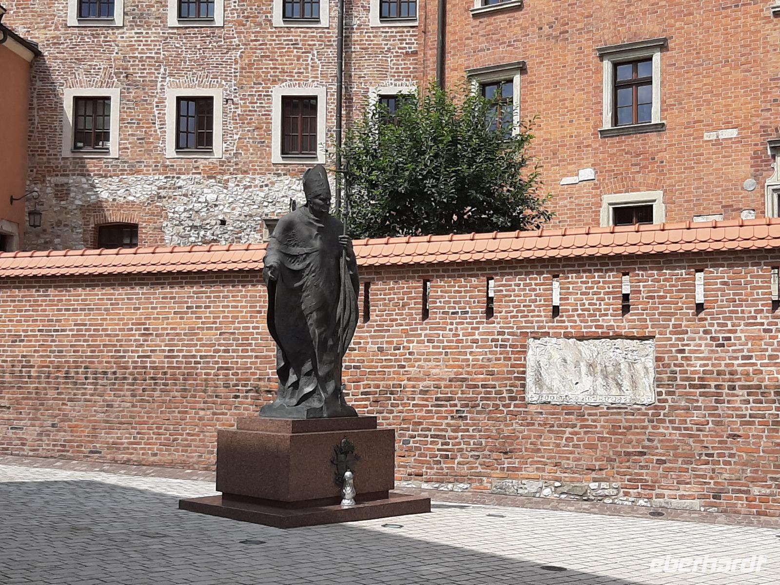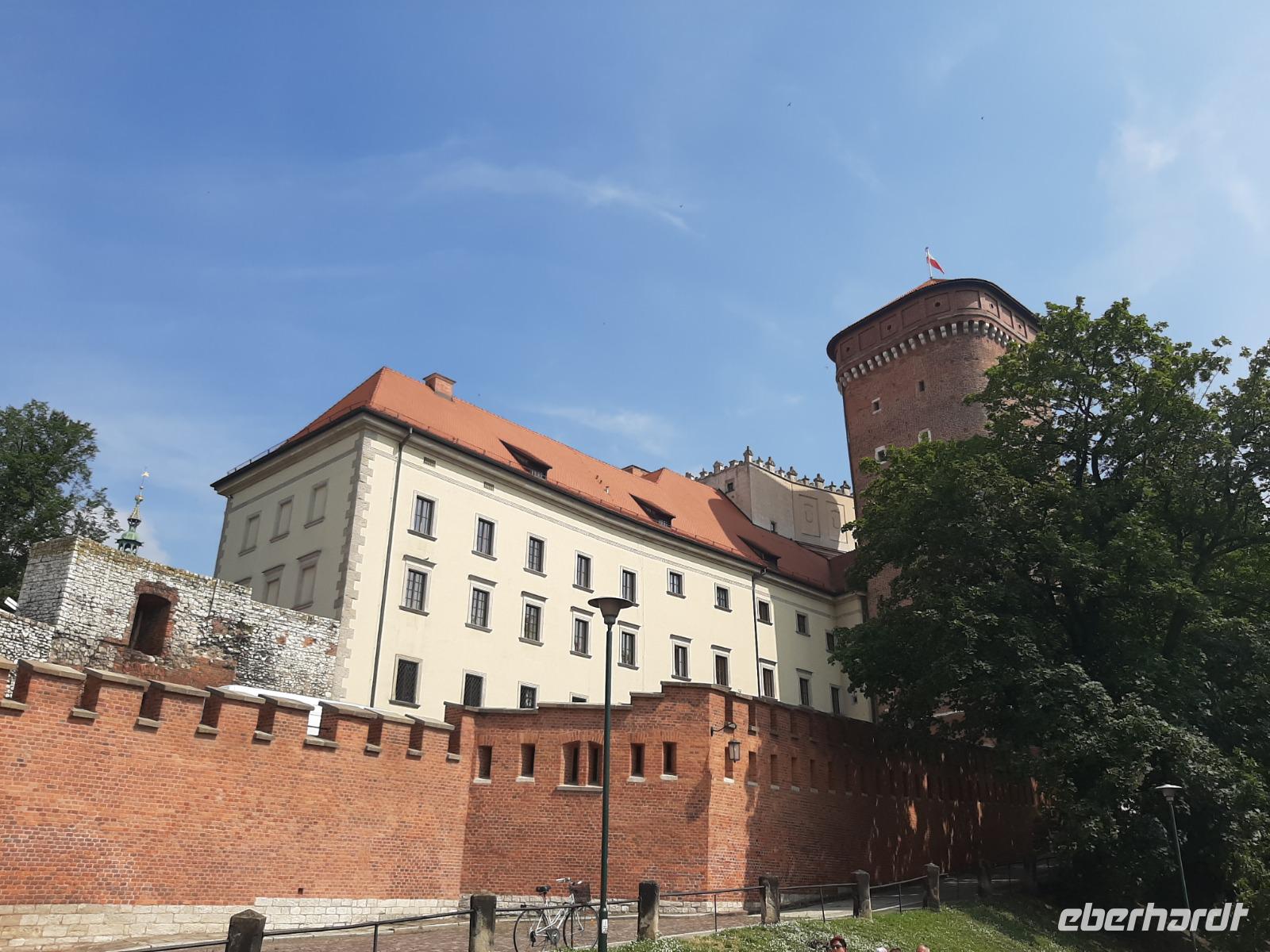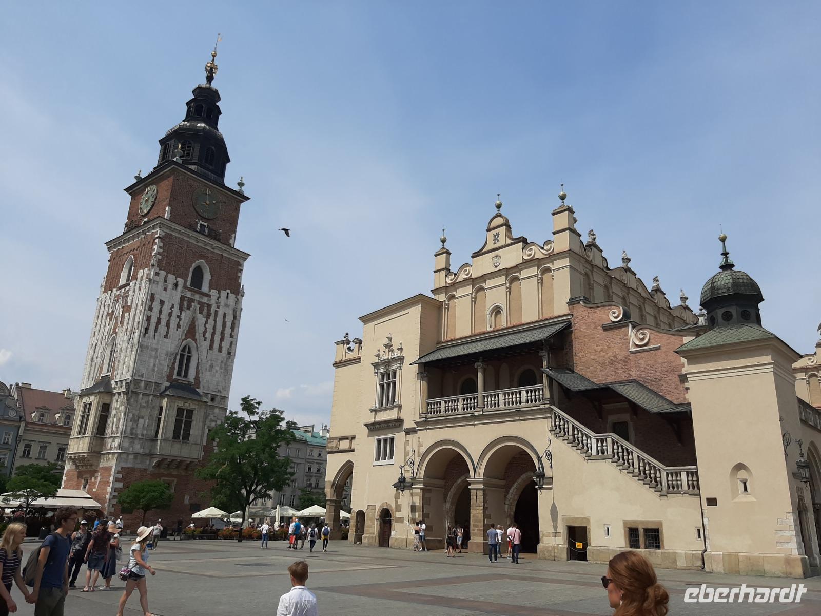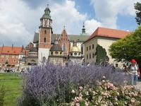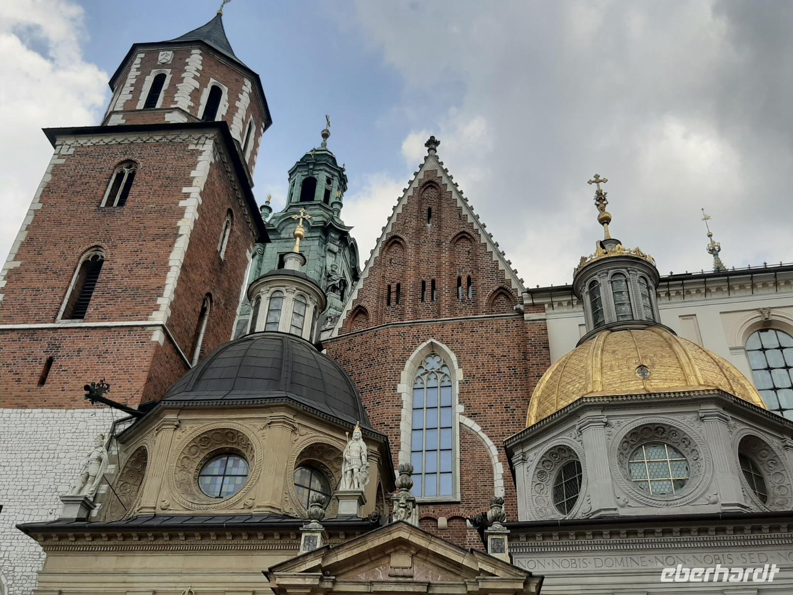 In Krakau hatte es heute nach Tagen starker Hitze unwetterartig geregnet. Als wir am Nachmittag auf dem Flughafen Johannes Paul II., dem zweitgrößten Polens, landen, steht noch überall die Nässe. Der Krakauer Artur Grzybowski heißt uns herzlich willkommen; er wird unser örtlicher Reiseleiter für die Tage in Polen sein. Der Flughafen befindet sich etwa 10 km westlich des Stadtzentrums von Krakau. Somit dauert die Fahrt mit dem komfortablen Kleinbus zu unserem Hotel „Wyspianski" nicht lang. Bei der Fahrt gibt Artur erste Erläuterungen zur Stadt und wir sehen bereits die unterschiedlich hohen Türme der Marienkirche, die das Stadtbild prägen. Wir checken ein und beziehen unsere Zimmer. Bald danach schon treffen wir uns zum ersten gemeinsamen Abendessen., welches kulturell künstlerisch umrahmt wird. Die gebürtige Ukrainerin Zoriana Grzybowska hat Gesang studiert und spielt auf der Bandura, dem alten ukrainischen Instrument, klassiche und volkstümliche Musik und singt dazu. So geht der Anreisetag, der ja meist auch mehr oder weniger anstrengend ist, kulturell sehr anspruchsvoll und entspannend zu Ende.