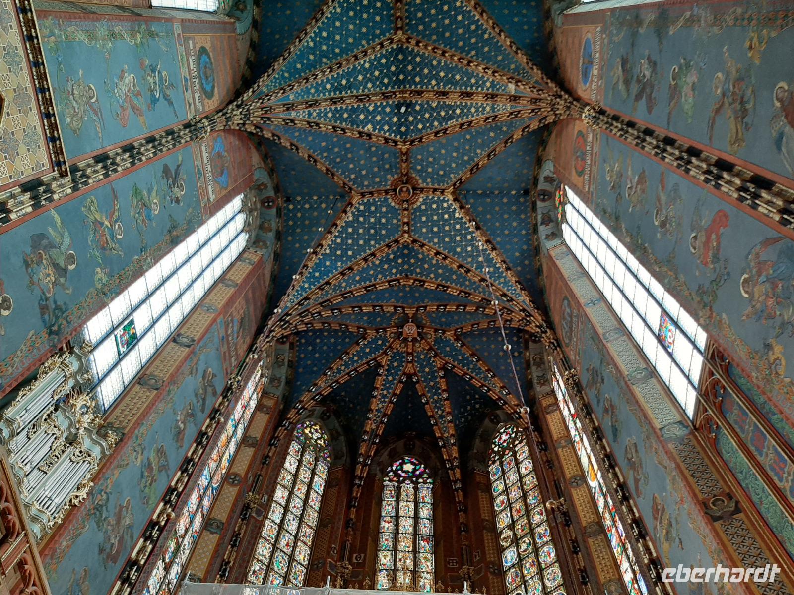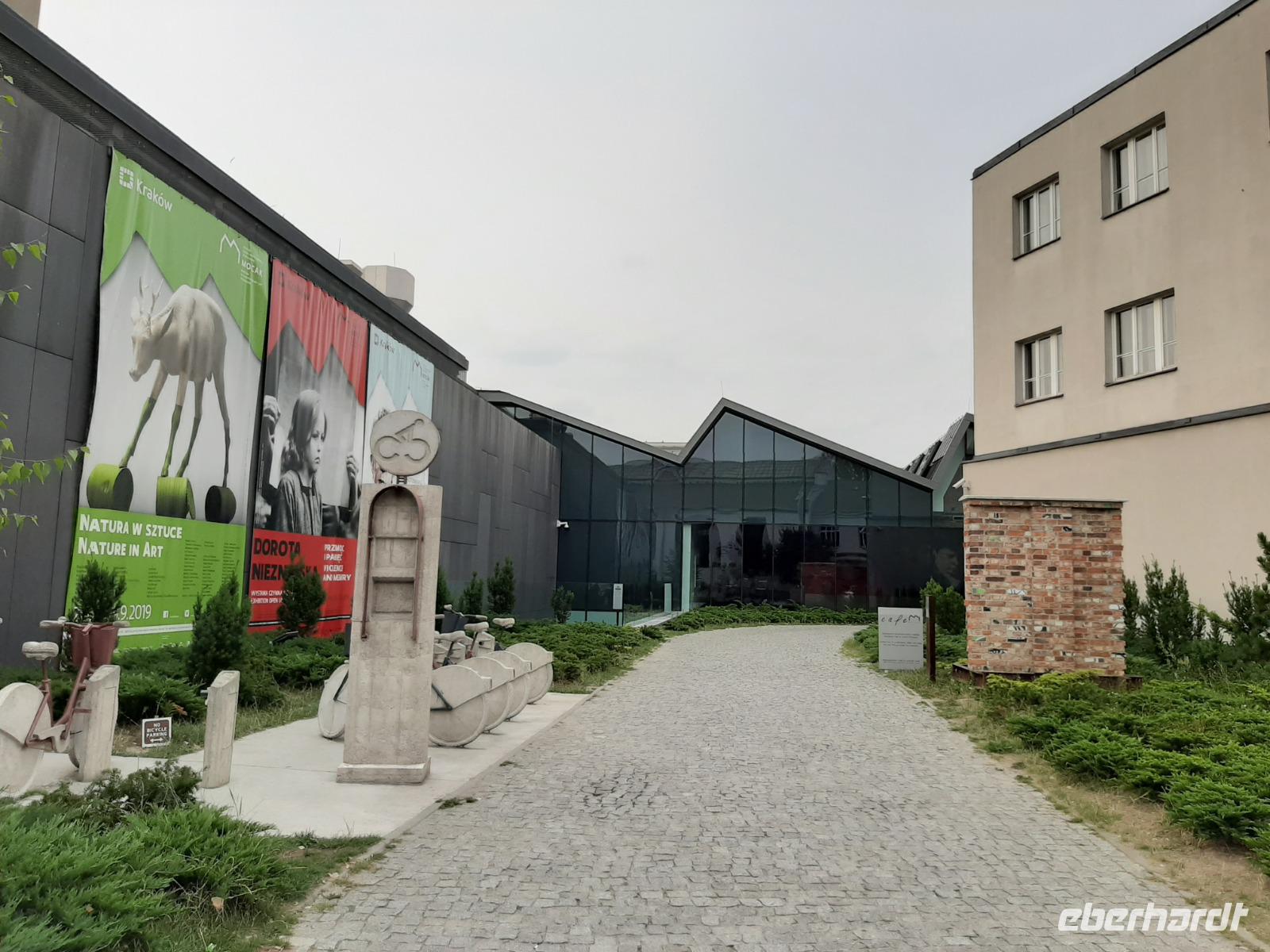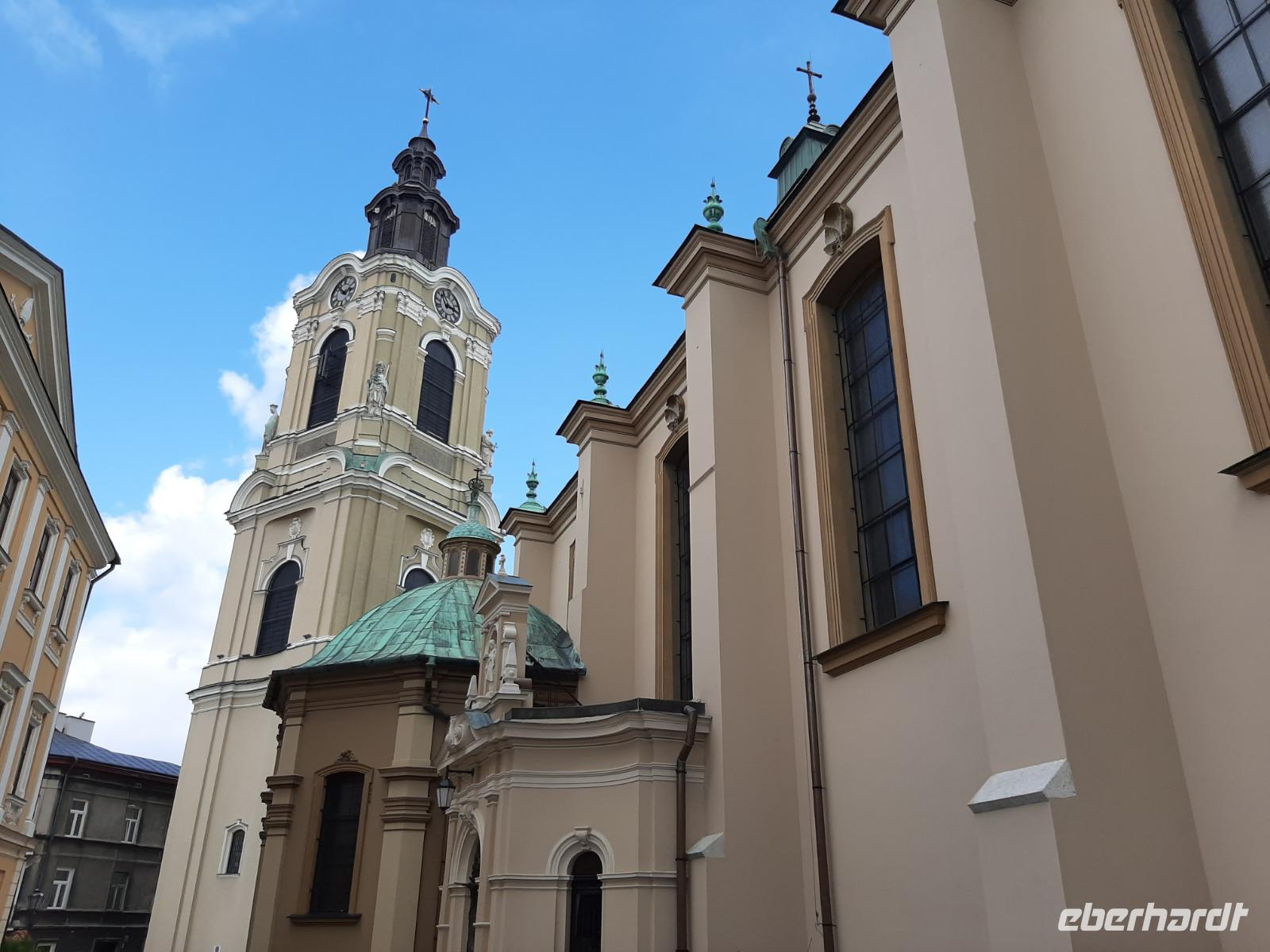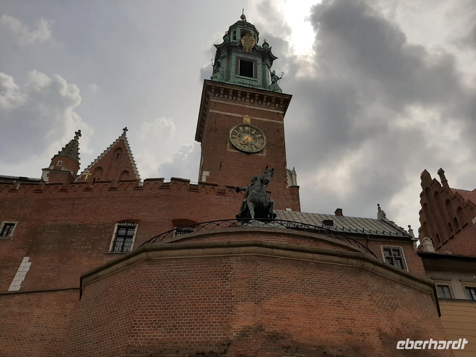 In Krakau hatte es heute nach Tagen starker Hitze unwetterartig geregnet. Als wir am Nachmittag auf dem Flughafen Johannes Paul II., dem zweitgrößten Polens, landen, steht noch überall die Nässe. Der Krakauer Artur Grzybowski heißt uns herzlich willkommen; er wird unser örtlicher Reiseleiter für die Tage in Polen sein. Der Flughafen befindet sich etwa 10 km westlich des Stadtzentrums von Krakau. Somit dauert die Fahrt mit dem komfortablen Kleinbus zu unserem Hotel „Wyspianski" nicht lang. Bei der Fahrt gibt Artur erste Erläuterungen zur Stadt und wir sehen bereits die unterschiedlich hohen Türme der Marienkirche, die das Stadtbild prägen. Wir checken ein und beziehen unsere Zimmer. Bald danach schon treffen wir uns zum ersten gemeinsamen Abendessen., welches kulturell künstlerisch umrahmt wird. Die gebürtige Ukrainerin Zoriana Grzybowska hat Gesang studiert und spielt auf der Bandura, dem alten ukrainischen Instrument, klassiche und volkstümliche Musik und singt dazu. So geht der Anreisetag, der ja meist auch mehr oder weniger anstrengend ist, kulturell sehr anspruchsvoll und entspannend zu Ende.