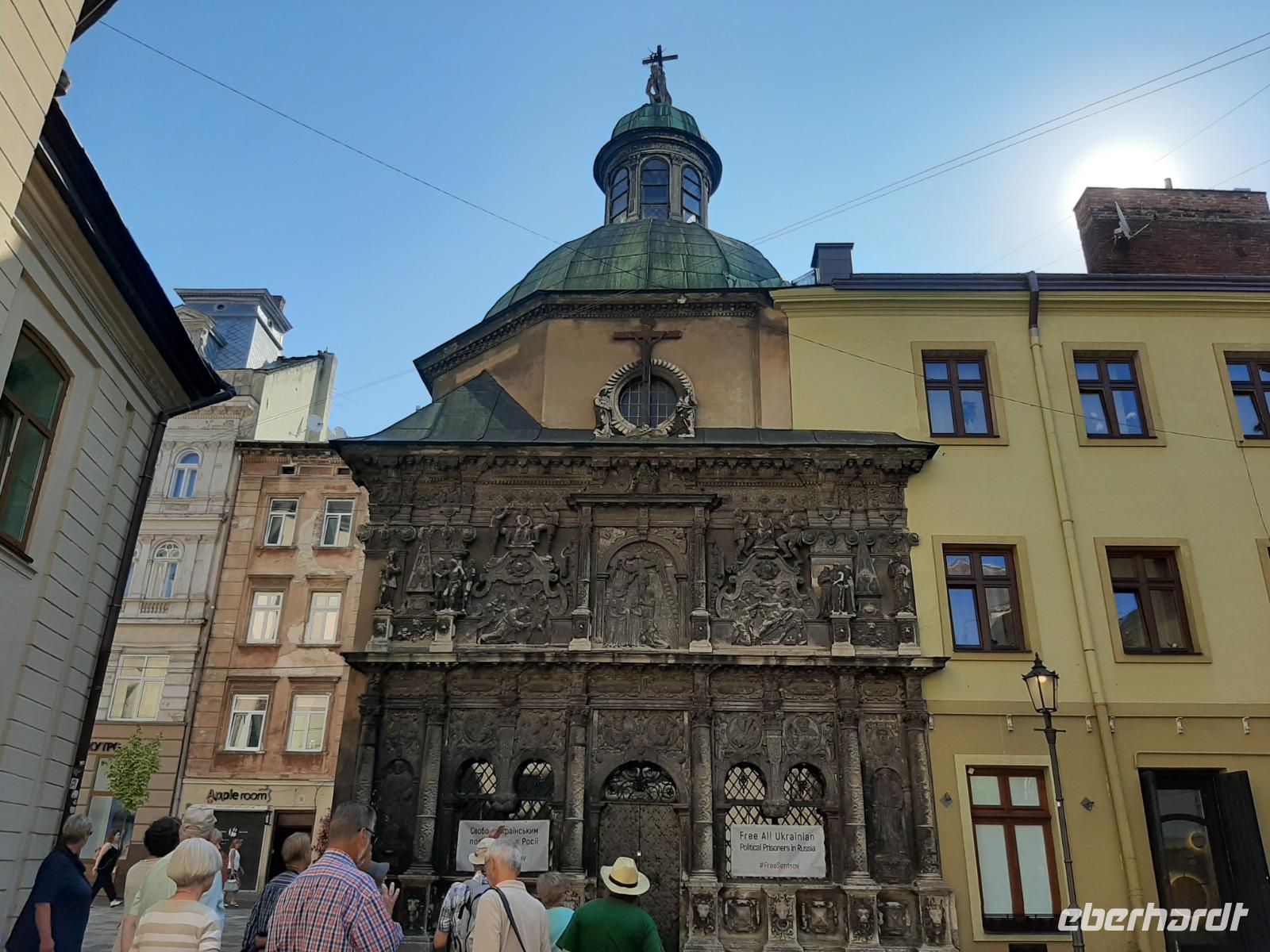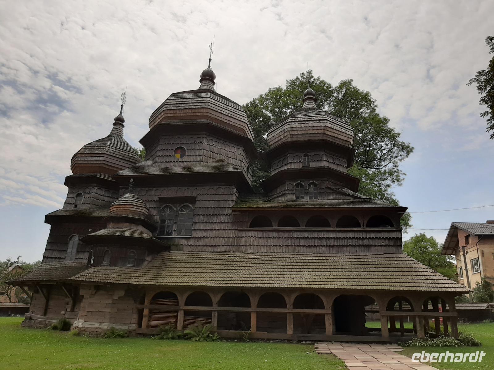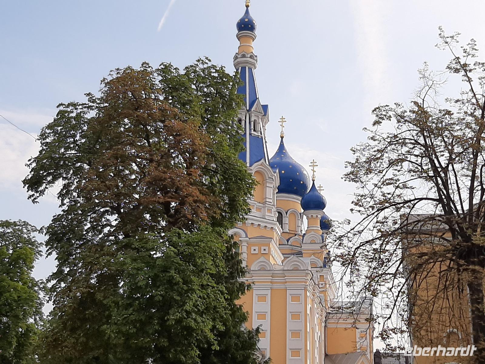 Waren wir gestern ausschließlich in Lemberg unterwegs, fahren wir heute über Land in nordwestliche Richtung, stadtauswärts zunächst durch das Gebiet des ehemaligen Ghettos und vorbei am Mahnmal für die Opfer der Nazizeit. Unser Ziel ist das etwa dreißig Kilometer entfernte Zhowkwa. Einst war das kleine Städtchen eine sogenannten Adelsstadt, das sich getreu des idealen Musters italienischer Städte entwickelte. Die Hälfte der Einwohner vor dem Krieg war jüdisch. Nachdem die Stadt im Krieg weitgehend zerstört worden war, entwickelte sich Zhowkwa zu Sowjetzeiten zu einem bedeutenden Kulturzentrum. Wir besuchen das Schloss-Museum, schlendern über den weiträumigen Marktpkatz , besuchen die Ruine der Synagoge, statten dem belebten Wochenmarkt, auf dem gerade reges Treiben herrscht, einen Besuch ab und besichtigen die Griechisch-Katholische Kirche. Zur späten Mittagszeit zurück in Lemberg verbringen wir in der Stadt unsere Mittagspause und nutzen den Nachmittag für eigene Unternehmungen. Es sei denn, man nimmt am fakultativen Stadtrundgang zum Thema „Jugenstilgebäude in Lemberg", den Dima anbietet, teil. Das Abendessen wird heute in einem Restaurant aus östereichischer Zeit gereicht. Die Atmosphäre ist gediegen mit entsprechender musikalischer Unterhaltung durch Geige und Klavier. Bekannte und unbekannte Melodien, meisterhaft dargeboten, schaffen eine schöne Stimmung und runden den Tag angenehm ab.