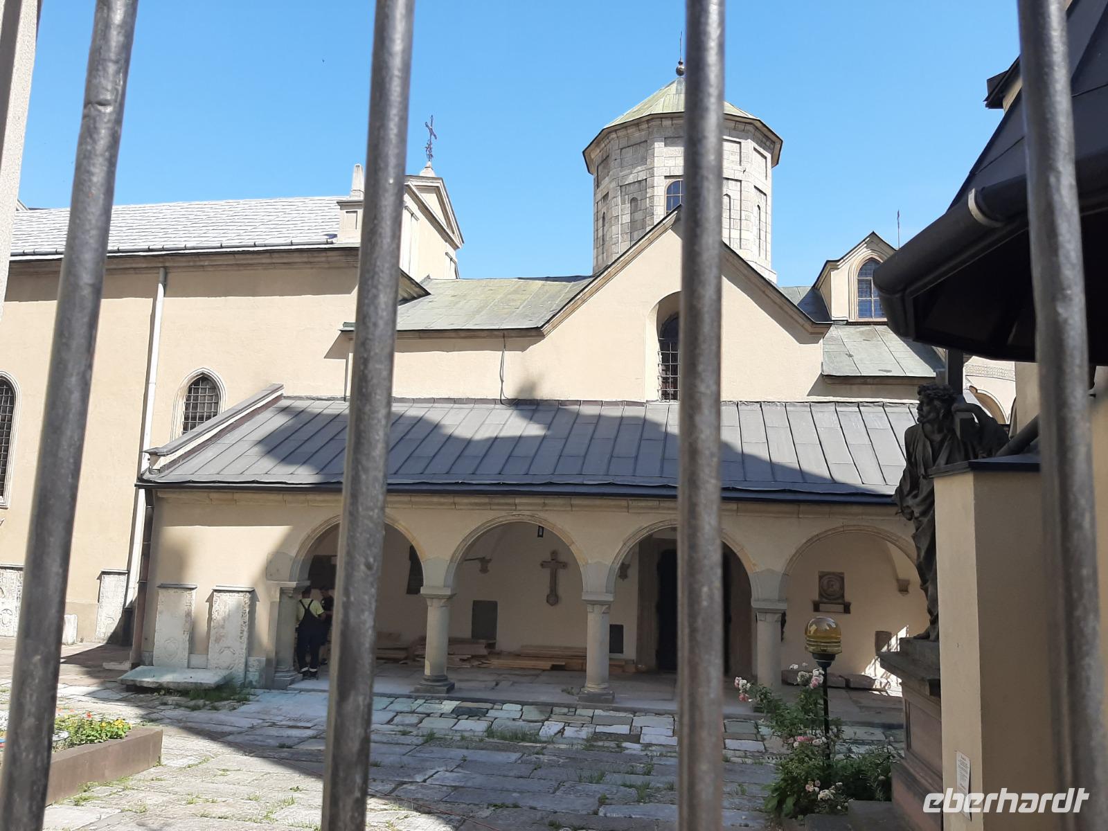 Der vierte Tag unserer Reise ist angebrochen, am Nachmittag werden wir in die Ukraine weiterreisen. Das Wetter ist reisefreundlich, es sollen etwa 24 Grad werden. Vorerst aber steht noch Interessantes hier in Polen an. Nur eine kurze Fahrt und wir kommen an am Schloss Lancut, einer der bekanntesten ehemals aristokratischen Residenzen im Land. Das Schloss war über die Jahrhunderte im Besitz verschiedener Adliger und hatte bekannte Persönlichkeiten zu Gast. Es begrüßt uns eine freundliche Gästeführerin zu einer eineinhalbstündigen Führung durch das Schloss mit seinen überaus bemerkenswerten Innenräumen. Danach setzen wir die Fahrt fort in Richtung Przemysl, fahren somit in den äußersten Südosten Polens. In den letzten Jahrzehnten vor dem Ersten Weltkrieg wurde die ganze Stadt zu einer Festung ausgebaut. Reste der ringförmigen Verteidigungsnalagen sind noch erhalten und gelten heute als Kulturerbe. Wir besichtigen das ehemalige Fort XIII, bevor wir in die Stadt fahren. Nach einer Mittagspause wollen wir den Ort zu Fuß erkunden. Zuerst geht es hinauf zu den Resten der Burganlage auf dem Schlossberg. Von der Aussichtsterasse des Schlossberges eröffnet sich ein bezaubernder Blick in Richtung der Waldkarpaten. Auch besichtigen wir die Domkirche d. Hl. Johannes und die Griechich-Katholische Kirche. Am Nachmittag verabschieden wir uns von Artur und werden von Dimitri Budov freundlich begrüßt. Er stellt sich vor als: „Dima, Ihr bärtiger Reiseleiter in der Ukraine". Wiederum in einem modernen Kleinbus fahren wir nun zur polnisch-ukrainischen Staatsgrenze. Die Formalitäten am späten Nachmittag dauern nicht allzu lange, wir tauschen an der ersten Tankstelle Geld und weiter geht es in Richtung Lemberg. Gleich plaudert Dima los, erzählt von seiner fruchtbaren Heimat und von Lemberg, einer der meistbesuchten Städte der Ukraine. Am Abend checken wir ein in das Hotel „Reikartz Medival Lviv", direkt in der Altstadt gelegen, in welchem wir für vier Nächte bleiben werden. Hier treffen wir auch die 8 Gäste, die heute in Lemberg angekommen sind. Gleich beim Abendessen machen wir uns bekannt, kommen ins Gespräch und freuen uns auf die weitere gemeinsame Reise in der Ukraine und in Weißrussland.