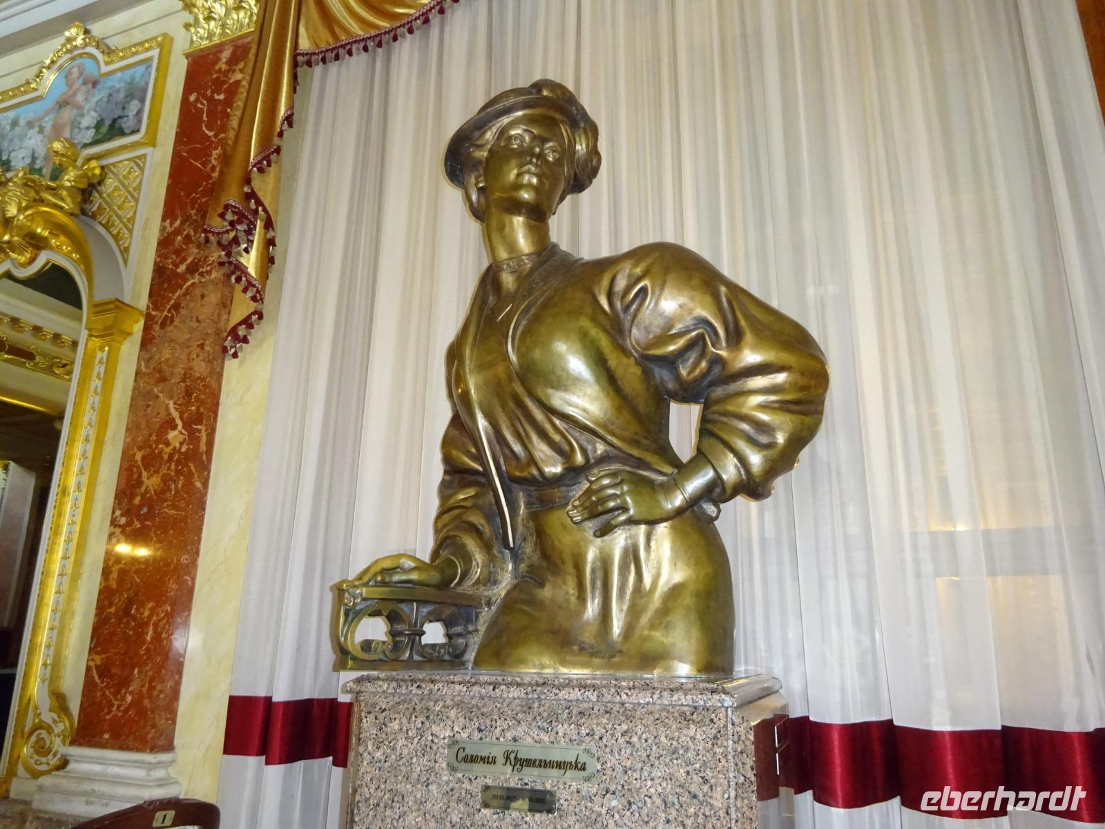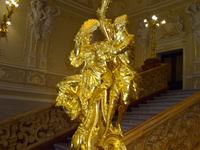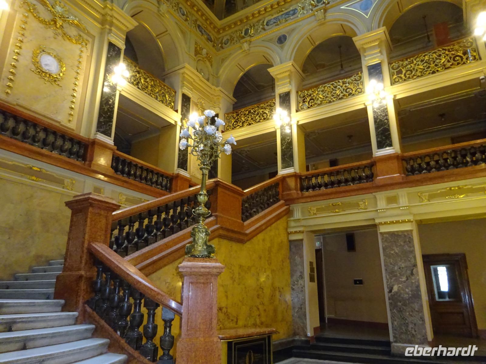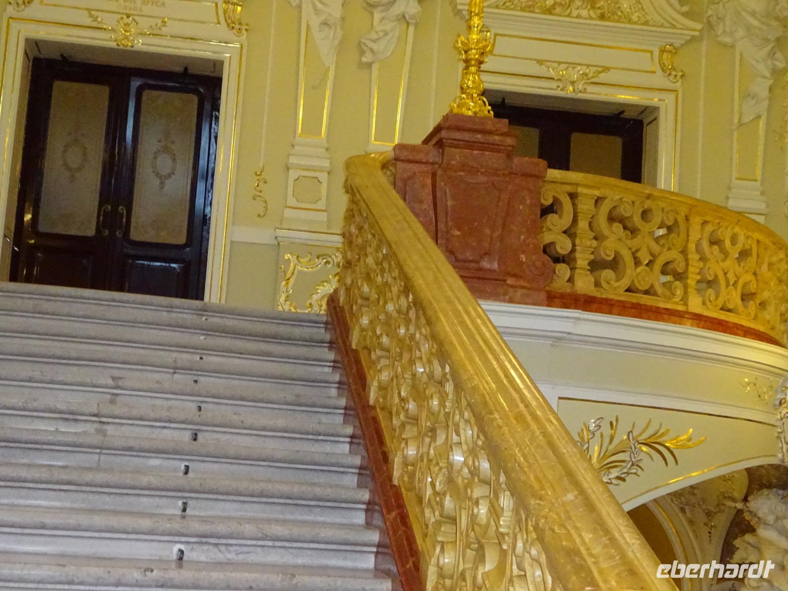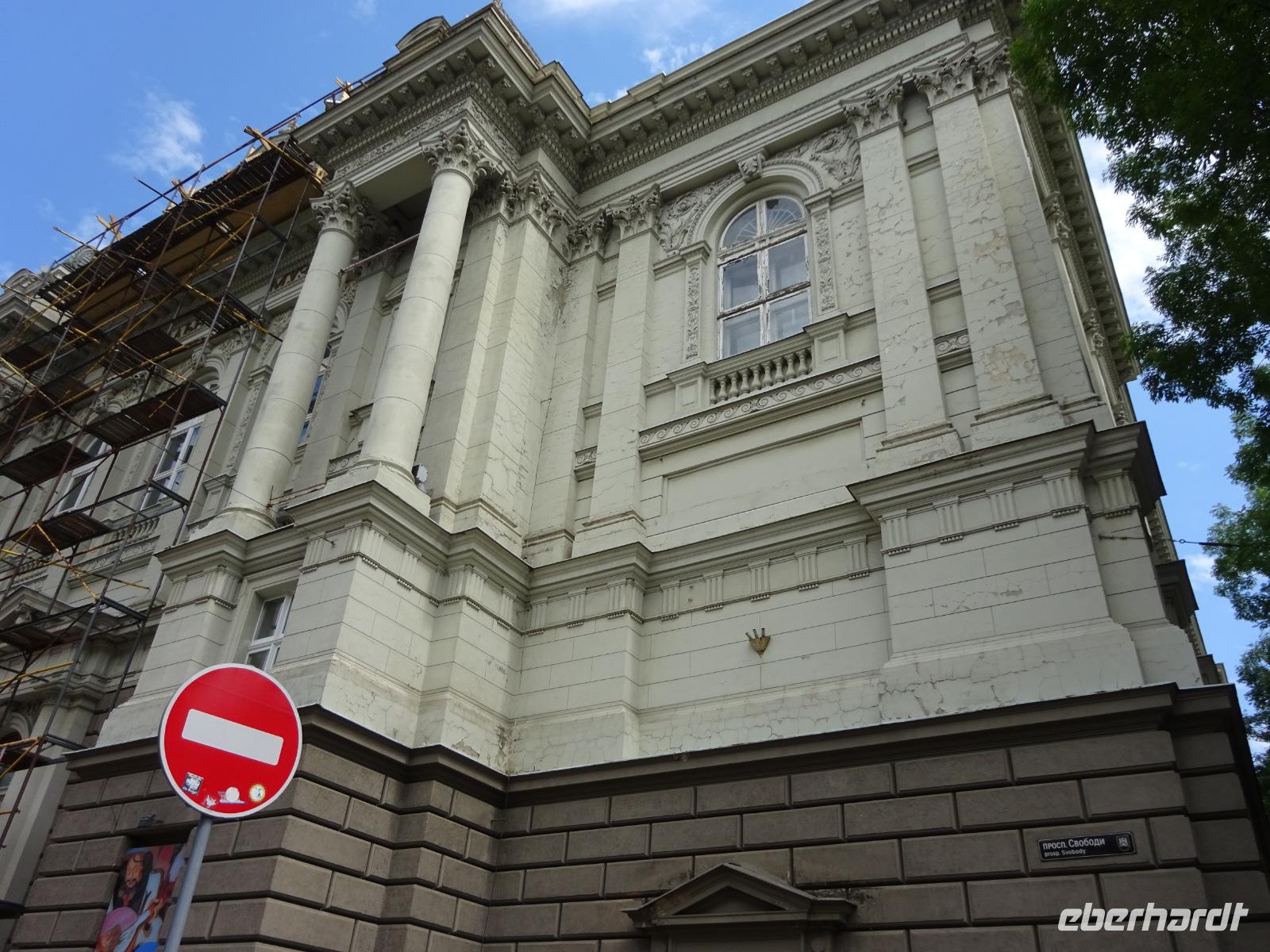 Anschließend gehen wir zum berühmten Opernhaus, wo wir von Uljana ebenfalls eine Menge erfahren, das einzigartige Treppenhaus und einen kleinen Saal sehen und bewundern können. Im großen Saal finden gerade Renovierungsarbeiten statt, die ab und zu sein müssen, und für die nur in der Spielzeitpause im Sommer Gelegenheit ist. Und einen kleinen Abstecher ins Nationalmuseum, das eine wertvolle Ikonensammlung beherbergt, schaffen wir auch noch. Uljana weiß einfach über alles sehr gut Bescheid und führt uns auch durch Teile dieser Sammlung.