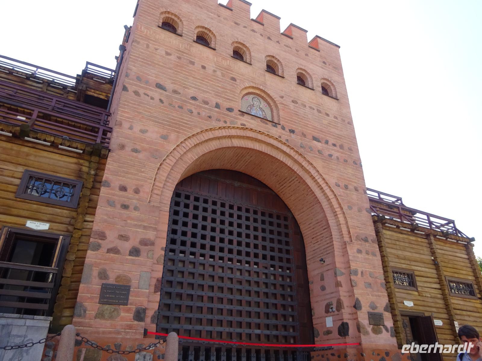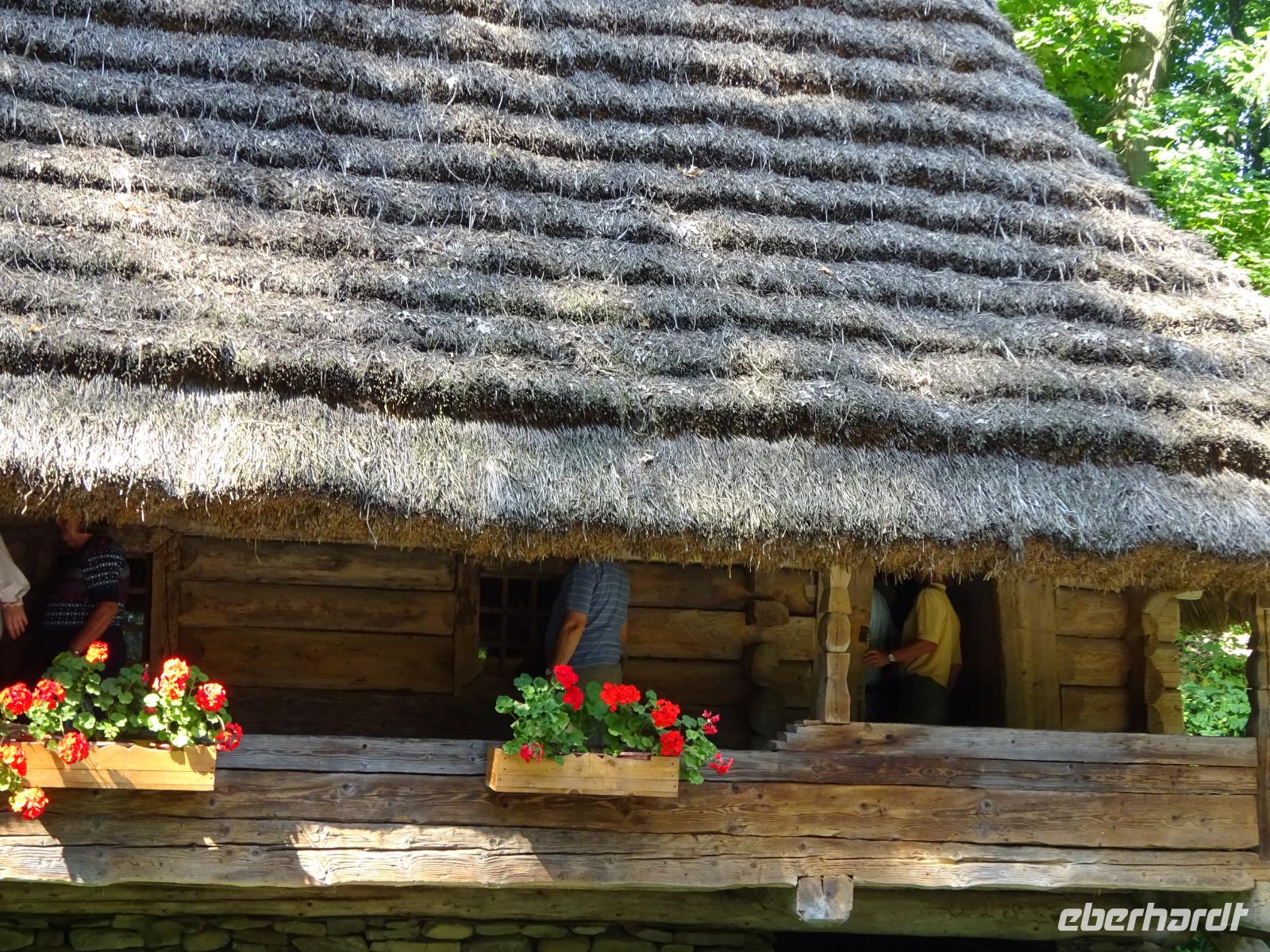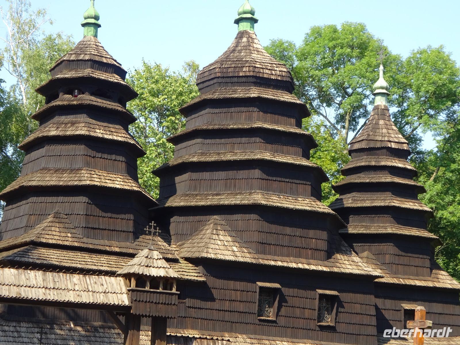 Nach einer kleinen Mittagspause in der Stadt, schließlich muss auch der eifrigste Tourist etwas essen und trinken, folgt unser Nachmittagsprogramm: Ein Besuch im Freilichtmuseum Schewtschenko [ukrainisch Ševcenko]-Hain, wo die Beispiele historischer Holzarchitektur aus dem gesamten Westen der heutigen Ukraine zusammengetragen sind. Zahlreiche Schautafeln erläutern alles. Und heute ist hier ordentlich Betrieb, denn es ist Sonntag. Da kommen viele Familien hierher. Eltern und Großeltern erläutern Kindern die Geschichte des dörflichen Lebens in verschiedenen Regionen der heutigen Ukraine. Das verfolgen auch wir mit Interesse.
