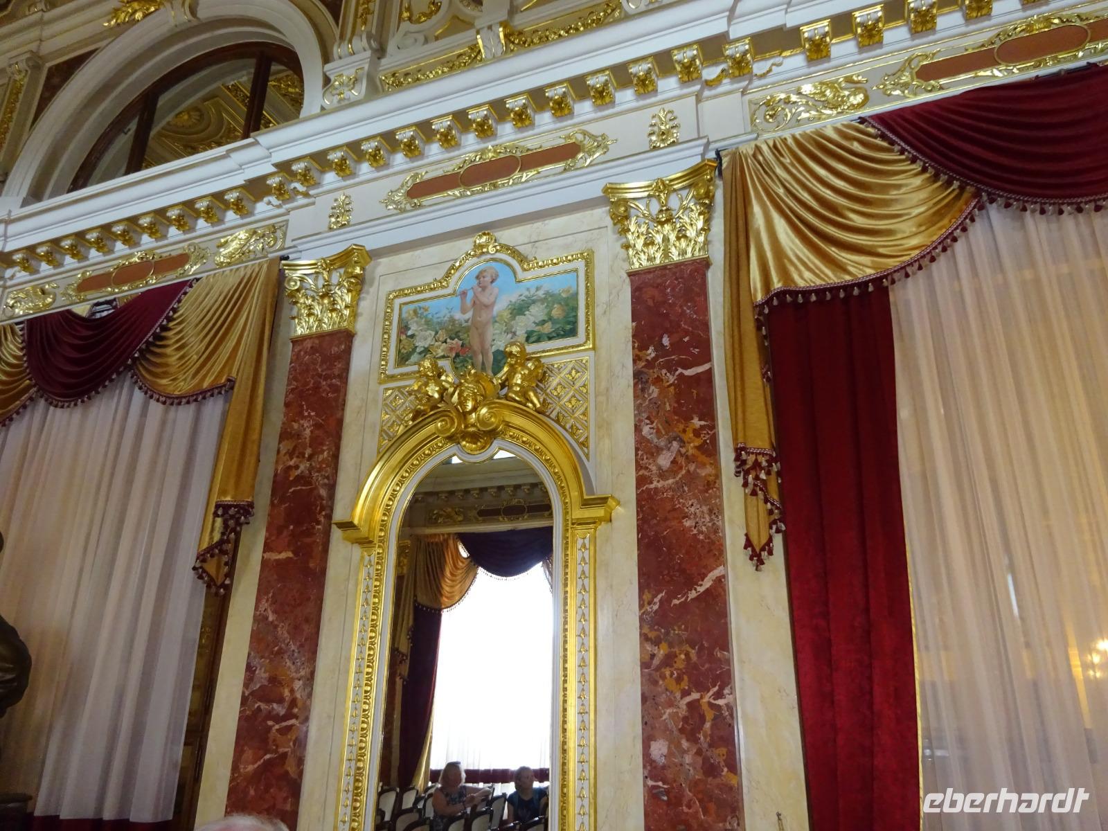 Stas nutzte die Tour für weitere Ausführungen zu Geschichte und Gegenwart. Wieder zurück in Odessa, strebten wir auf den wohl berühmtesten Markt der Ukraine, den „Privoz-Bauernmarkt". Er existiert seit 1827 und zählt zu den großen Sehenswürdigkeiten der Stadt. Alles kann man verkosten. Da staunten wir nicht schlecht. Wir wollten auch eine Kleinigkeit essen, denn für heute Abend hatten wir mit Hilfe unserer örtlichen Agentur Karten für die berühmte Odessaer Oper bekommen. Wir gehen in in die Oper Carmen von Gorges Bizet, gesungen in französischer Sprache mit ukrainischen Obertiteln, und sehen bei dieser Gelegenheit das einzigartige Gebäude der Oper von innen.