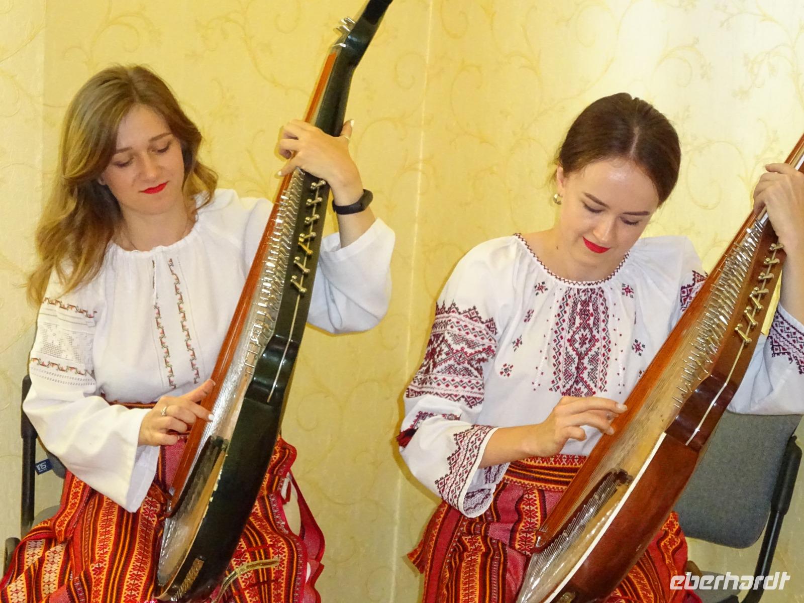 Nun starten wir aber durch nach Vynnyky. Dort empfängt uns ein sehr schönes Musikprogramm. Zwei Meisterinnen ihres Faches spielen auf der Bandura und singen wunderbar dazu. Wir selbst sind während dieser Zeit künstlerisch tätig und versuchen uns als Glasmaler, durchaus mit Erfolg.