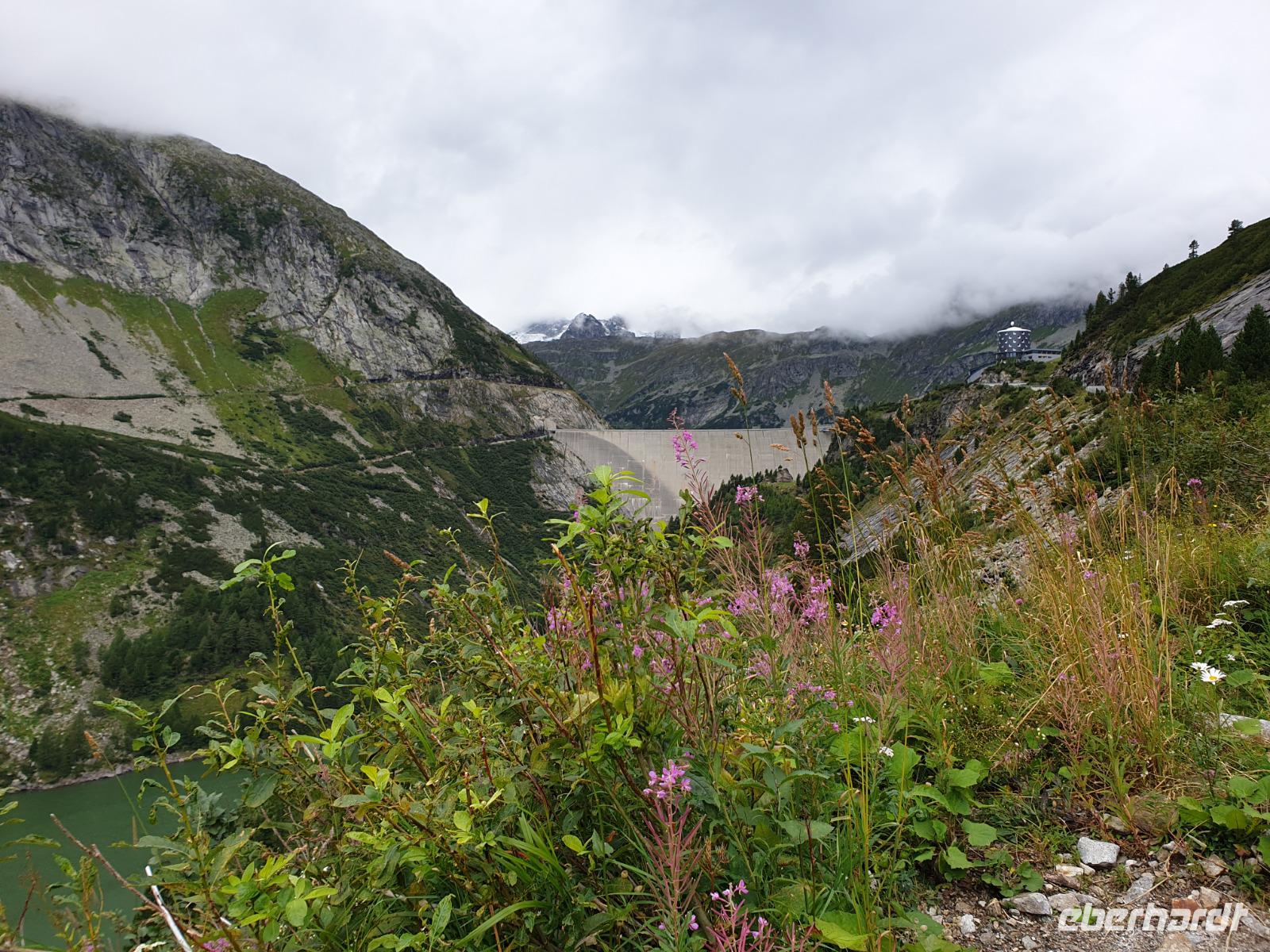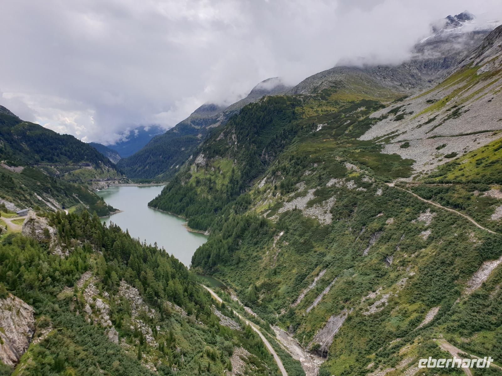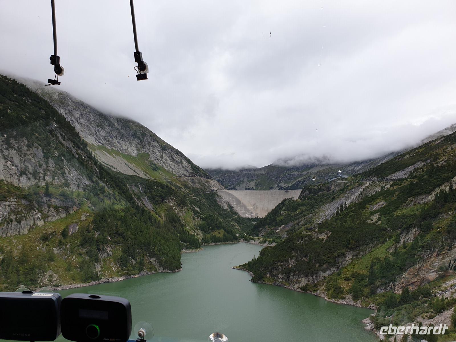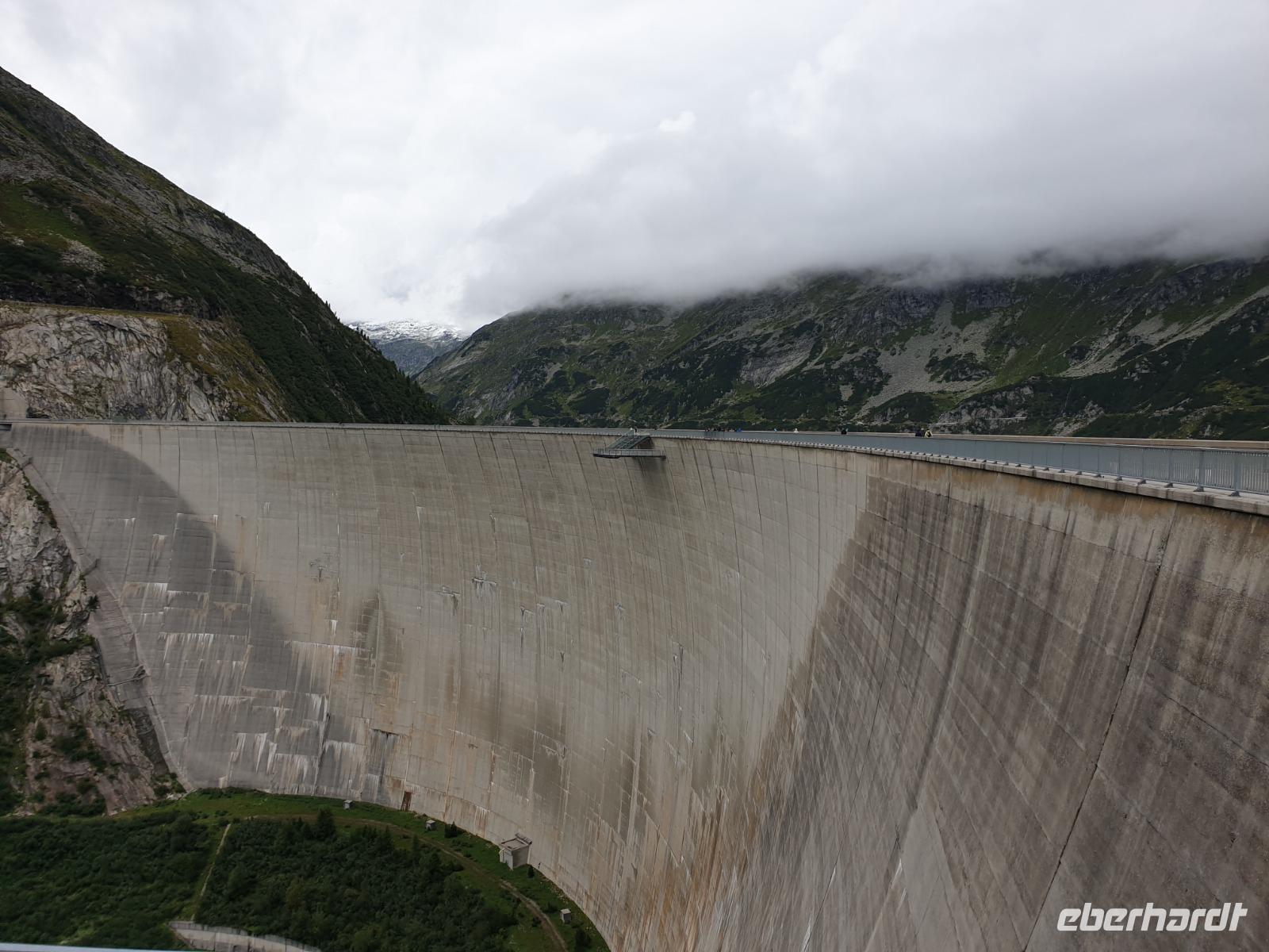 Nachdem unser Chauffeur, die engen Kehren und schmalen Tunnel hinauf auf fast zweitausend Meter gemeistert hat, können wir die mächtige Dammkrone mit den Rollstühlen befahren und sogar den oberen Teil der Aussichtskanzel für einen Blick hinunter zum 200(!) Meter unter uns liegenden Mauersockel nutzen.