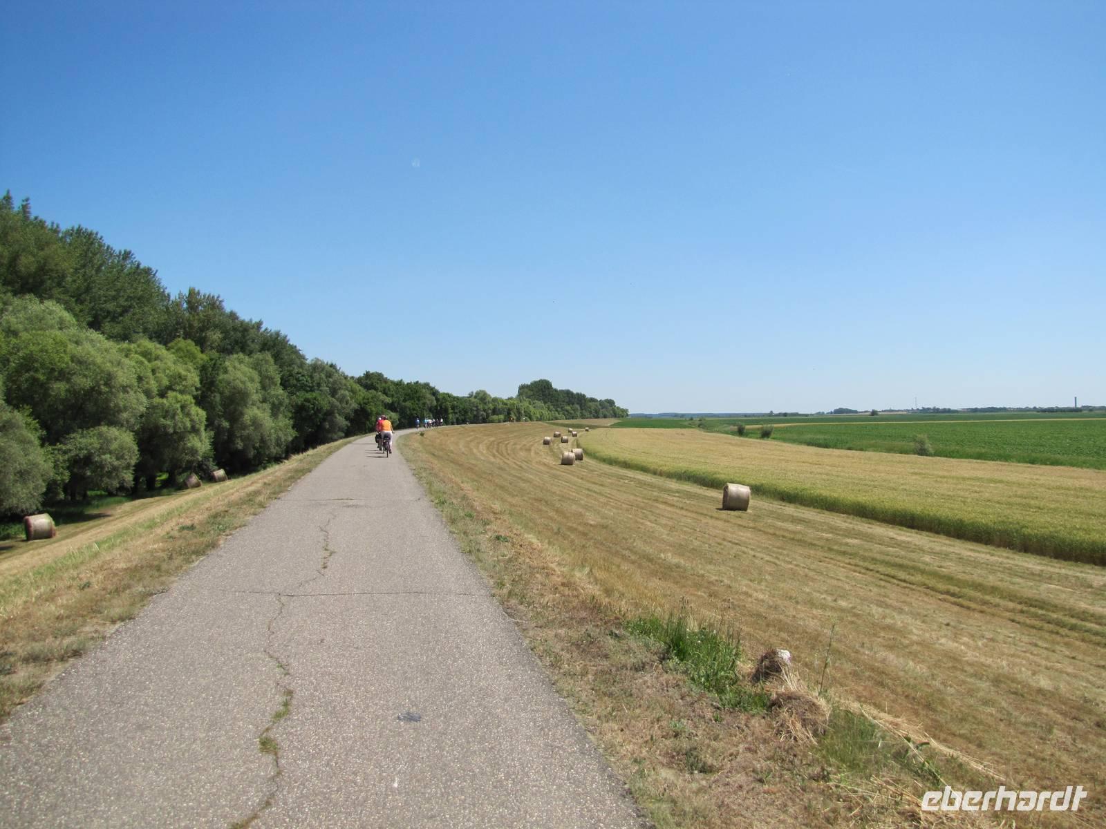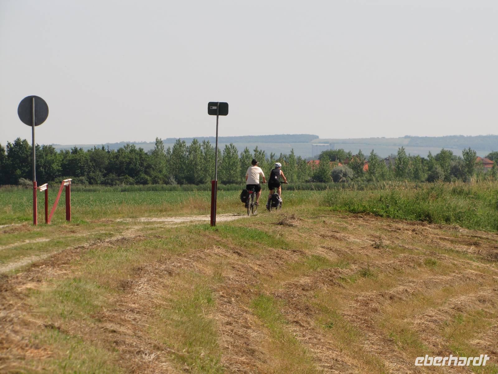 Heute starteten wir direkt vom Hotel aus in Richtung Estergom. Wir überquerten die Donaubrücke von Komarom und erreichten in weniger als 10min. die Slowakische Grenze. Als erstes besichtigten wir den Europaplatz von Komarom, wo sich tolle Fachwerkhäuser befinden. Weiter ging es die nächsten 20km auf einem Dammweg parallel der Donau entlang. Der heutige Radweg war teilweiße Feldweg, teilweiße asphaltiert. Unterwegs stoppten wir wie immer für ausreichende Trinkpausen und kleine Fotostopps wie z.B. an einer kleinen römischen Ausgrabung. Gegen 12:00Uhr war es Zeit für eine ausgiebige Mittagspause in einem kleinen Biergarten-Restaurant, nahe der Ortschaft Moca. Wer wollte konnte leckeren ungarischen Kesselgulasch probieren. Nach einer entspannten Pause war es Zeit sich wieder auf die Räder zu schwingen und die letzten 20km bis Estergom zu radeln. Die ersten 10km waren asphaltiert bzw. gut befestigte Dammwege, die letzten 10km waren wieder Feldwege. Unterwegs erfreuten wir uns an einem kurzen Stopp am Donauufer, wer wollte konnte die Füße im kühlen Wasser der Donau abkühlen. Kurz vor Estergom erreichten wir ein kleines Dorf wo wir unsere Räder aufladen konnten. Mit dem Bus fuhren wir ins Stadtzentrum wo wir uns kurz die Basilika anschauten. Aufgrund der Hitze beschlossen wir eher zum Hotel zurück zu fahren um noch genug Zeit zum Baden in der Therme und im Freibad zu haben. Nach einer schweißtreibenden Radtour war dies ein toller Tages-Abschluss.