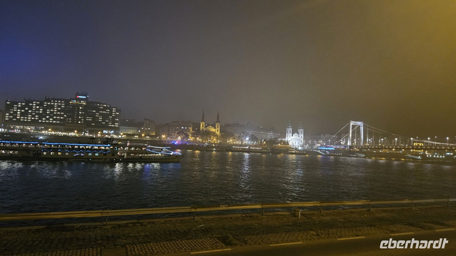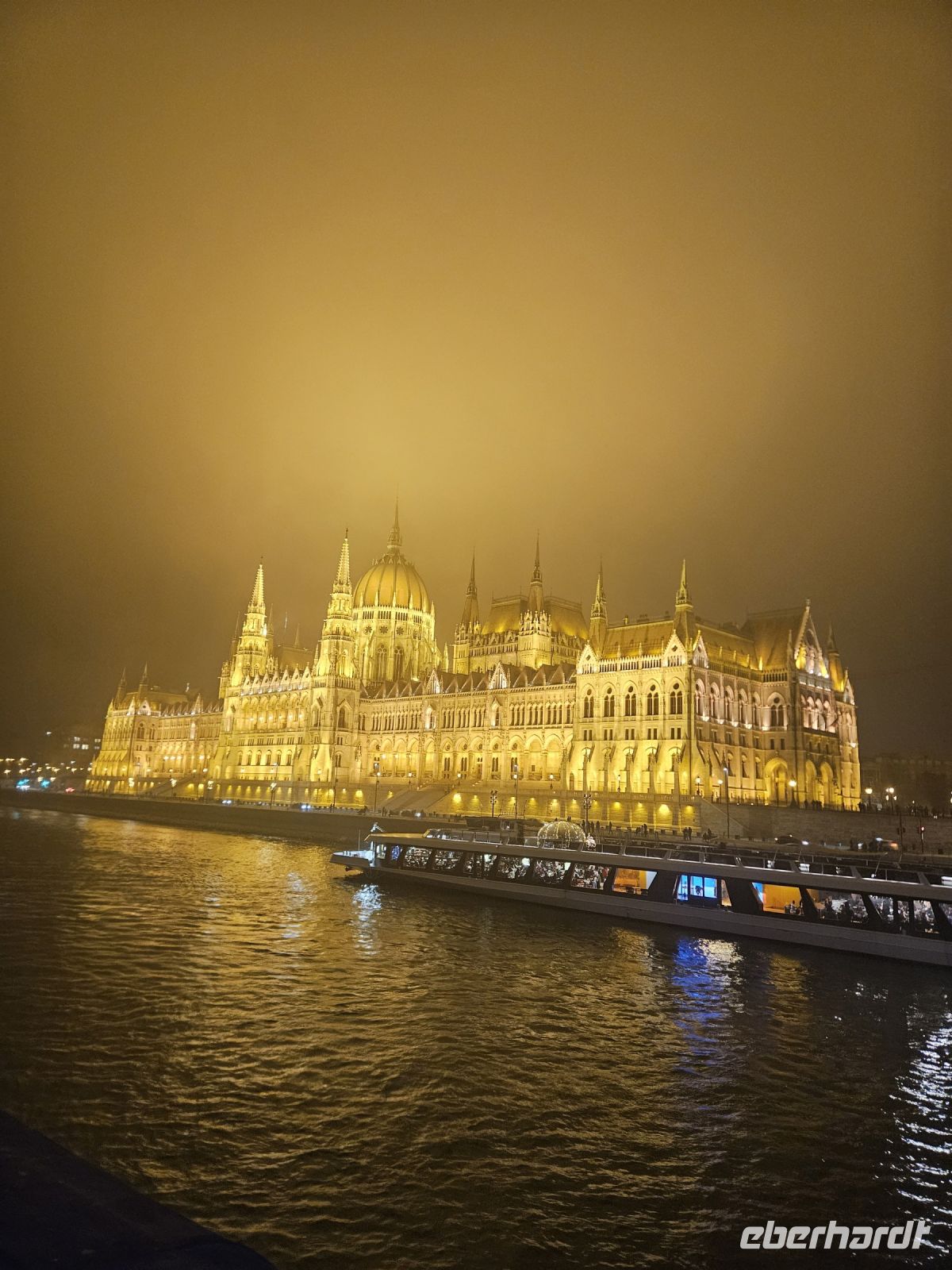 18.30 beginnt unser spannender Abend. Schon mit dem Bus machen wir eine tolle Lichterfahrt: vorbei an dem wunderschön beleuchteten Museum der modernen Kunst und dem Nationaltheater, entlang der Donau sehen wir den „Wal“. Dies ist eigentlich ein Kongresszentrum, welches allerdings an die Form eines Wals erinnert. Nahe der Kettenbrücke wartet auch unser Schiff „Europá“ auf uns. Zu Beginn wird schon gleich mal mit einem Gläschen angestoßen. Dann entwickelt sich der Abend so langsam hin zu 12.00 Uhr. Das Boot legt noch während unseres Essens ab und wir haben einen ersten wunderschönen Blick auf das imposant beleuchtete Parlament und fahren die Donau flussabwärts. Den einzigen Dämpfer an diesem Abend bietet das kalt servierte Essen. Aber immerhin bedeutet das, dass wir wie die Könige speisen. ??