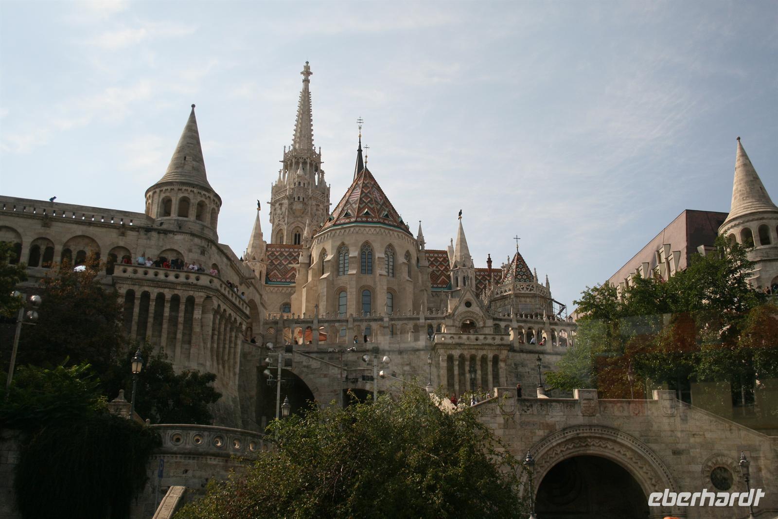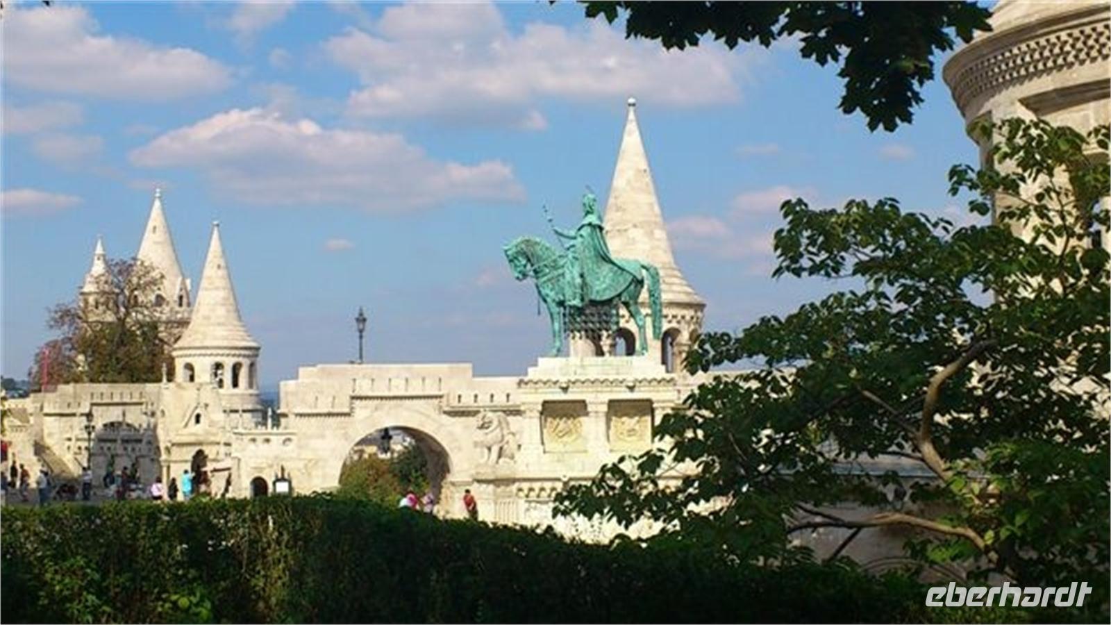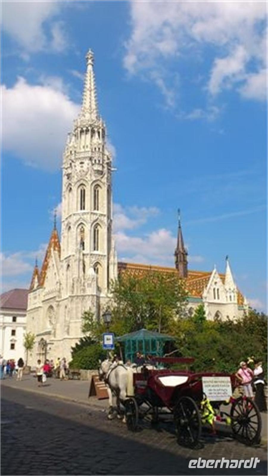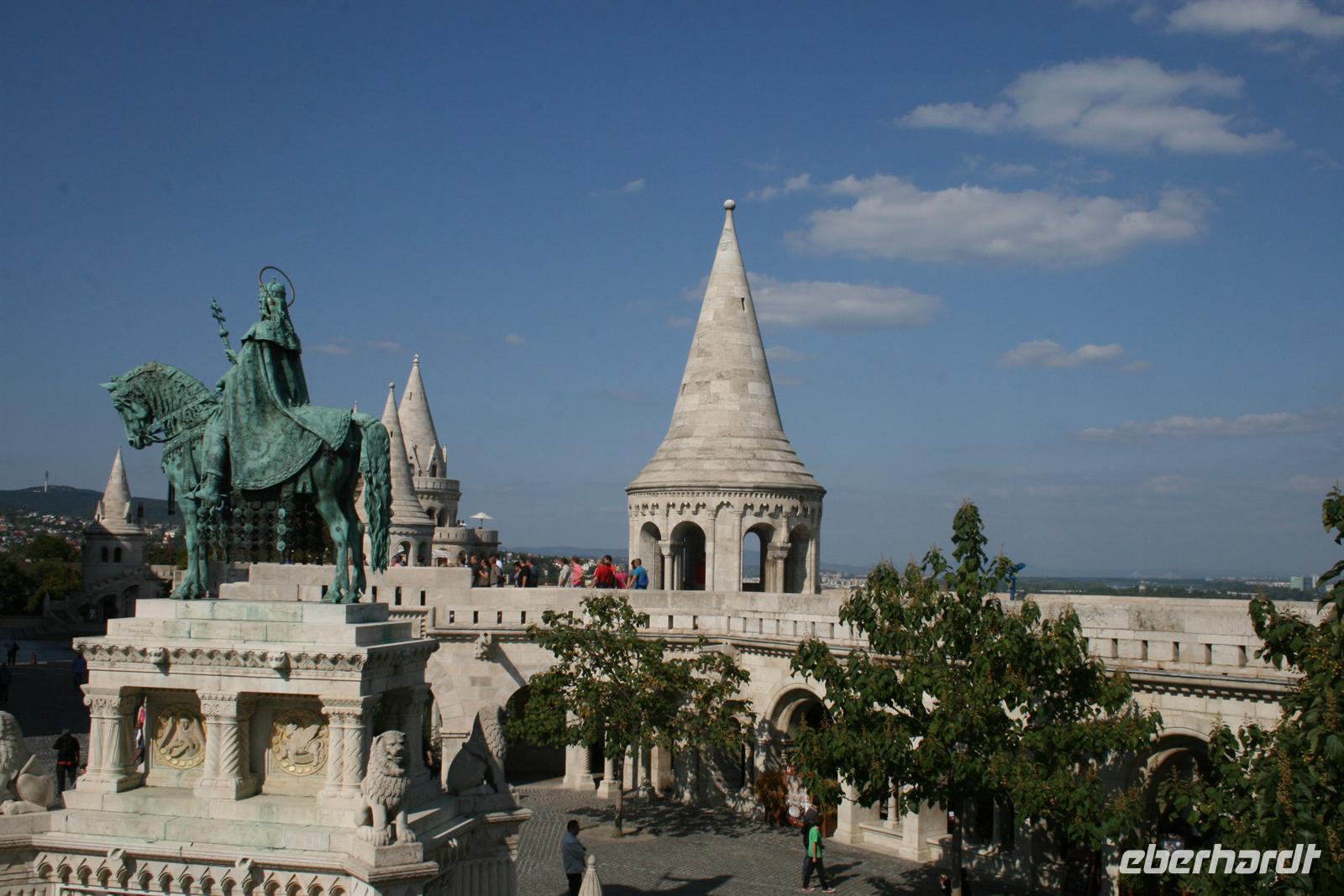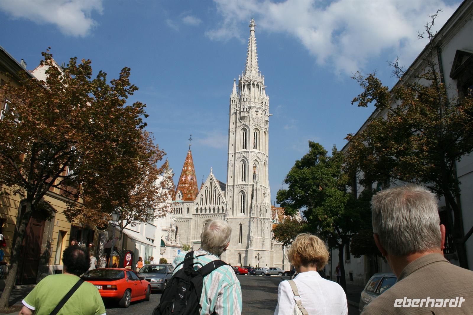Gut gestärkt und bester Laune fuhren wir zum Burgviertel auf die Budaer Seite. Blauer Himmel und Sonnenschein begleiteten uns. Nach einem kleinen Spaziergang durch das belebte Burgviertel besichtigten wir die weiß strahlende Matthias-Kirche (richtiger Name: Liebfrauenkirche der Burg Buda) mit ihrem bunten Dach aus Majolikaziegeln. Weltweit bekannt ist die Kirche durch die Krönung von Franz Joseph I. und seiner "Sissi" zum König und zur Königin von Ungarn. Anläßlich dieses Ereignisses hatte Franz Liszt seine berühmte Krönungsmesse komponiert und auch selbst dirigiert. Vor der Kirche thront König Bela auf seinem Pferd, der an dieser Stelle bereits im 13. Jhd. die erste Kirche errichten liess.