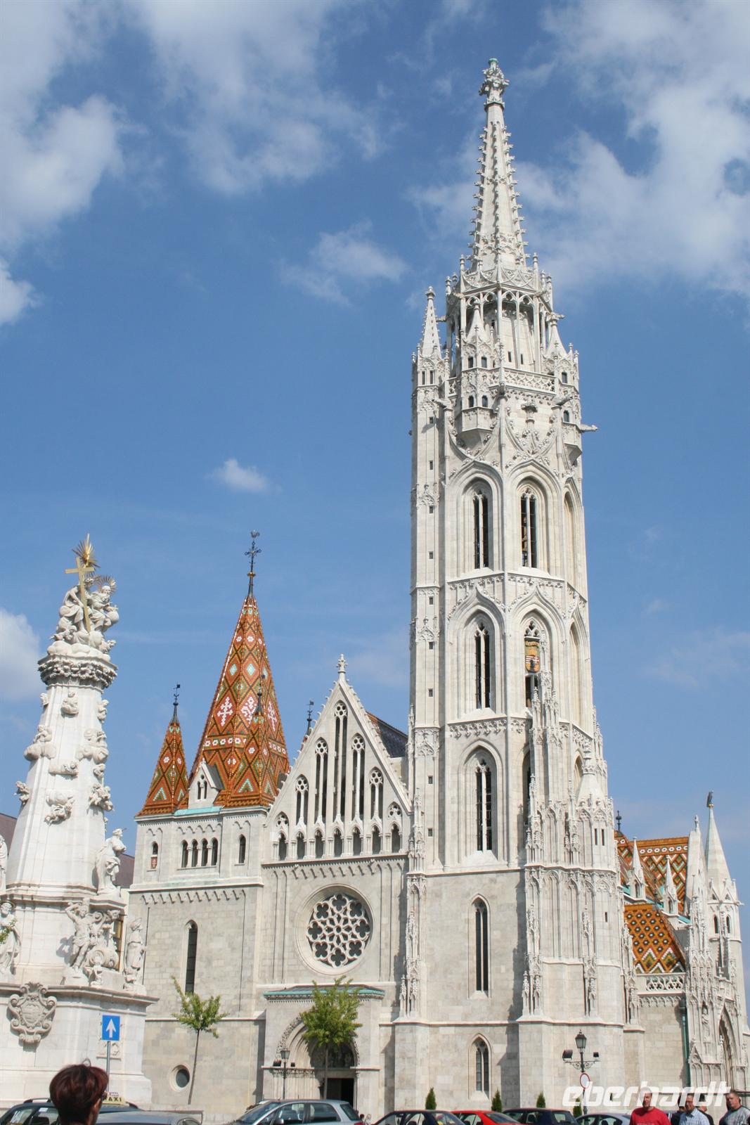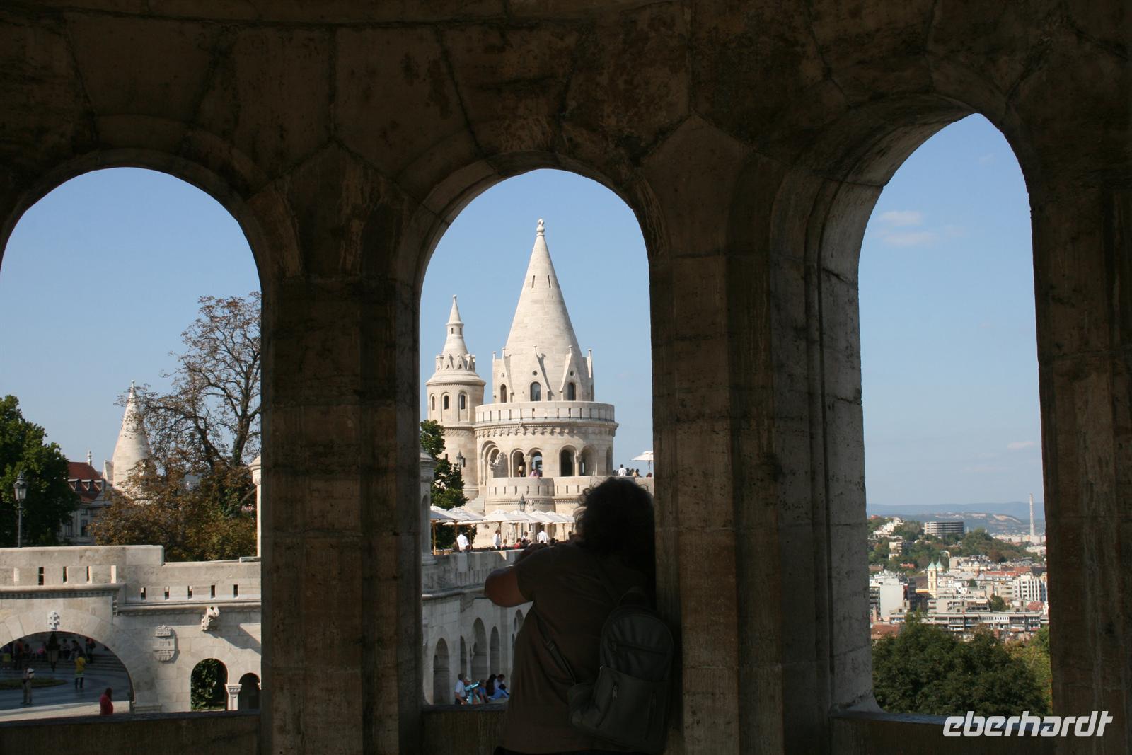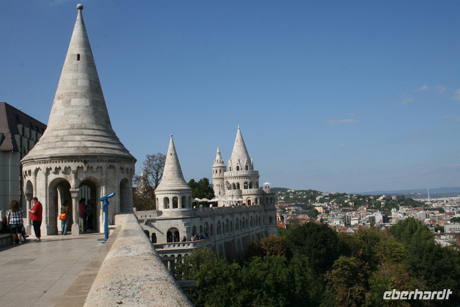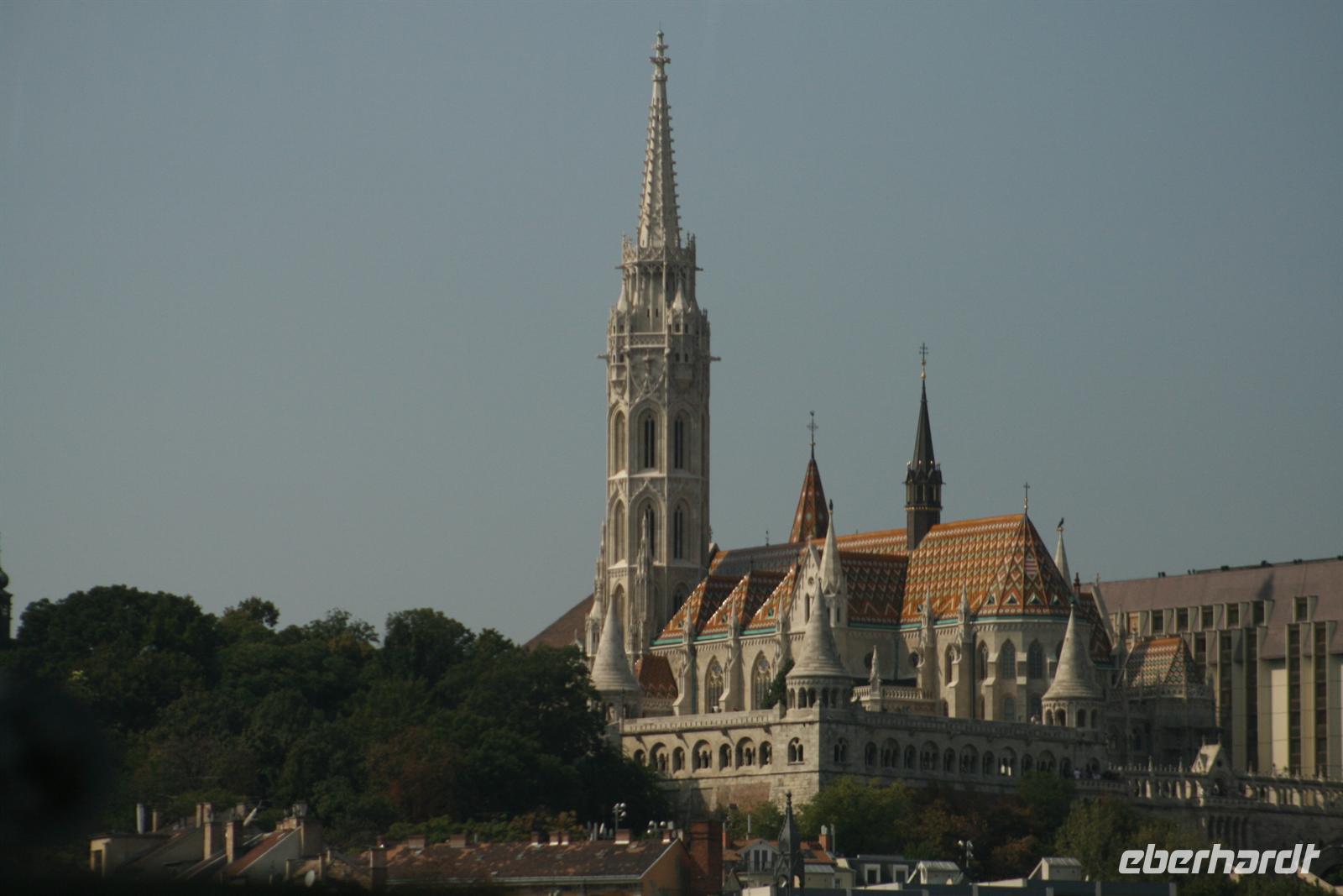 Gut gestärkt und bester Laune fuhren wir zum Burgviertel auf die Budaer Seite. Blauer Himmel und Sonnenschein begleiteten uns. Nach einem kleinen Spaziergang durch das belebte Burgviertel besichtigten wir die weiß strahlende Matthias-Kirche (richtiger Name: Liebfrauenkirche der Burg Buda) mit ihrem bunten Dach aus Majolikaziegeln. Weltweit bekannt ist die Kirche durch die Krönung von Franz Joseph I. und seiner "Sissi" zum König und zur Königin von Ungarn. Anläßlich dieses Ereignisses hatte Franz Liszt seine berühmte Krönungsmesse komponiert und auch selbst dirigiert. Vor der Kirche thront König Bela auf seinem Pferd, der an dieser Stelle bereits im 13. Jhd. die erste Kirche errichten liess.