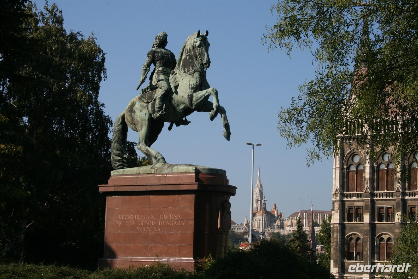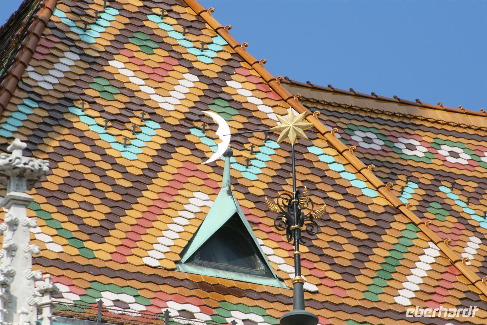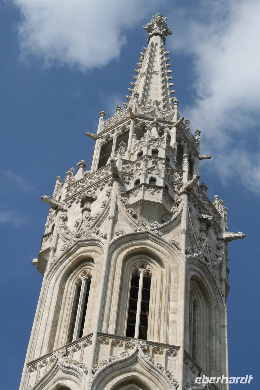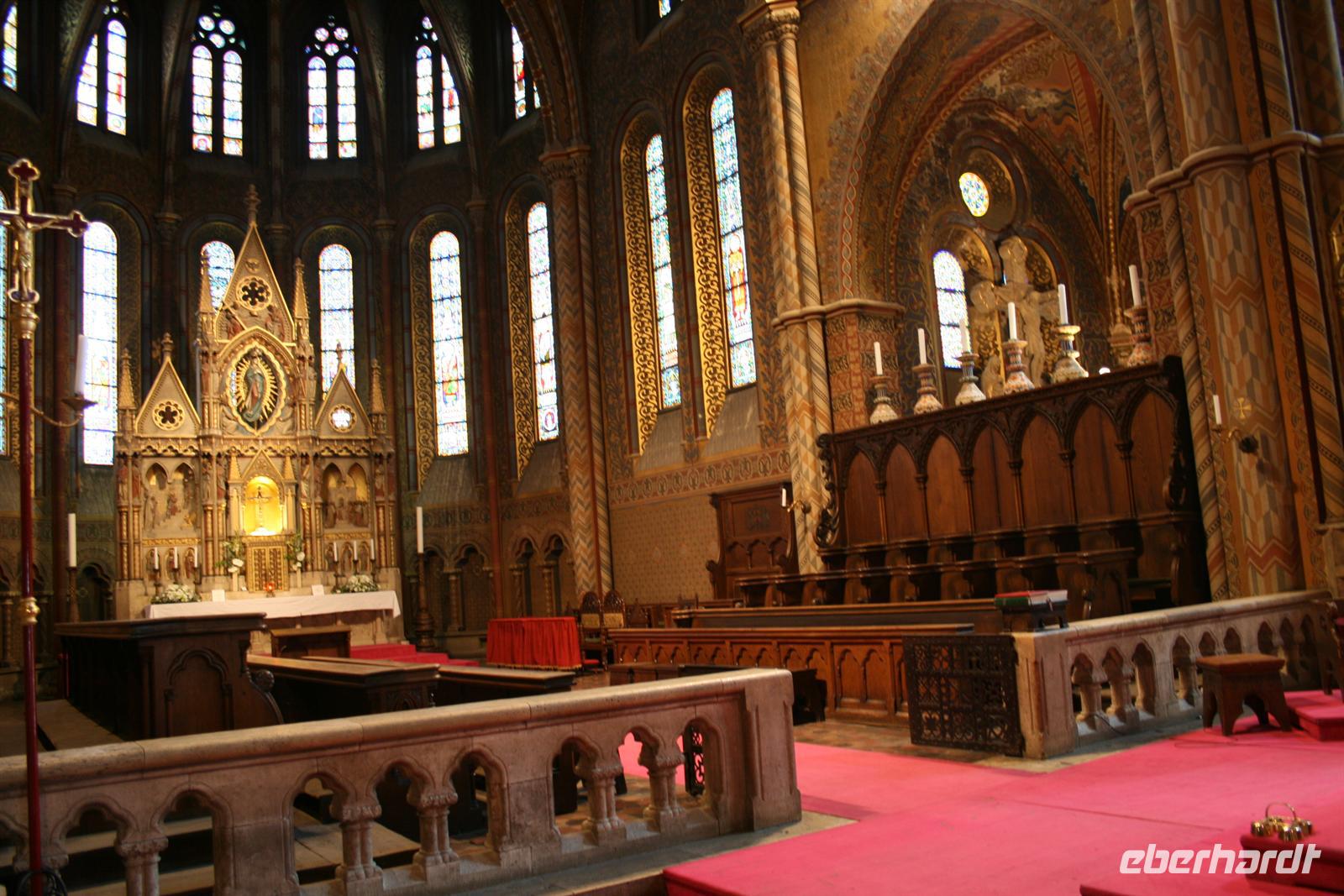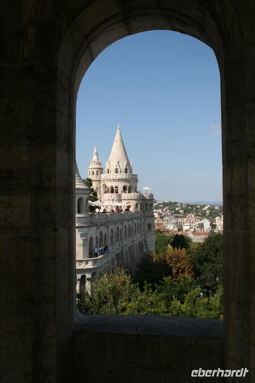 Gut gestärkt und bester Laune fuhren wir zum Burgviertel auf die Budaer Seite. Blauer Himmel und Sonnenschein begleiteten uns. Nach einem kleinen Spaziergang durch das belebte Burgviertel besichtigten wir die weiß strahlende Matthias-Kirche (richtiger Name: Liebfrauenkirche der Burg Buda) mit ihrem bunten Dach aus Majolikaziegeln. Weltweit bekannt ist die Kirche durch die Krönung von Franz Joseph I. und seiner "Sissi" zum König und zur Königin von Ungarn. Anläßlich dieses Ereignisses hatte Franz Liszt seine berühmte Krönungsmesse komponiert und auch selbst dirigiert. Vor der Kirche thront König Bela auf seinem Pferd, der an dieser Stelle bereits im 13. Jhd. die erste Kirche errichten liess.