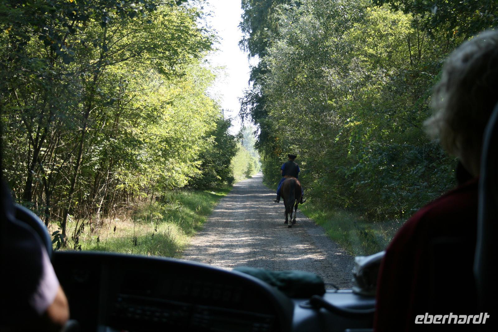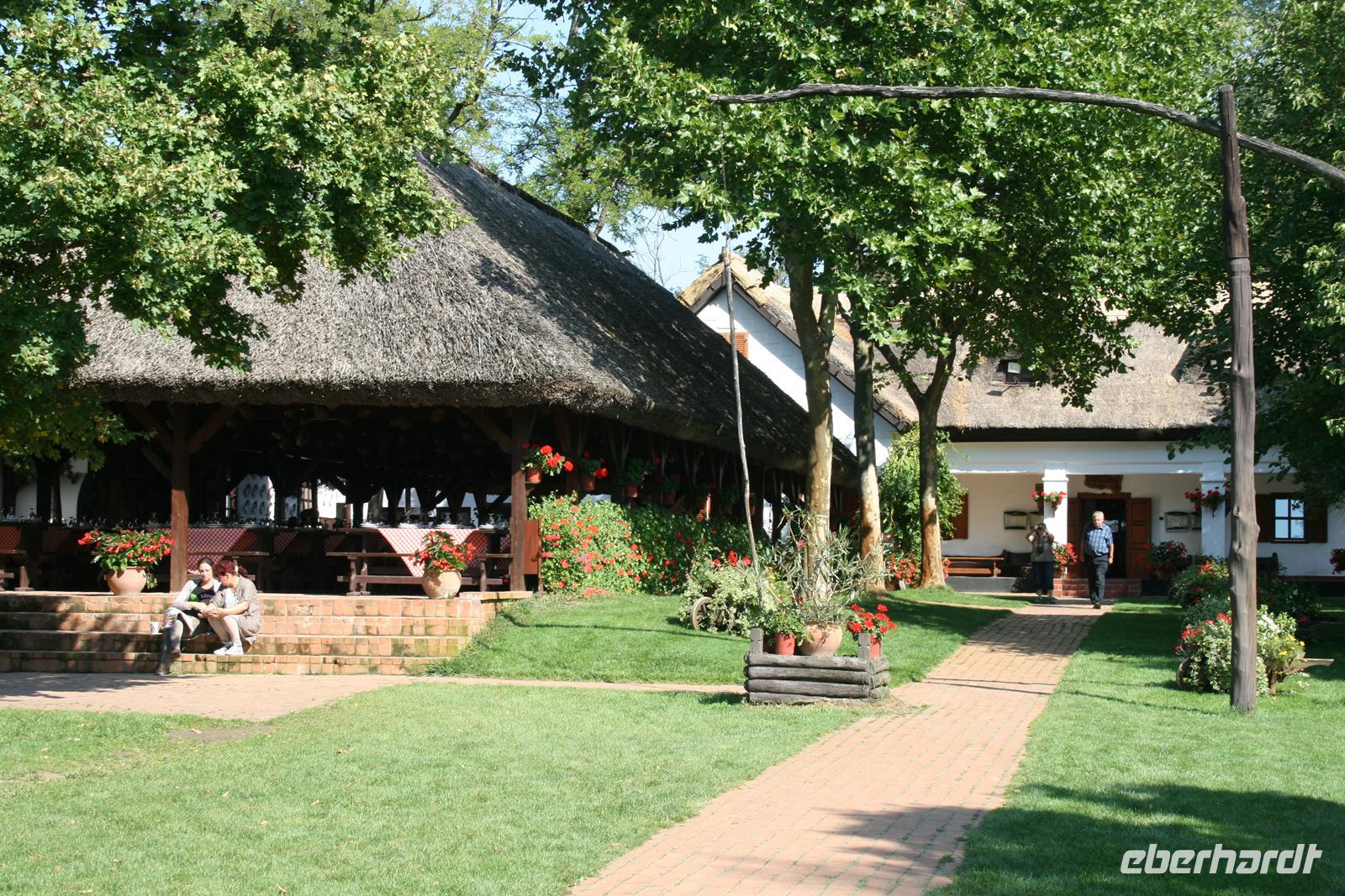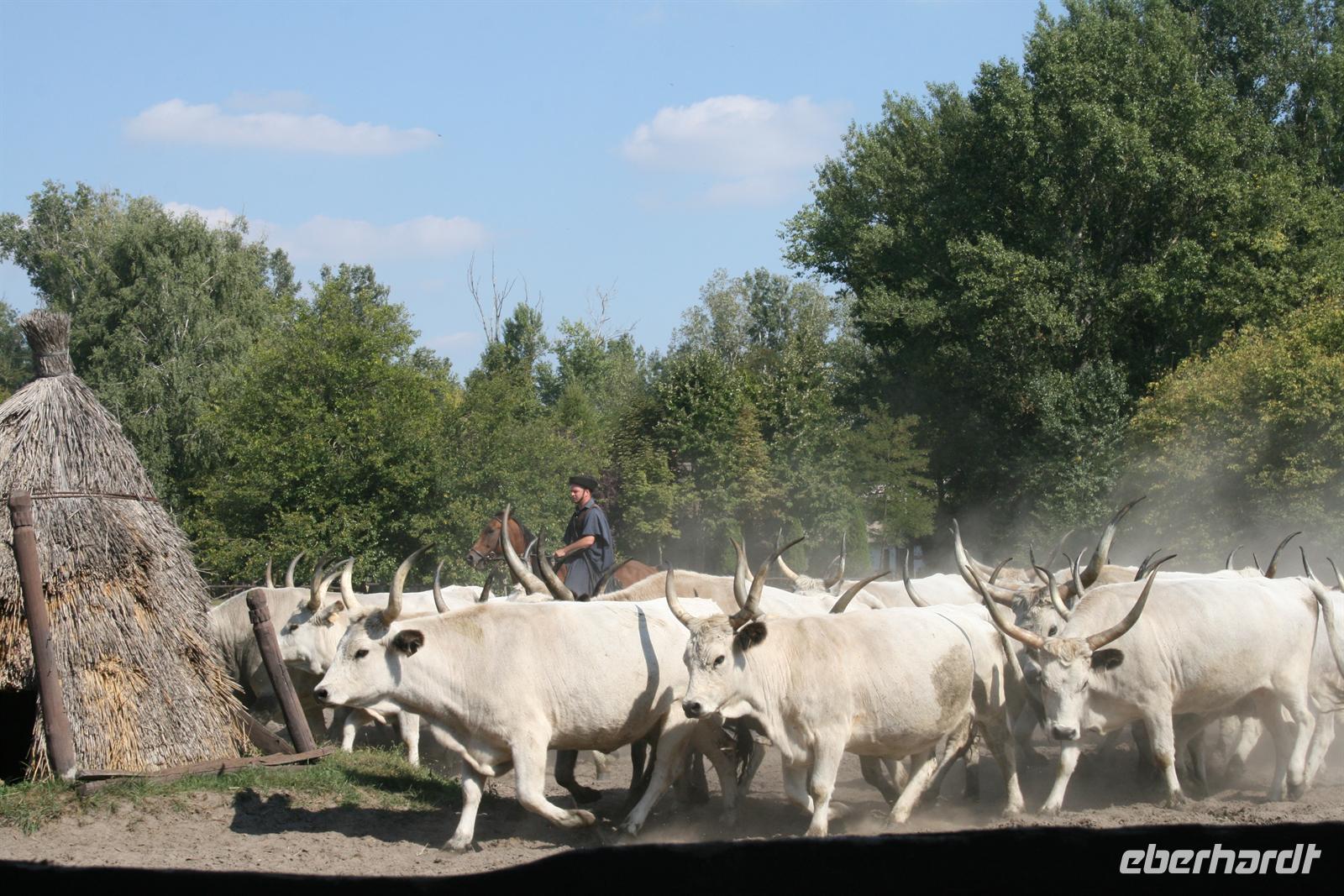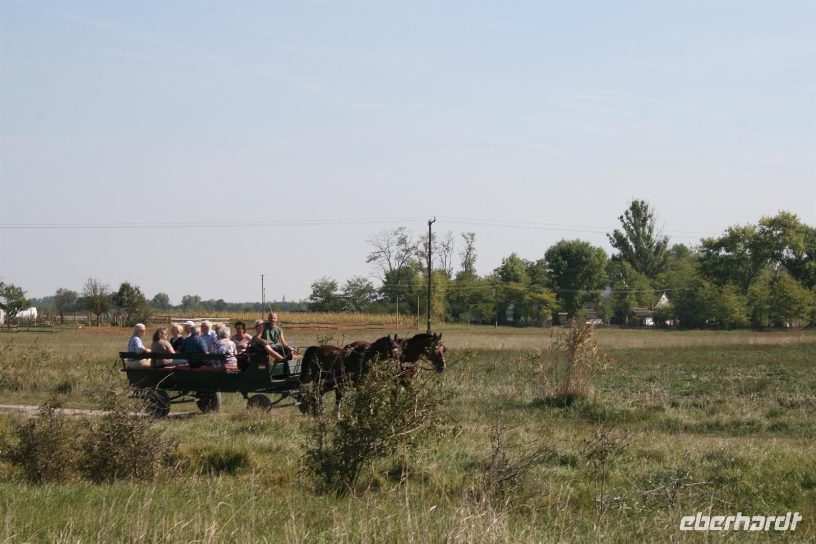 Am Mittag wurden wir auf der Varga Tanya in der Bugac Puszta erwartet. Ein schmucker Csikos auf seinem Pferd ritt vor unserem Bus voraus und zeigte uns den Weg. Die hübsche Piroska begrüßte uns mit einem Baracz Palinka und Pogatschen. Ausgewählte Herren bekamen sogar ein Küsschen. Gemütlich in Kutschen durchstreiften wir das weite Gelände bei herrlichstem Spätsommerwetter.
