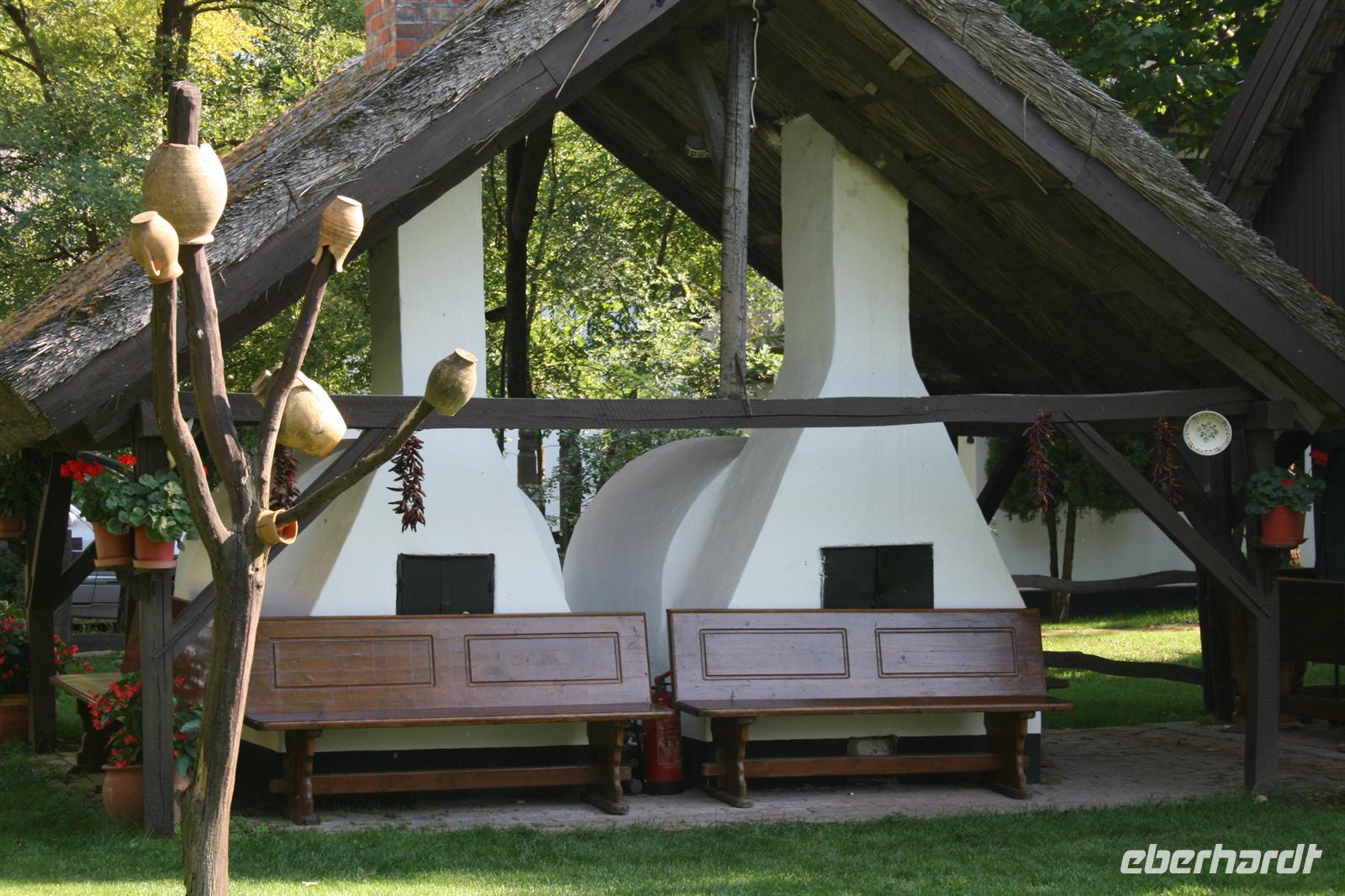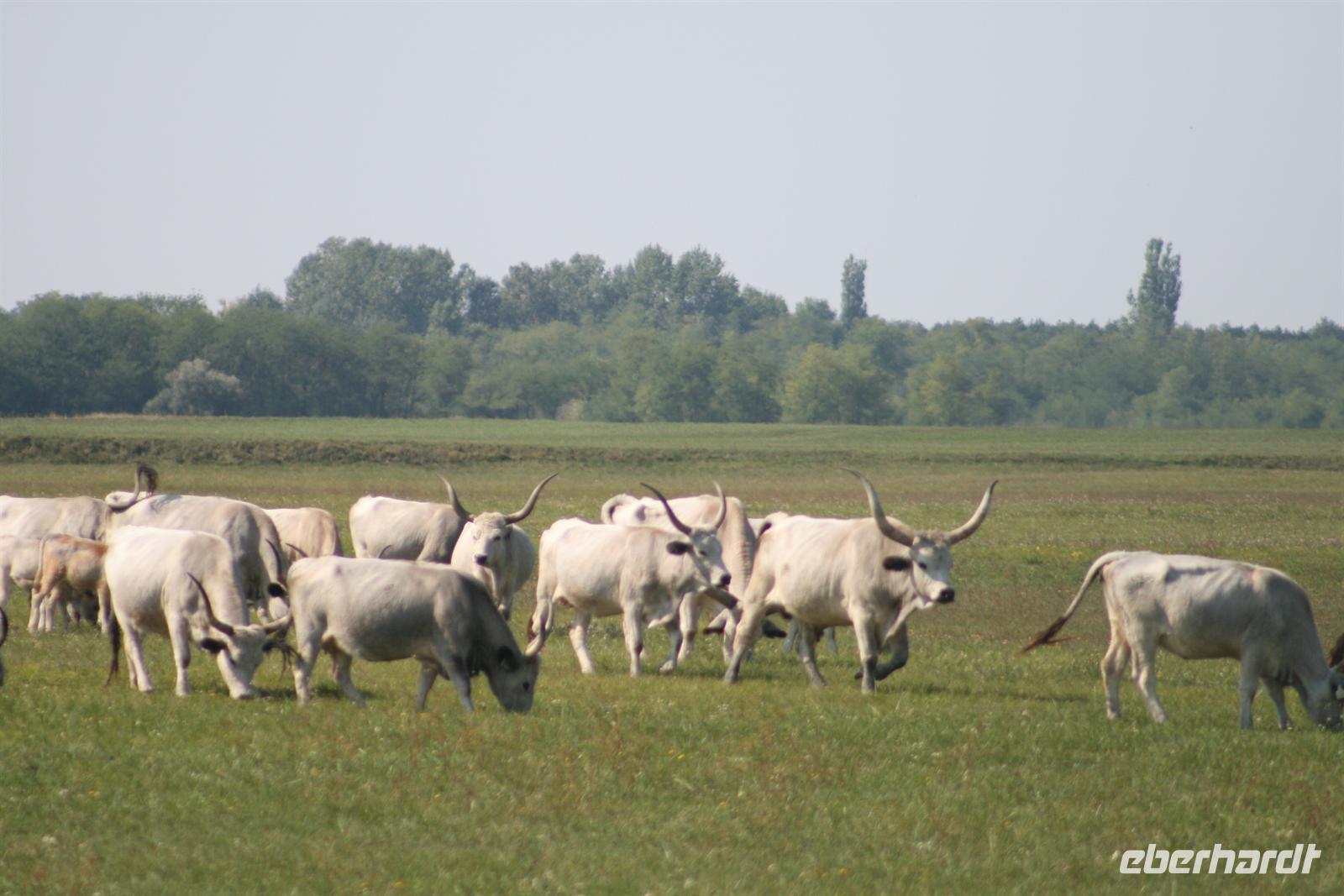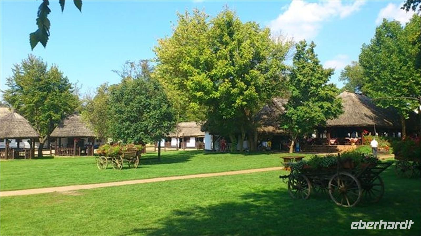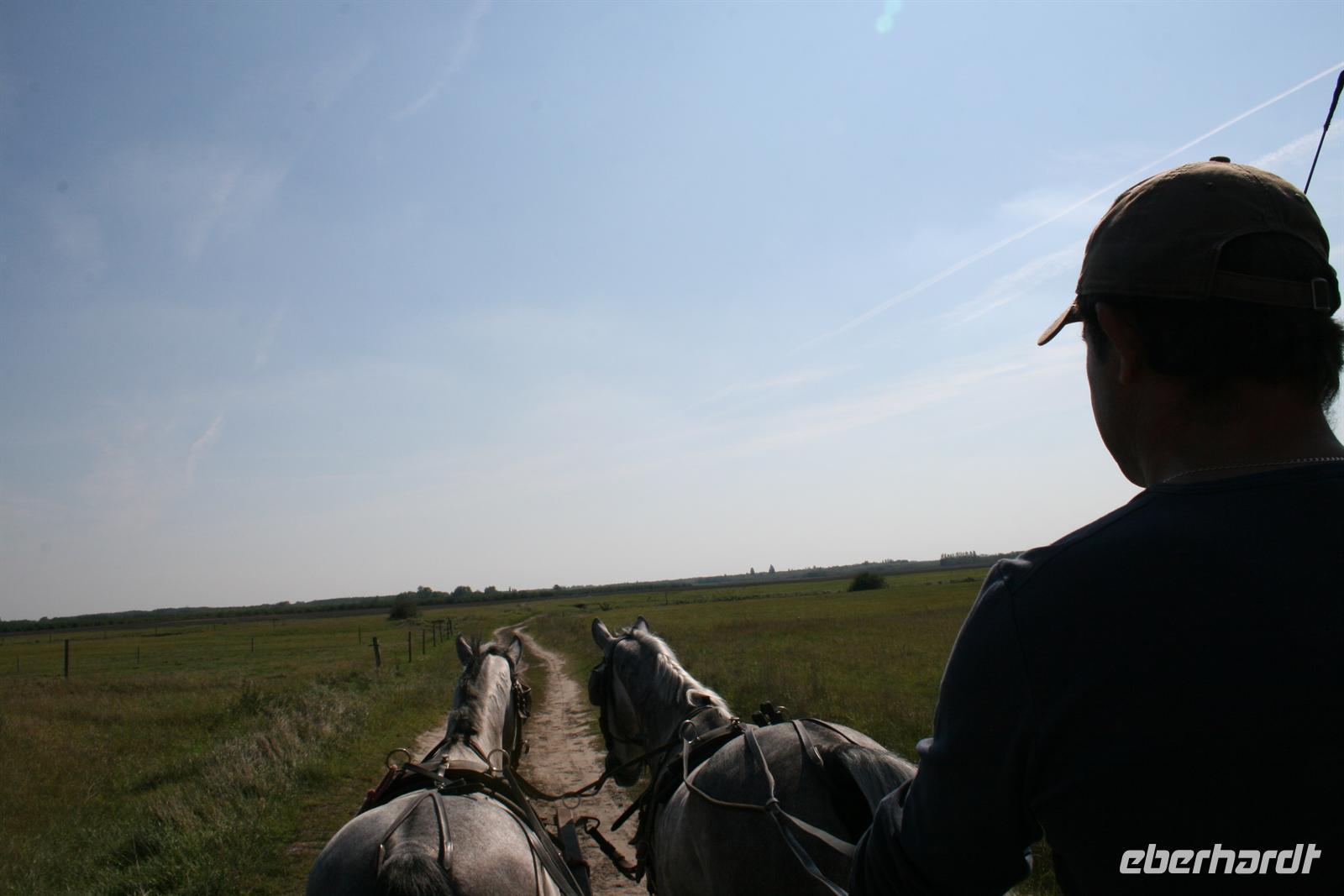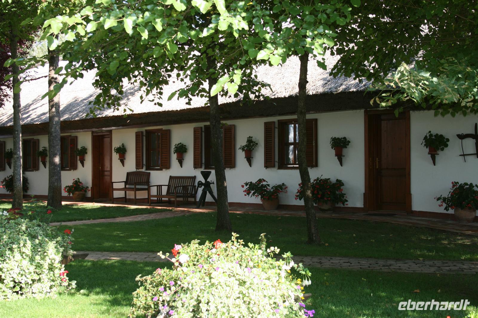 Am Mittag wurden wir auf der Varga Tanya in der Bugac Puszta erwartet. Ein schmucker Csikos auf seinem Pferd ritt vor unserem Bus voraus und zeigte uns den Weg. Die hübsche Piroska begrüßte uns mit einem Baracz Palinka und Pogatschen. Ausgewählte Herren bekamen sogar ein Küsschen. Gemütlich in Kutschen durchstreiften wir das weite Gelände bei herrlichstem Spätsommerwetter.