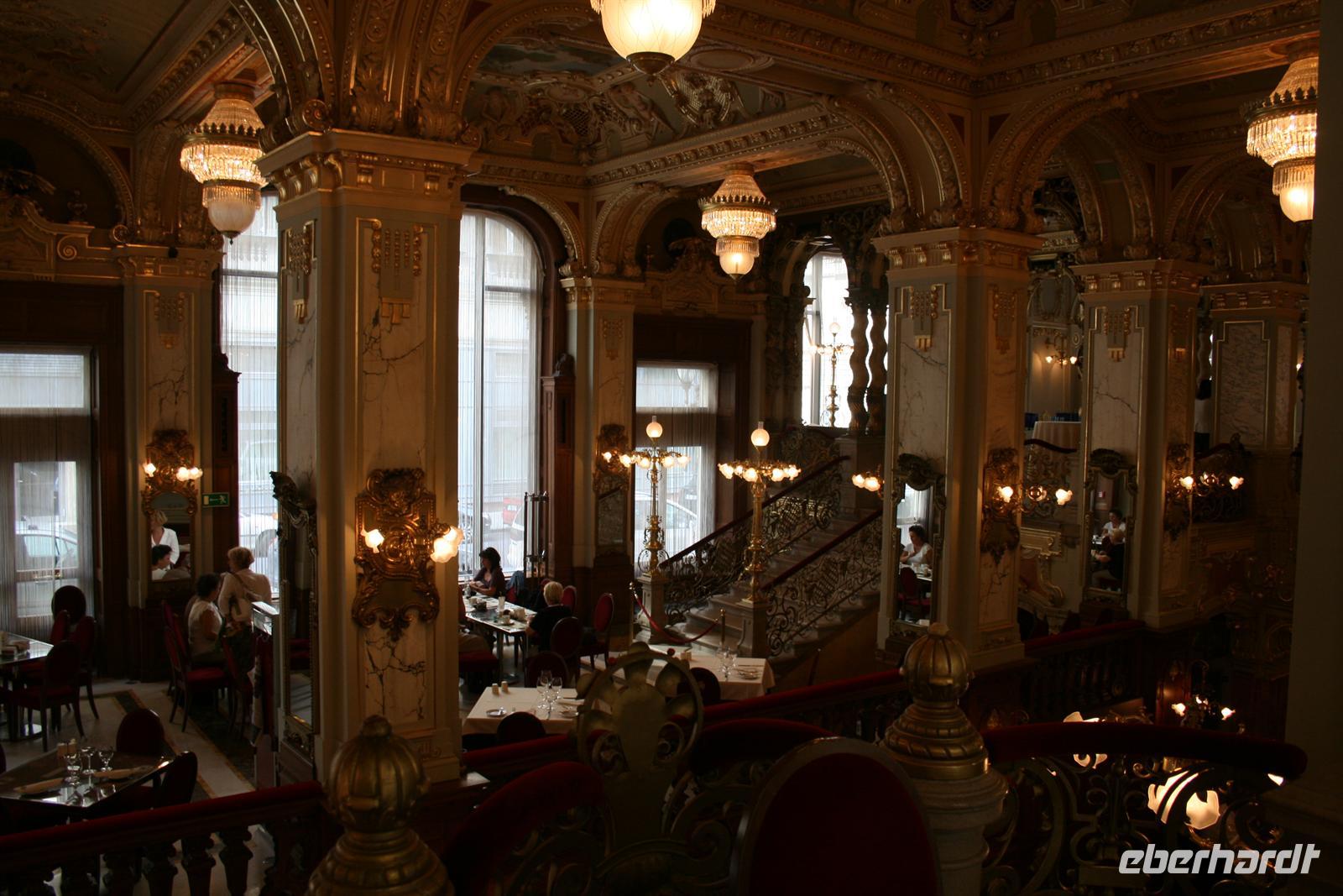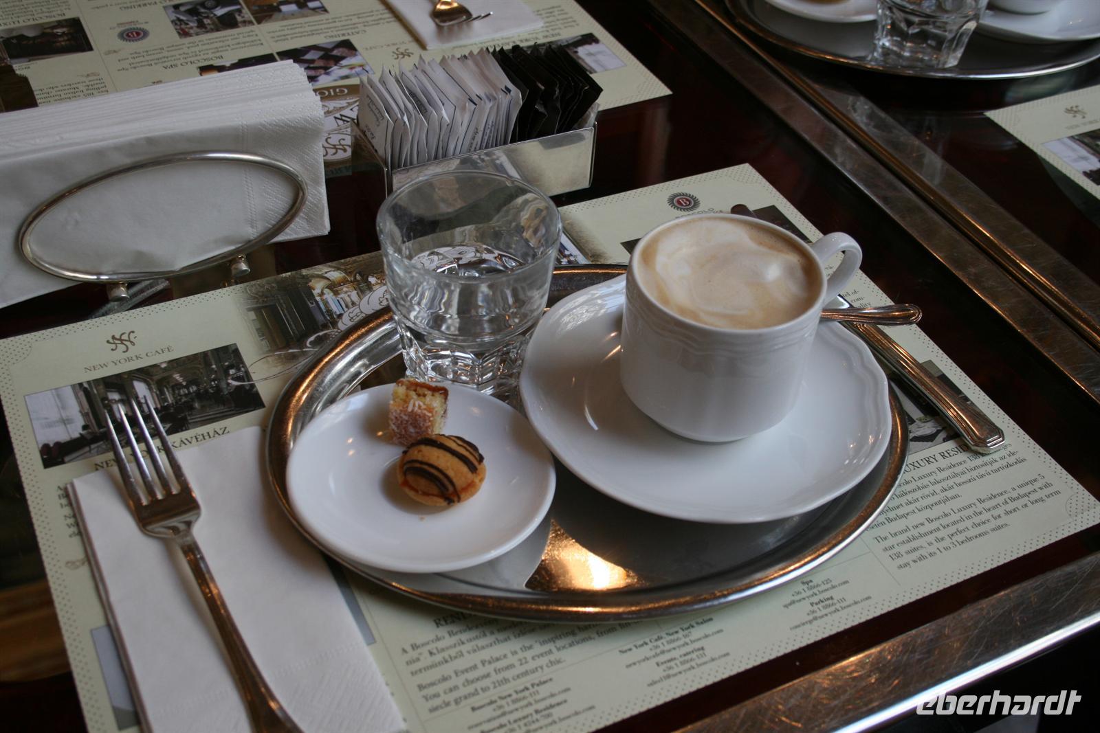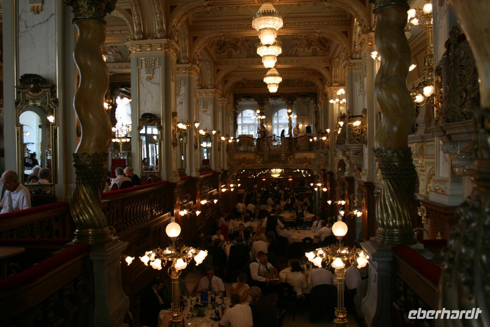 Mit O-Bus fuhren wir nun 3 Stationen zum Elisabeth-Platz, wo wir das imposante Gebäude des "New York Palace Budapest" (früher für eine amerikanische Lebensversicherung gebaut) steht. Heute beherbergt das renovierte Gebäude ein erstklassiges Hotel und im Erdgeschoss das berühmte "Cafe New York" (ehemals Cafe Hungaria) - unser Ziel! Im exklusiven Ambiente, zwischen Marmorwänden, Spiegeln, goldenen Verzierungen, Kronleuchtern und wertvollen Fresken verbrachten wir unsere verdiente Mittagspause. Zu Espresso, Kaffee oder heißer Schokolade wurden uns Kreationen aus Sahne, Schokolade und Marzipan serviert (Budapester Hüftgold). Nach dieser süßen Schlemmerei holte uns Heiko mit dem Bus ab.
