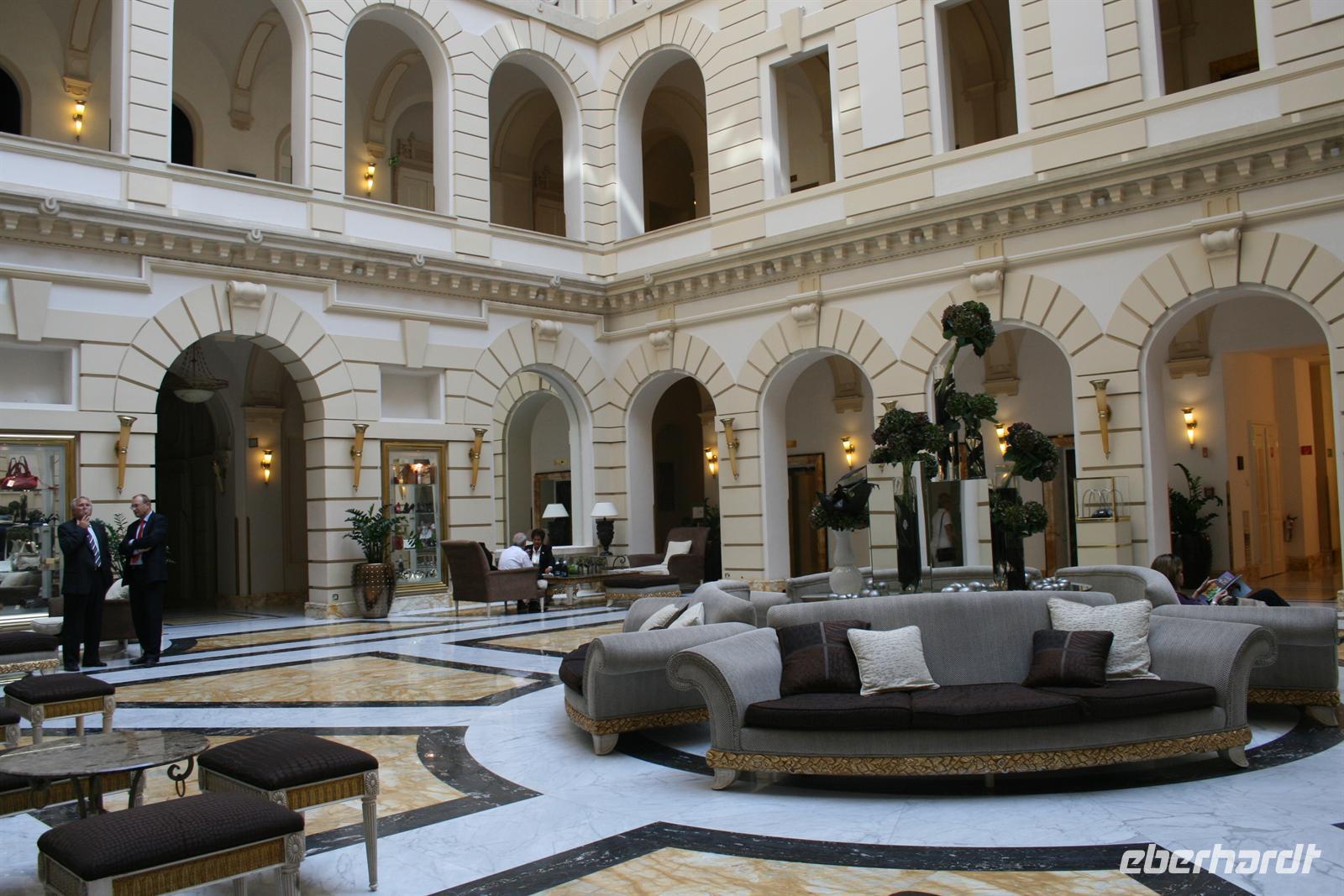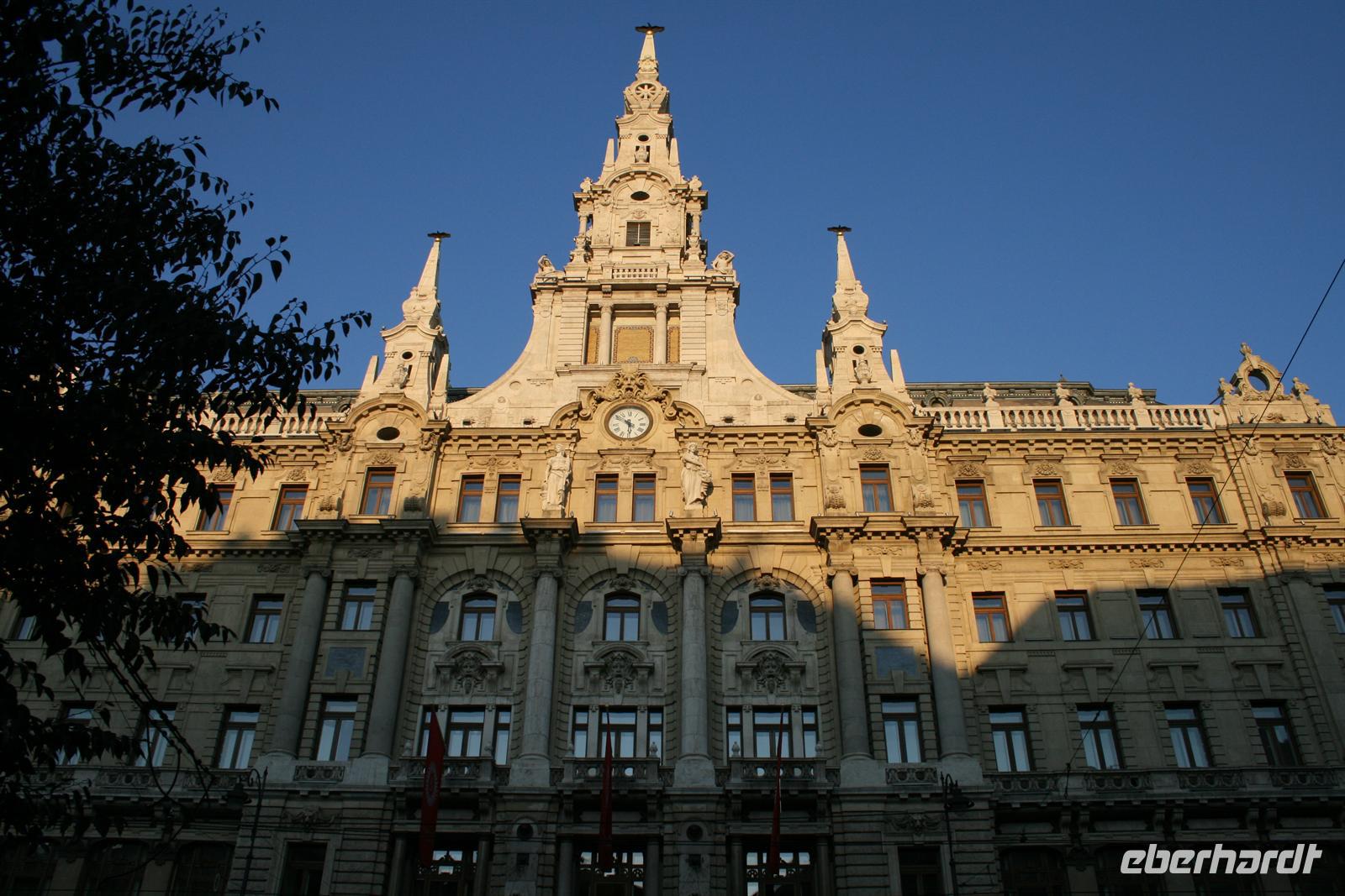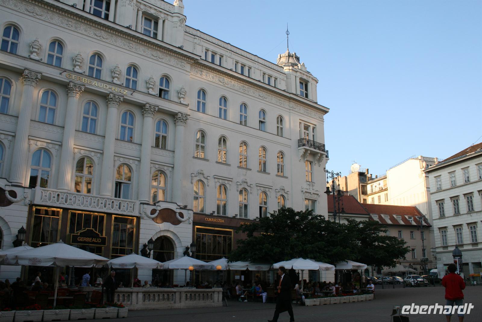 Mit O-Bus fuhren wir nun 3 Stationen zum Elisabeth-Platz, wo wir das imposante Gebäude des "New York Palace Budapest" (früher für eine amerikanische Lebensversicherung gebaut) steht. Heute beherbergt das renovierte Gebäude ein erstklassiges Hotel und im Erdgeschoss das berühmte "Cafe New York" (ehemals Cafe Hungaria) - unser Ziel! Im exklusiven Ambiente, zwischen Marmorwänden, Spiegeln, goldenen Verzierungen, Kronleuchtern und wertvollen Fresken verbrachten wir unsere verdiente Mittagspause. Zu Espresso, Kaffee oder heißer Schokolade wurden uns Kreationen aus Sahne, Schokolade und Marzipan serviert (Budapester Hüftgold). Nach dieser süßen Schlemmerei holte uns Heiko mit dem Bus ab.