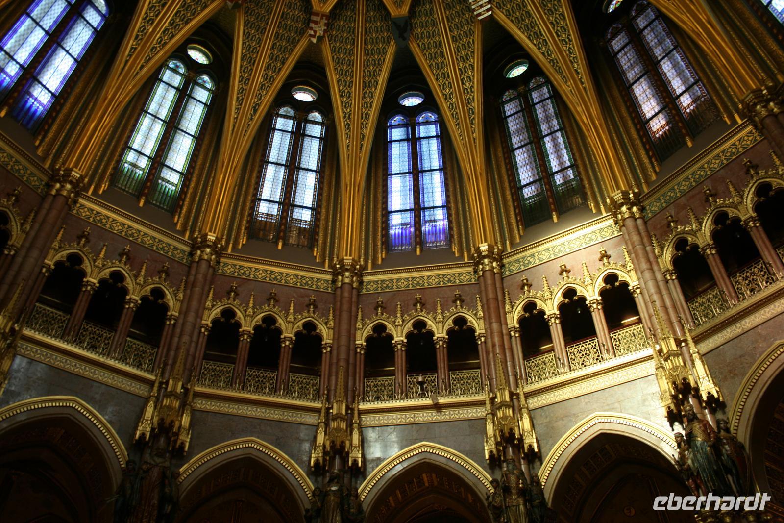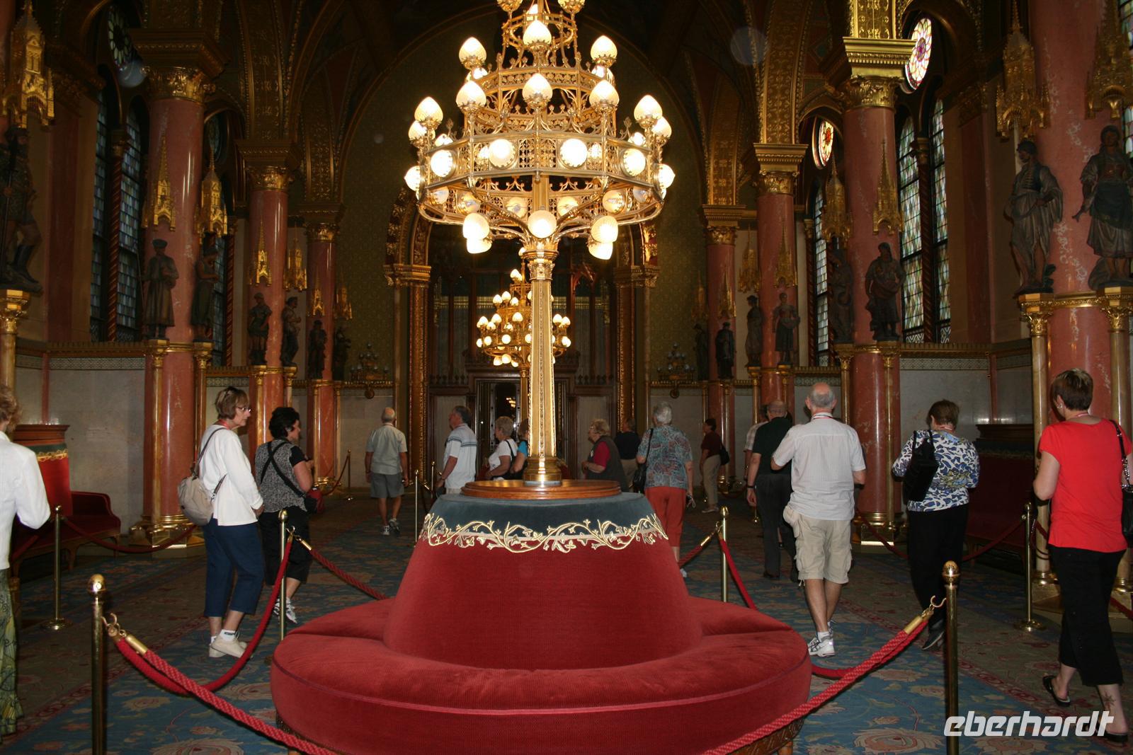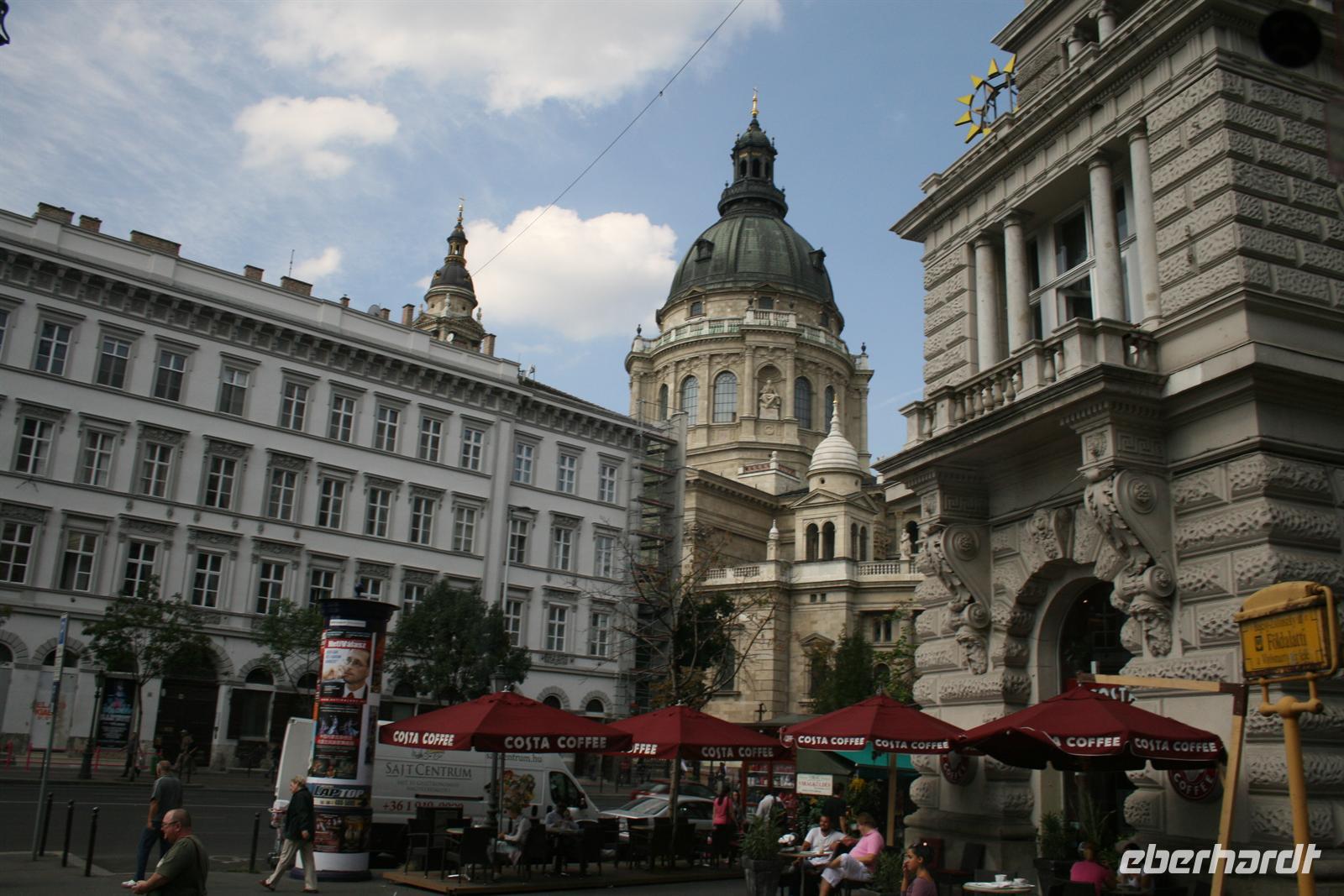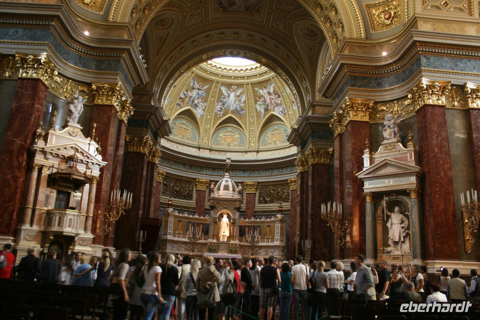 Die Kuppel ist, wie die der Stephans-Basilika (übrigens höchste Gebäude Budapests), 96 m hoch. Die 96 ist eine bedeutende Ziffer, da die Gründung Ungarns auf das Jahr 896 zurückzuführen ist, als die Magyarenstämme unter Fürst Arpad das Karpatenbecken eroberten. Zum Schluss durften wir noch einen Blick in den Sitzungssaal werfen. Nach dieser exklusiven Führung spazierten wir über den Freiheitsplatz, in dessen Mitte sich das sowjetische Ehrenmal befindet (übrigens das einzigste, noch direkt in Budapest stehen gelassene; alle anderen Denkmäler der kommunisten Zeit wurden in einen Skulpturenpark "verbannt".) Irrwitzig, dass sich gleich nebenan die Botschaft der USA befindet. Unweit prunkt die monumentale St.-Stephans-Basilika, die wir anschließend besichtigten. Einige japanische Touristen waren von den fantastischen Kuppelmosaiken im Inneren so beeindruckt und legten sich rücklings nieder.