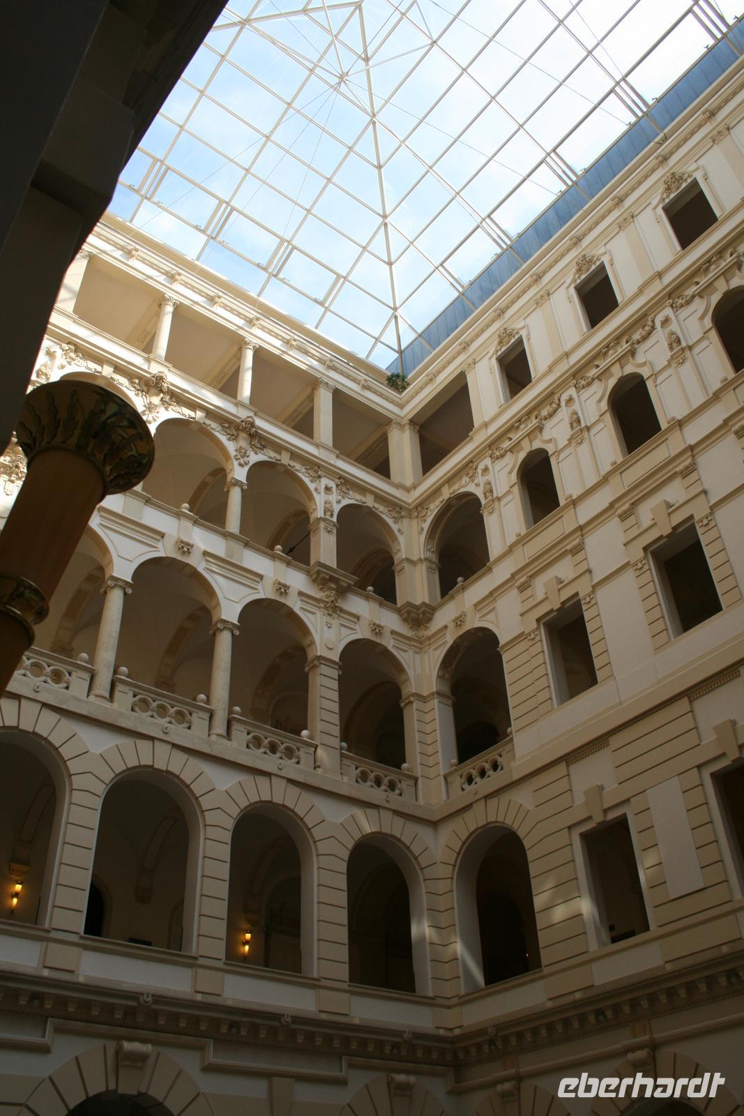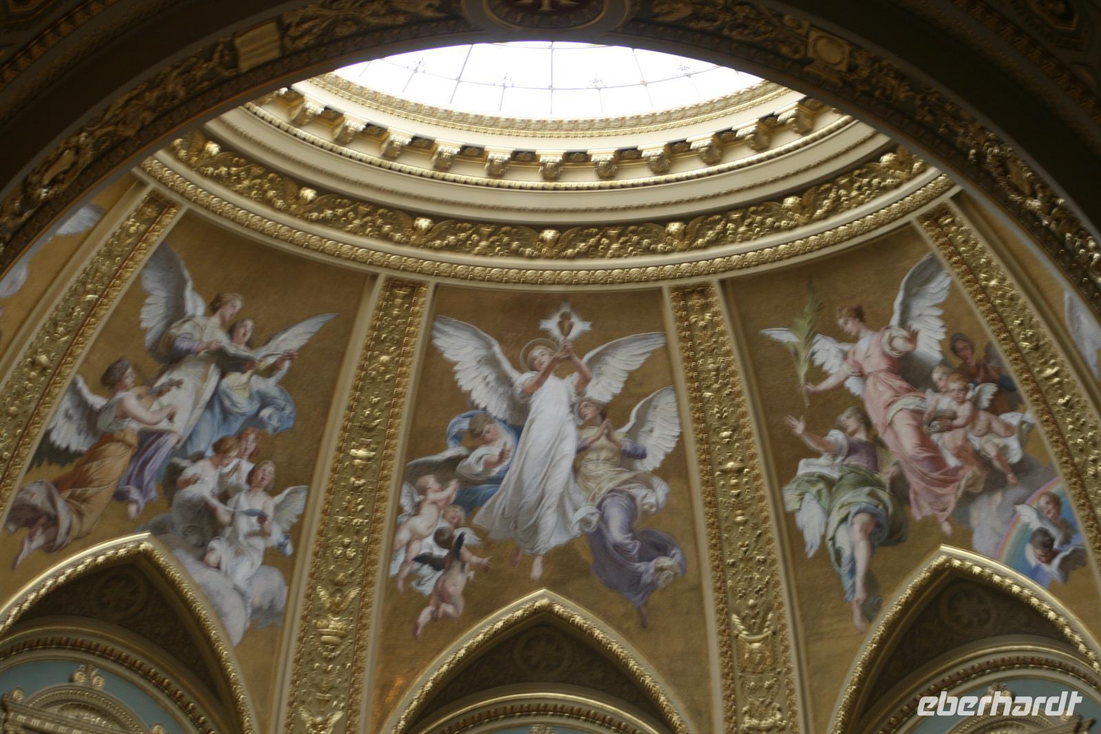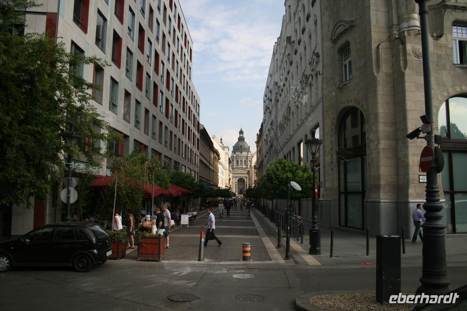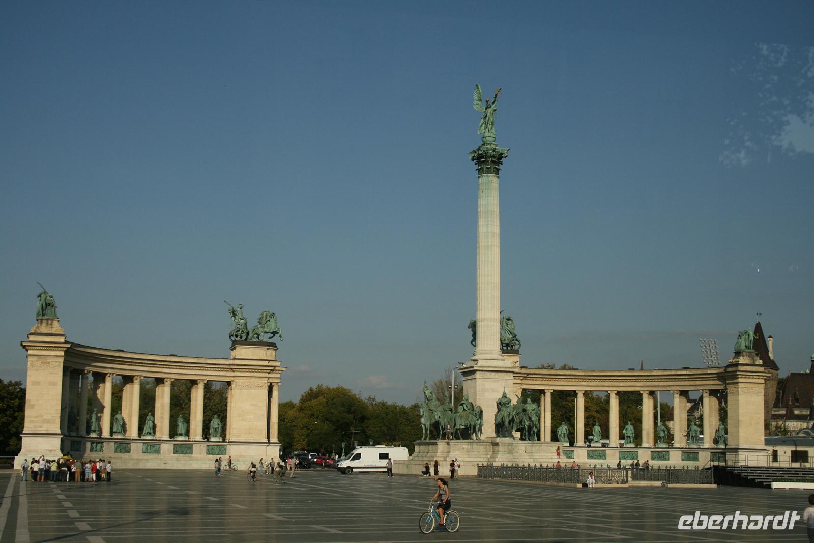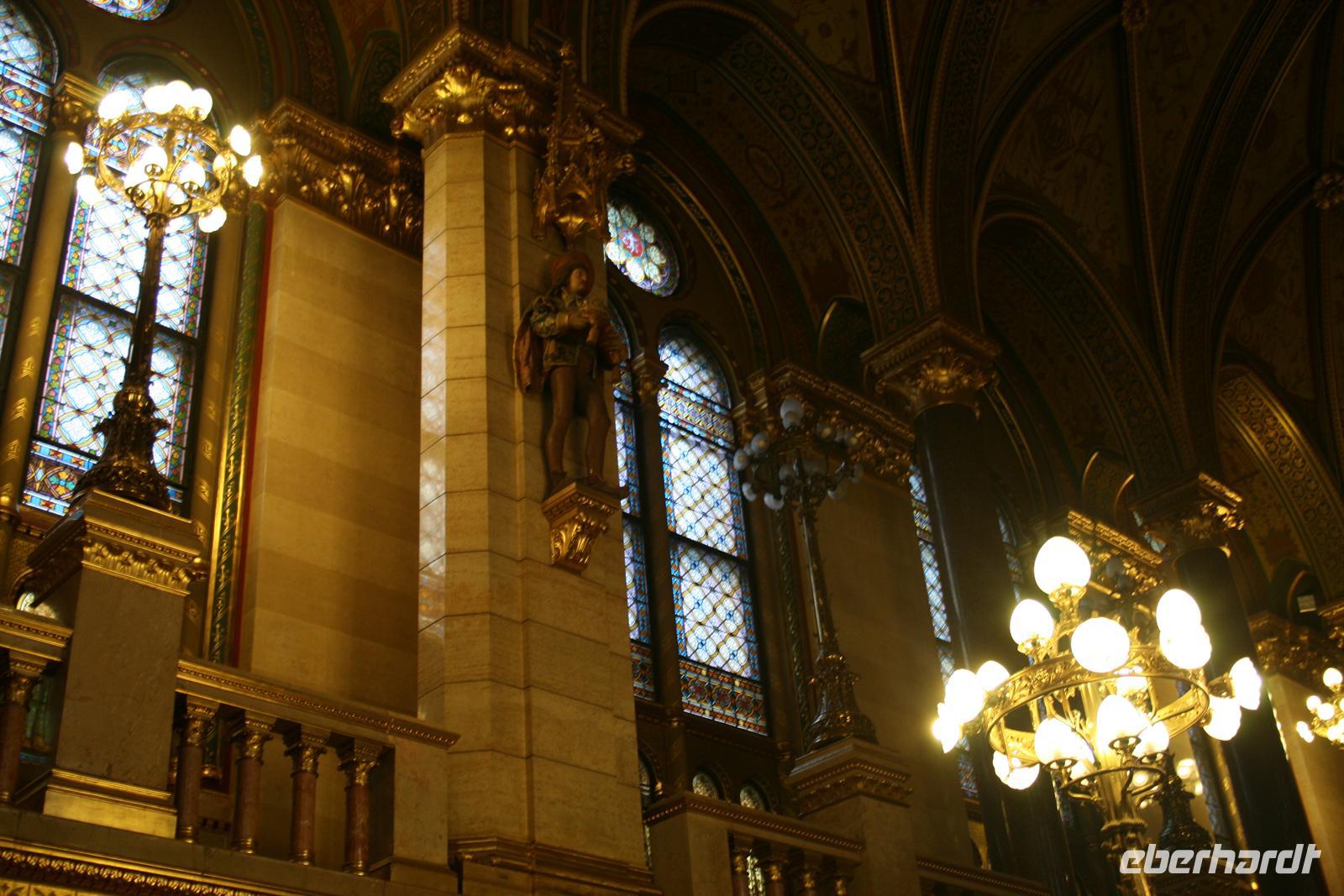 Die Kuppel ist, wie die der Stephans-Basilika (übrigens höchste Gebäude Budapests), 96 m hoch. Die 96 ist eine bedeutende Ziffer, da die Gründung Ungarns auf das Jahr 896 zurückzuführen ist, als die Magyarenstämme unter Fürst Arpad das Karpatenbecken eroberten. Zum Schluss durften wir noch einen Blick in den Sitzungssaal werfen. Nach dieser exklusiven Führung spazierten wir über den Freiheitsplatz, in dessen Mitte sich das sowjetische Ehrenmal befindet (übrigens das einzigste, noch direkt in Budapest stehen gelassene; alle anderen Denkmäler der kommunisten Zeit wurden in einen Skulpturenpark "verbannt".) Irrwitzig, dass sich gleich nebenan die Botschaft der USA befindet. Unweit prunkt die monumentale St.-Stephans-Basilika, die wir anschließend besichtigten. Einige japanische Touristen waren von den fantastischen Kuppelmosaiken im Inneren so beeindruckt und legten sich rücklings nieder.