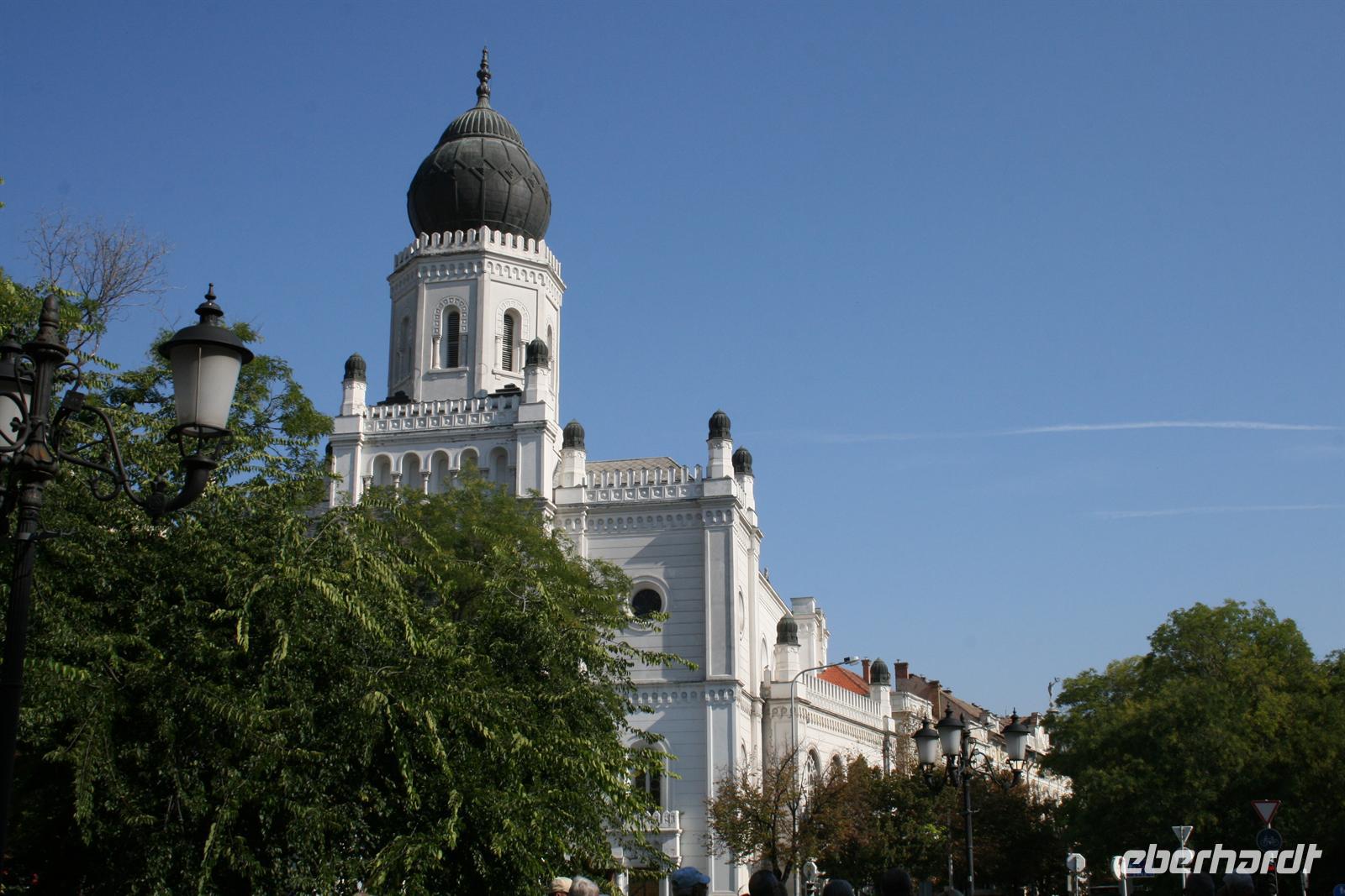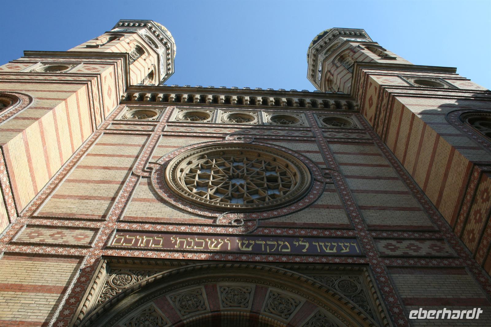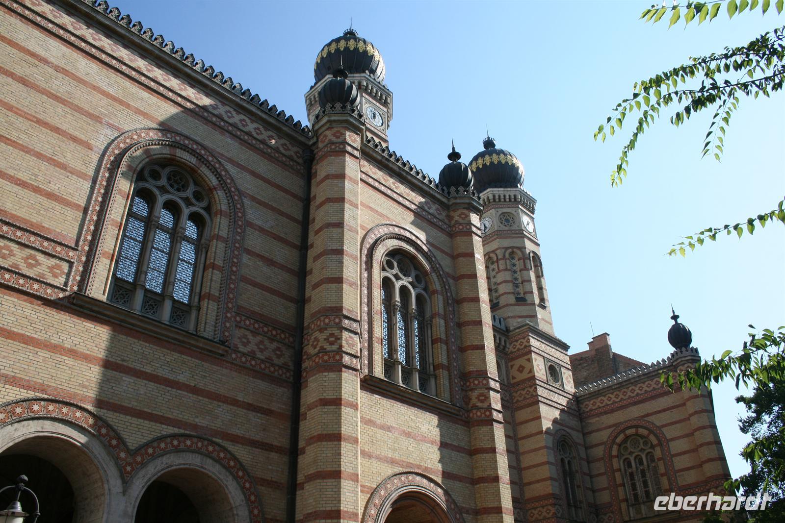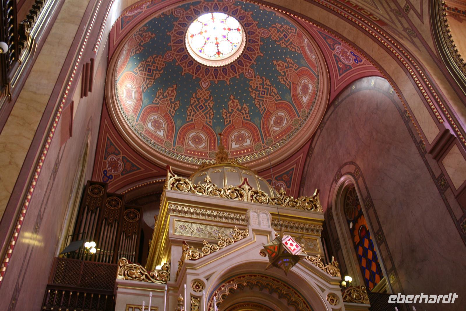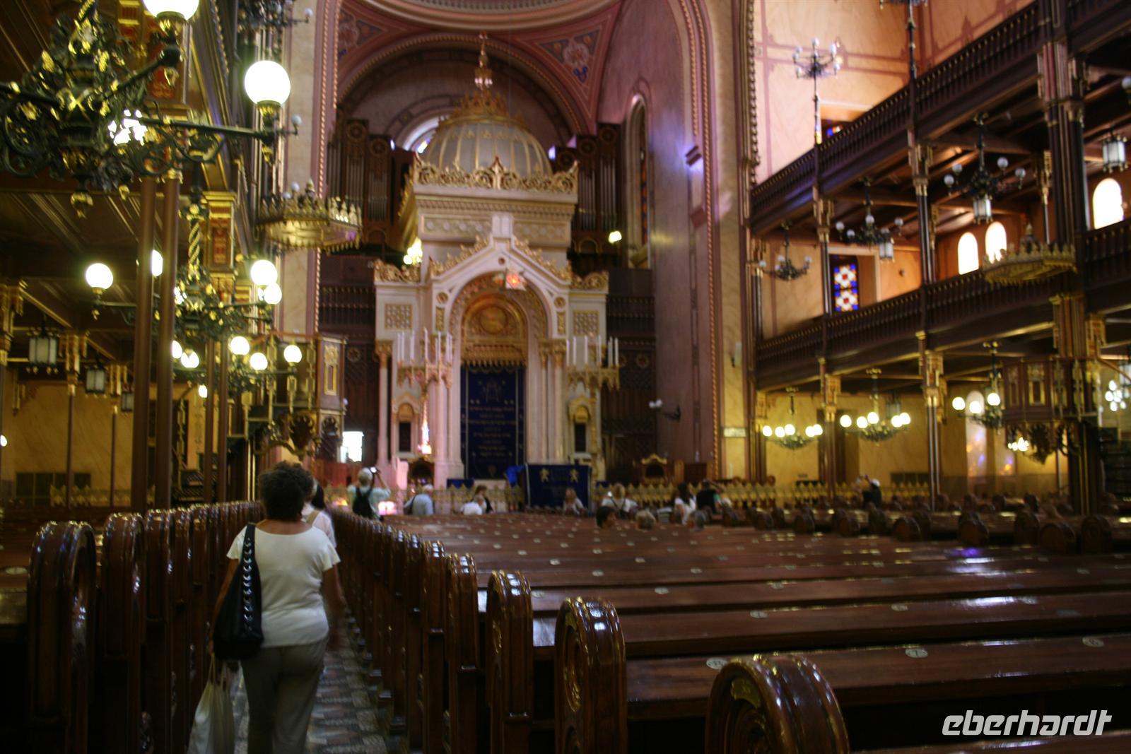 Anschließend nahmen wir in der Synagoge Platz, die im maurisch-byzantinischen Stil erbaut wurde. Vor einigen Jahren wurde die Synagoge u.a. mit Spendengeldern von Tonis Curtis restauriert. Ungewöhnlich für eine Synagoge ist, dass sich über dem vergoldeten Thoraschrein eine Orgel befindet, an der schon Franz Liszt spielte.