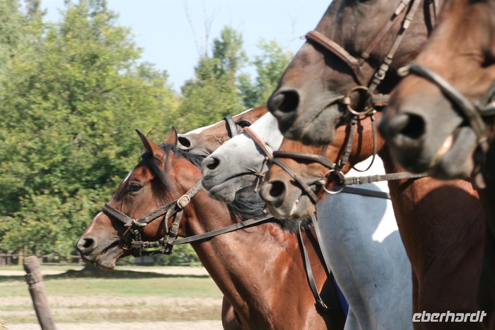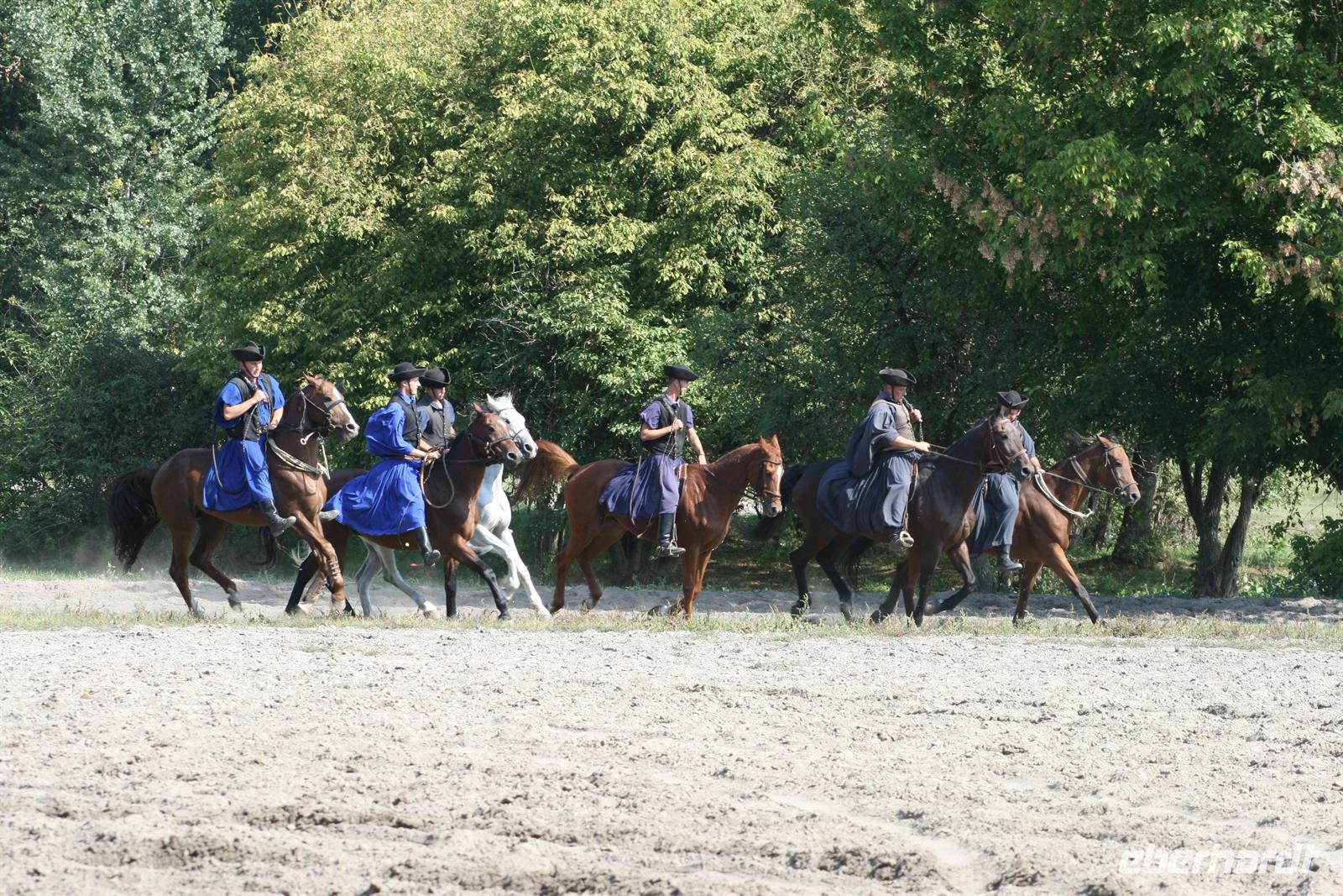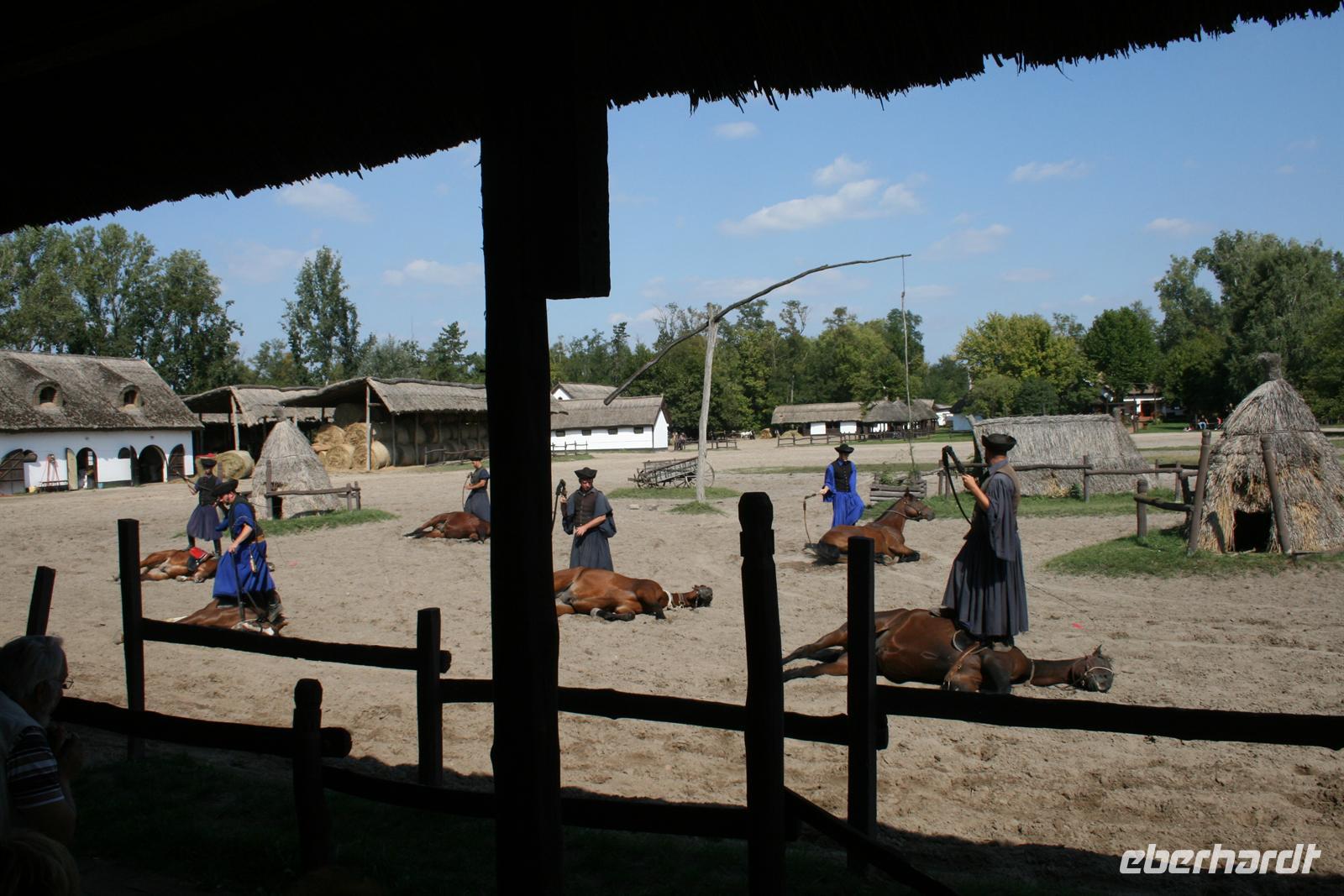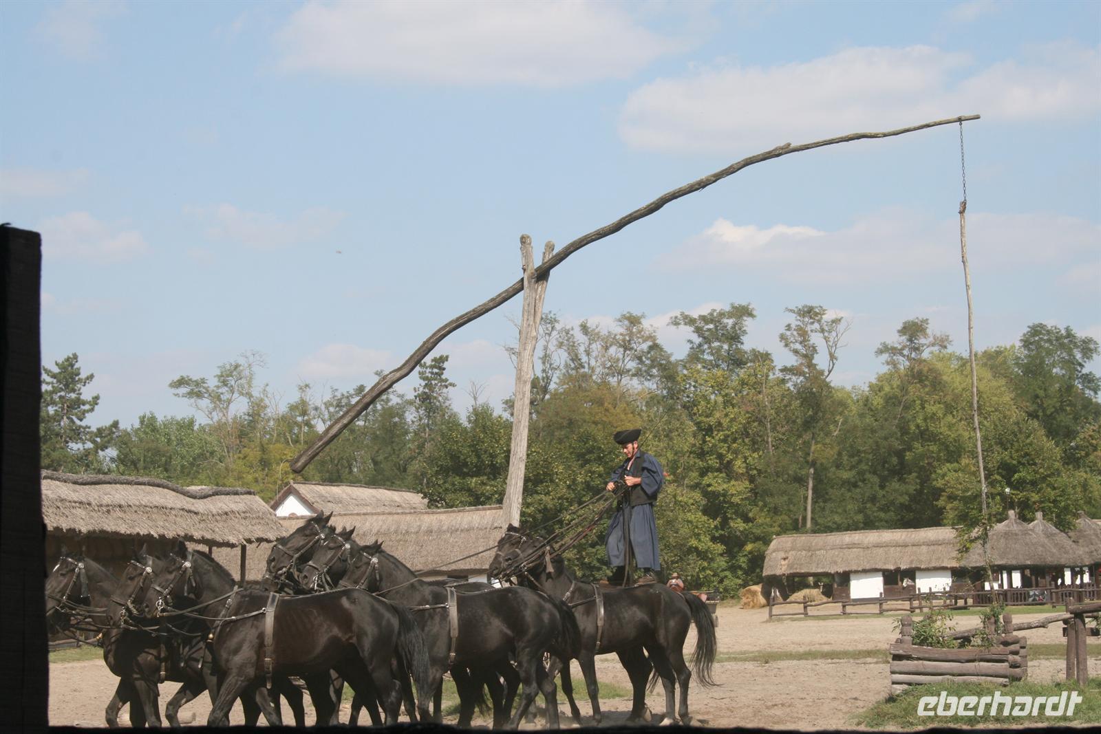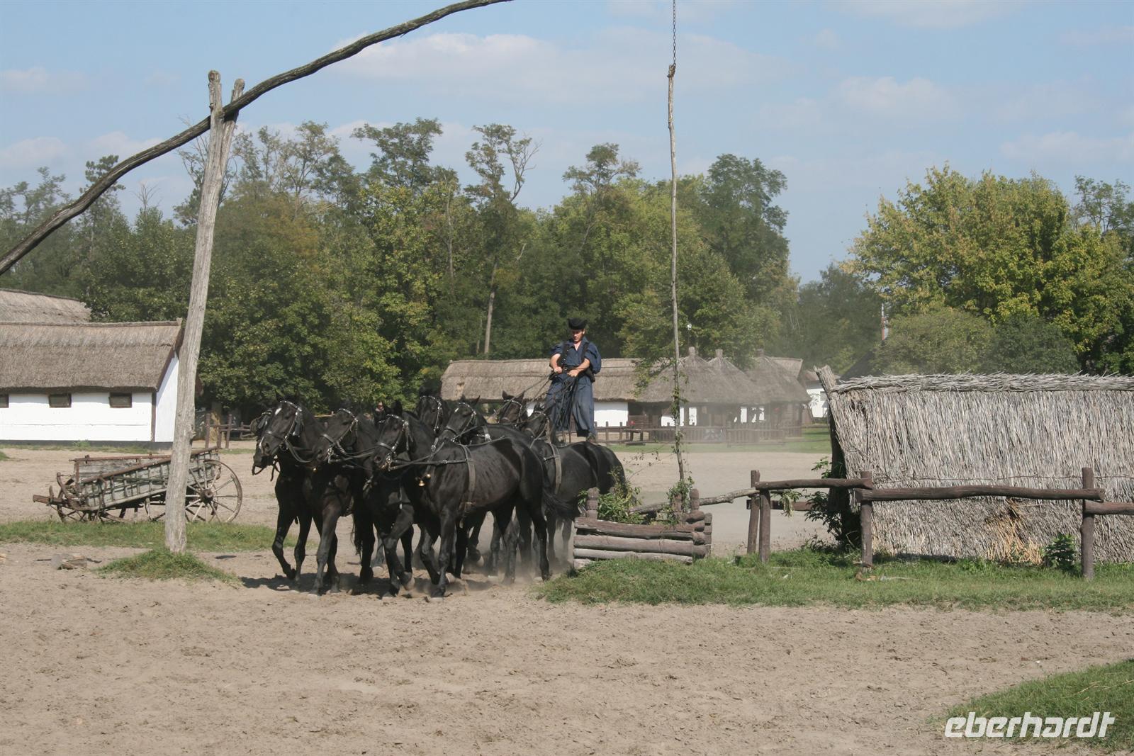 Anschließend erlebten wir ein Puszta-Programm. Csikos mit ihren Pferden zeigten uns rasante Reiterspiele und atemberaubende Kutscherleistungen mit 4er - bis 8er Gespannen. Zum Glück schauten wir nur zu und saßen wir nicht in diesen Kutschen. Ein besonderer Höhepunkt war die "Ungarische Post" - Hier ging wirklich die Post ab! Ein Csikos, auf dem Rücken 2er Pferde stehend, manövrierte 8 Pferde in einem Höllentempo über den Platz.