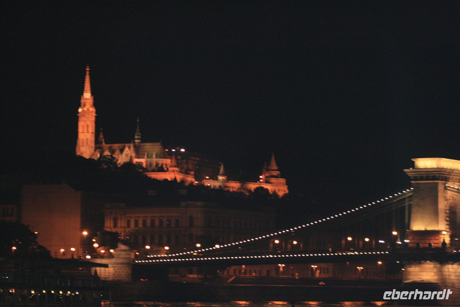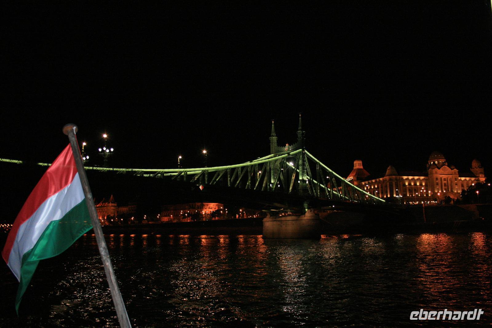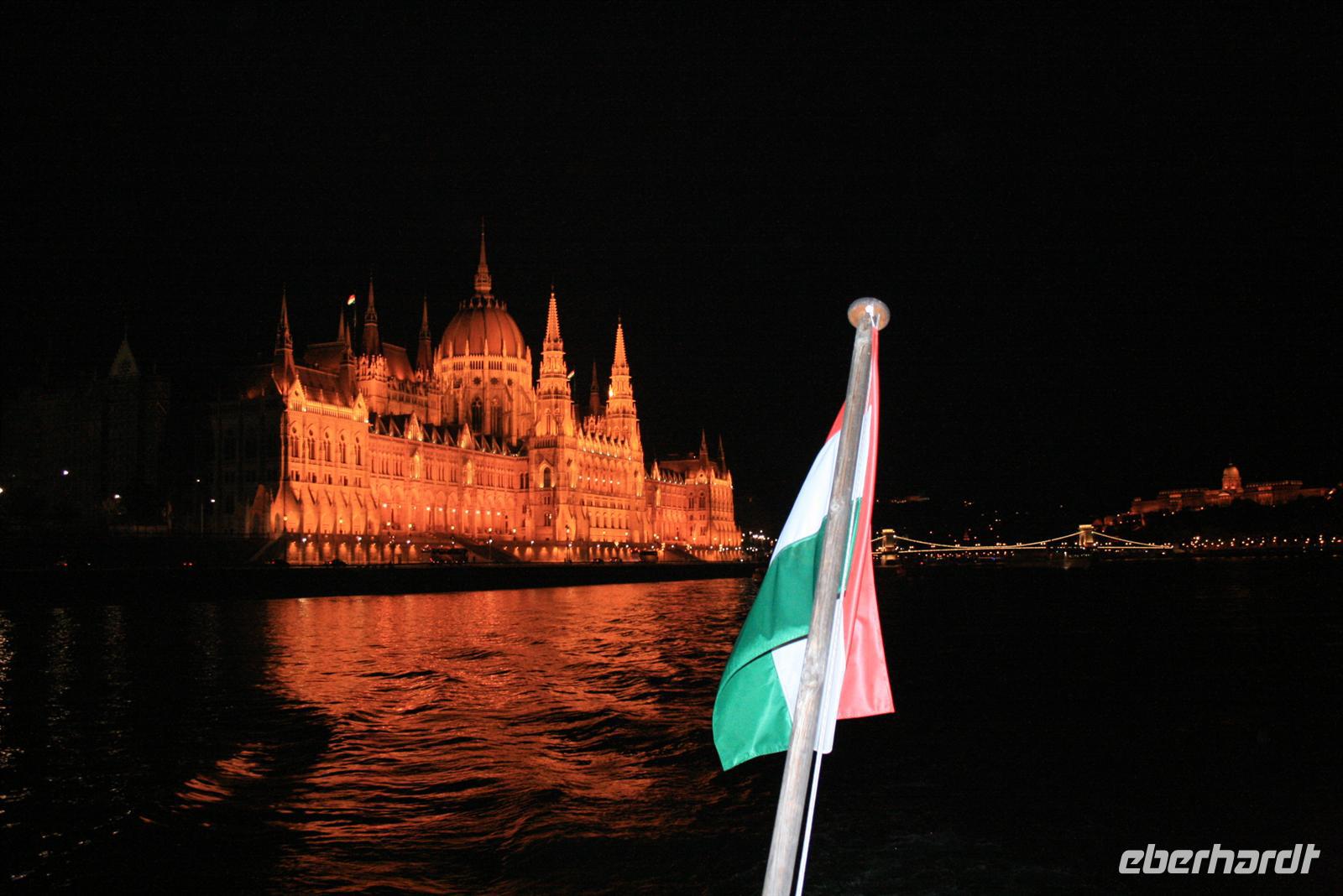 Zum Abschluß dieses Tages genossen wir eine abendliche Panoramafahrt auf der Donau. Nicht mit einem der großen Touristenboote, sondern exklusiv mit einem kleinen Boot, extra für uns! Mit ungarischem Sekt wurden wir an Bord begrüßt. Nach dem 3-Gänge-Menü zog es uns an Deck: WOW - rechts und links der Donau das beleuchtete Budapest, Fischerbastei, Burg, Zitadelle mit Freiheitsdenkmal, das Parlament und die vielen Brücken! Helga erklärte uns noch einmal das Gesehene. Die Fotoapparate klickten im Dauerton und die 2 h vergingen wie im Flug. Ein wunderschöner Abschluß der Reise oder doch noch nicht? Noch nicht ganz! Heiko, unser Buschauffeur fuhr mit uns noch zu nächtlicher Stunde auf den Gellert-Berg. Die perfekte Parklücke war schnell gefunden. Von hier oben hatten wir einen der fantastischsten Ausblicke auf der erleuchtete Budapest bei Nacht. Wir waren alle nur begeistert.