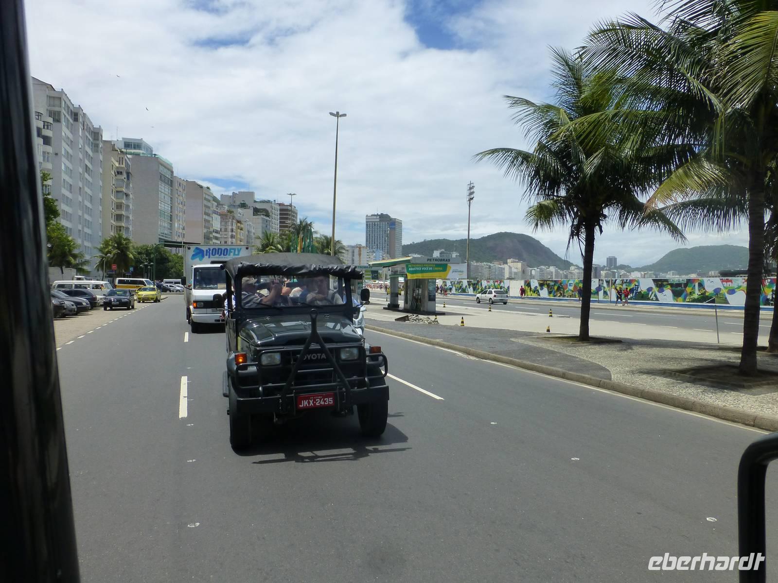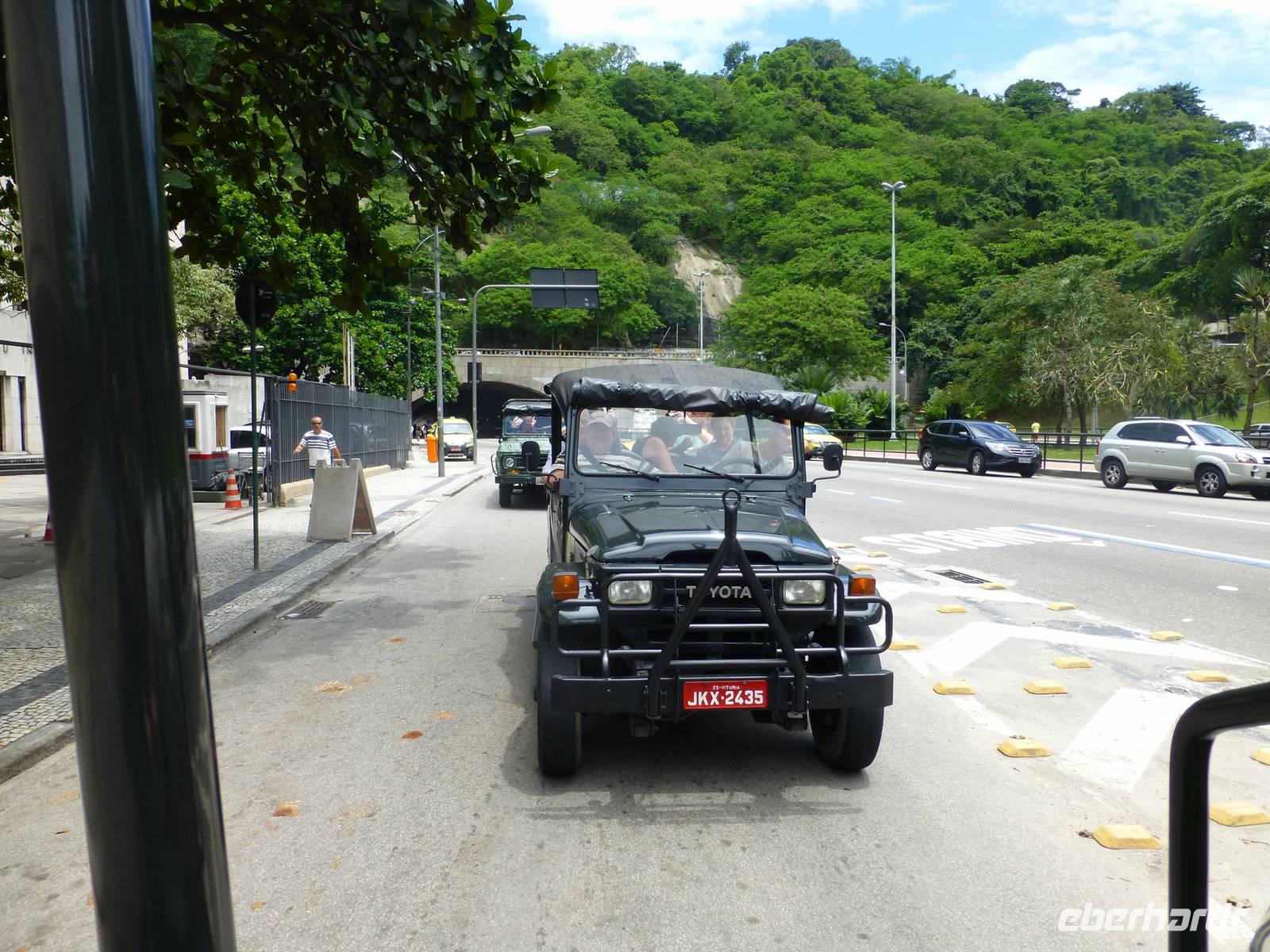 Am Nachmittag startet unsere Gruppe in 4 Jeeps zum Tijuca-Wald. Auf dem Weg dahin passieren wir die herrlichen Strände Ipanema und Le Blond und sehen auch die Kontraste zwischen moderner Großstadt und maroden Armenvierteln, den Favelas. Im Tijuca-Nationalpark, dem größten Regenwald der Welt innerhalb einer Stadt, sehen wir Wasserfälle, Bananenblüten, halten am Besucherzentrum und machen eine kleine Wanderung durch die tolle Flora des Regenwaldes. Unsere Jeeptour endet später wieder am Hotel und einige nutzen die Freizeit für ein erfrischendes Bad an der weltberühmten Praia de Copacabana!
