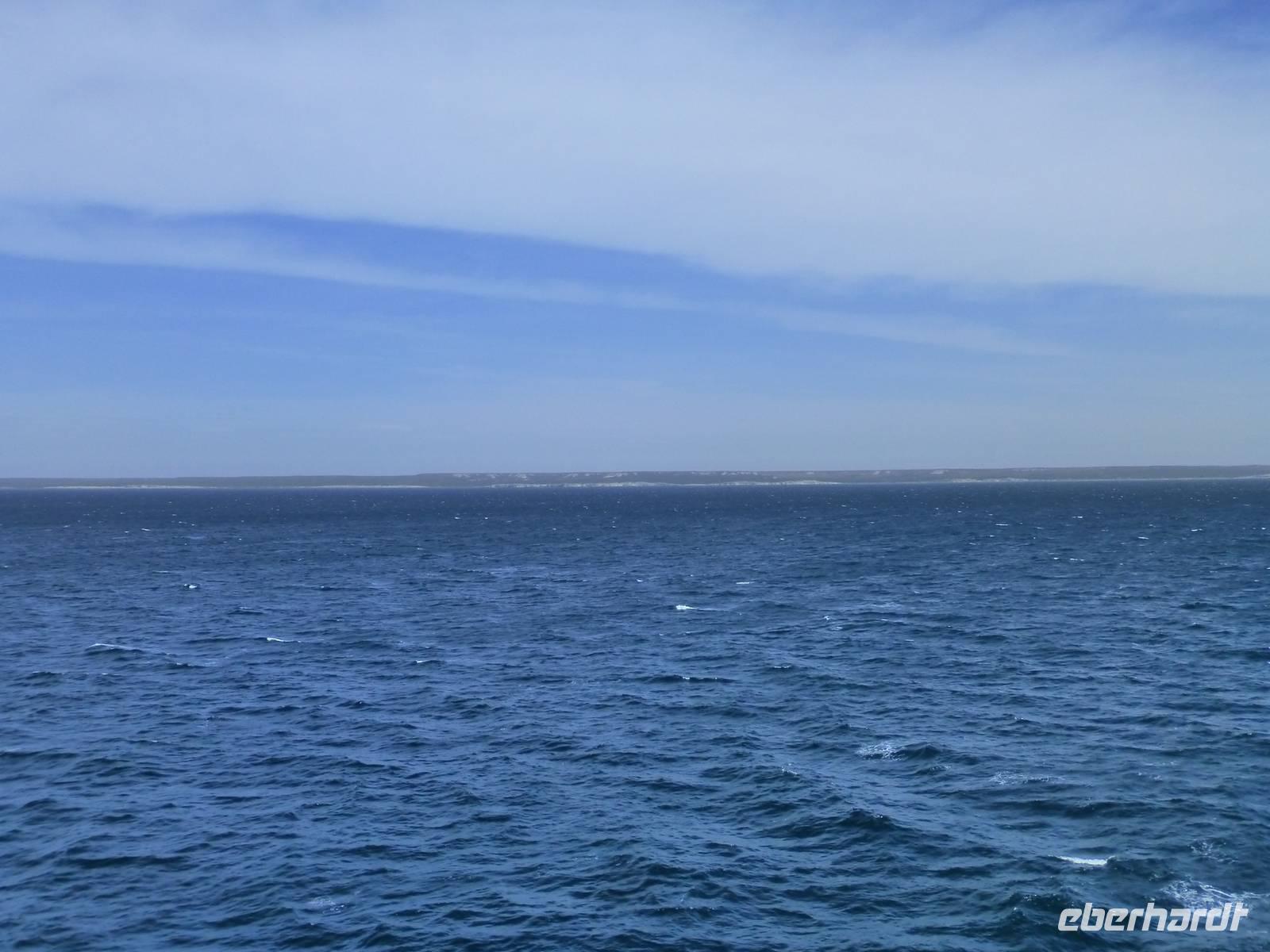 Rund um die Halbinsel Valdés bestehen gute Chancen, Wale zu beobachten. Das Motto „der frühe Vogel fängt den Wal" hat heute leider nicht geklappt. Aber im Laufe des Tages erspähen doch noch einige den einen oder anderen Wal oder Delfin. Es ist ein sonniger Tag und der Seegang lässt am Morgen zum Glück auch nach. An Deck ist es recht windig, aber jeder findet bis zum verspäteten Anlegen 13.30 Uhr sein persönliches Lieblingsplätzchen an Bord. Dann kommt plötzlich die unerwartete Durchsage vom Kapitän, dass wir wegen des starken Windes nicht in Puerto Madryn anlegen können. Sicherheit geht vor und so fahren wir an der Halbinsel Valdés vorbei - ohne Landgang und mit einem zusätzlichen Seetag.