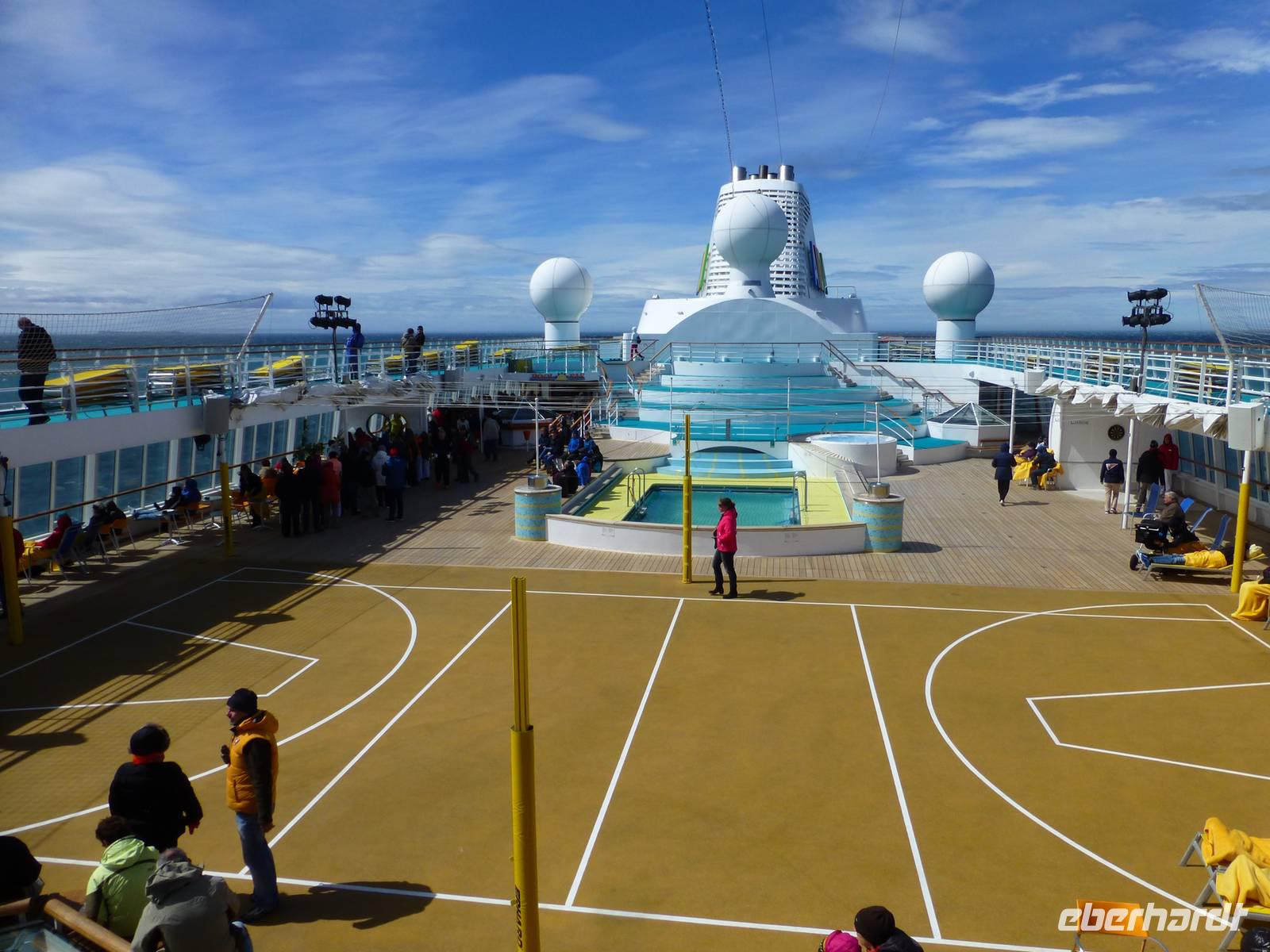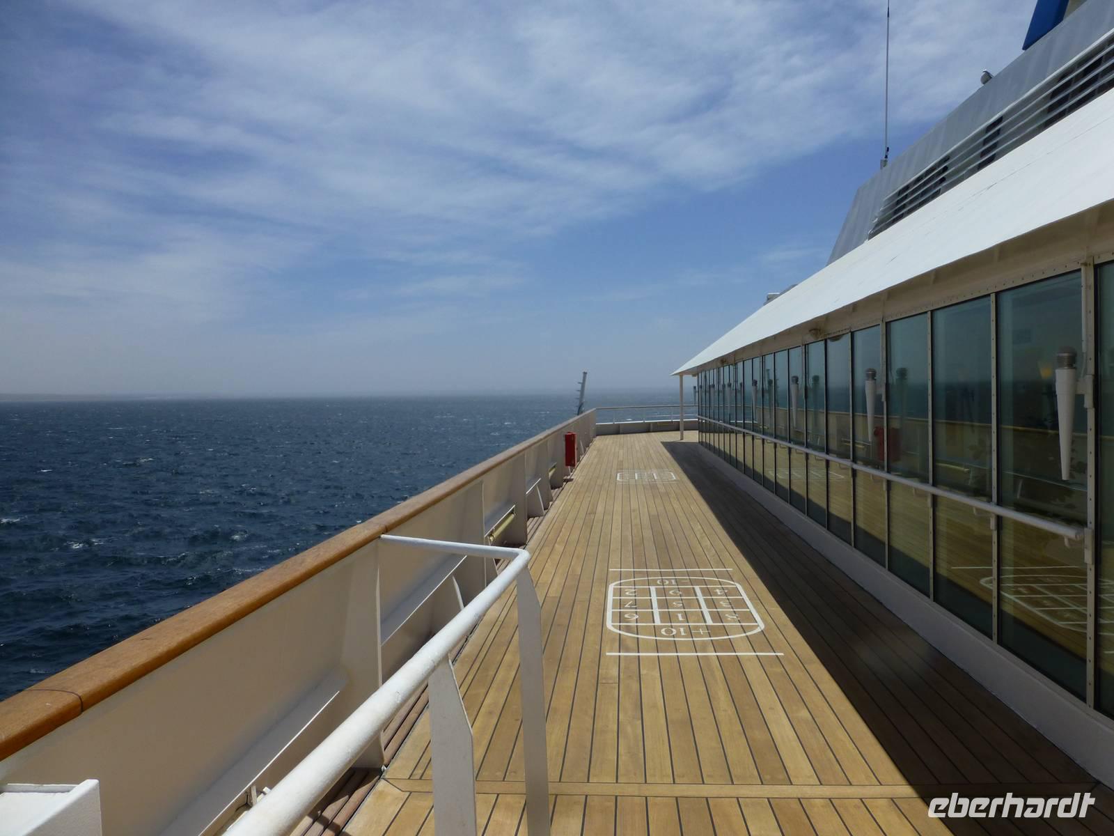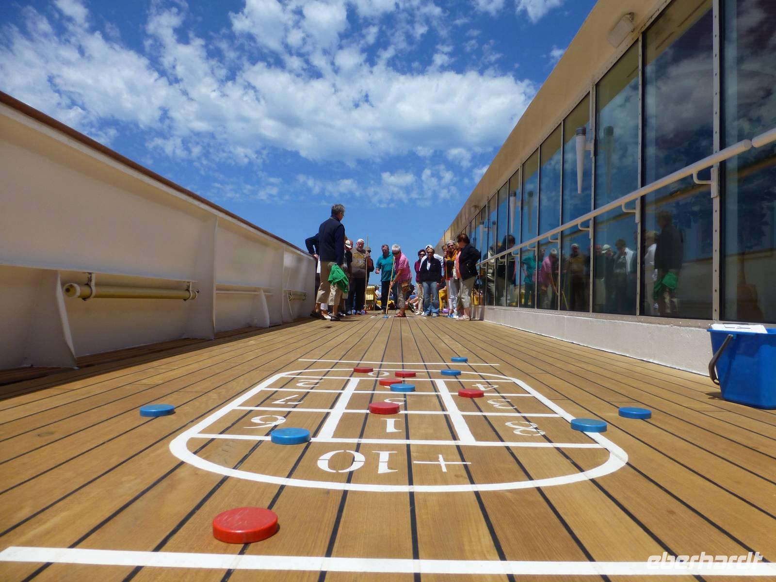 Kaum zu glauben, dass wir vor ein paar Tagen auf dem südlichen Kurs derartigen Seegang hatten. Dieser Tage gleitet das Schiff herrlich ruhig über den Atlantik. Bei strahlend blauem Himmel und Sonnenschein kann man sich in die warme Decke einkuscheln und auf dem Pooldeck die Seeluft um die Nase wehen lassen oder ein gutes Buch lesen. Spiel und Spaß haben wir beim Eberhardt-Shuffleboard-Turnier - es ist der älteste Schiffssport und wurde auf der Titanic erfunden... aber die Eisberge haben wir ja schon hinter uns gelassen. Bei all dem guten Essen an Bord beruhigt der eine oder andere sein Gewissen bei Sportkursen oder auf dem Fahrrad. Sport frei!
