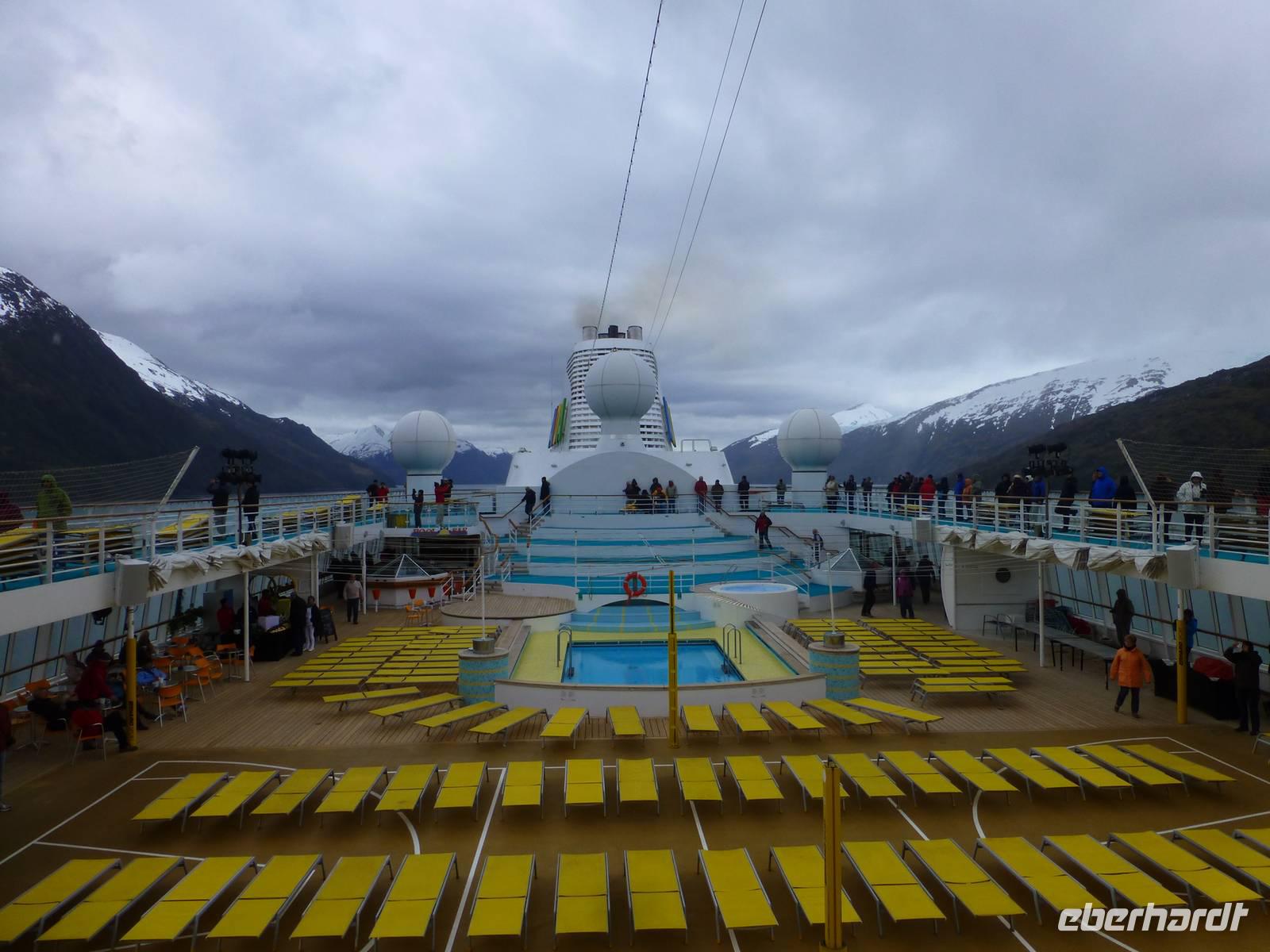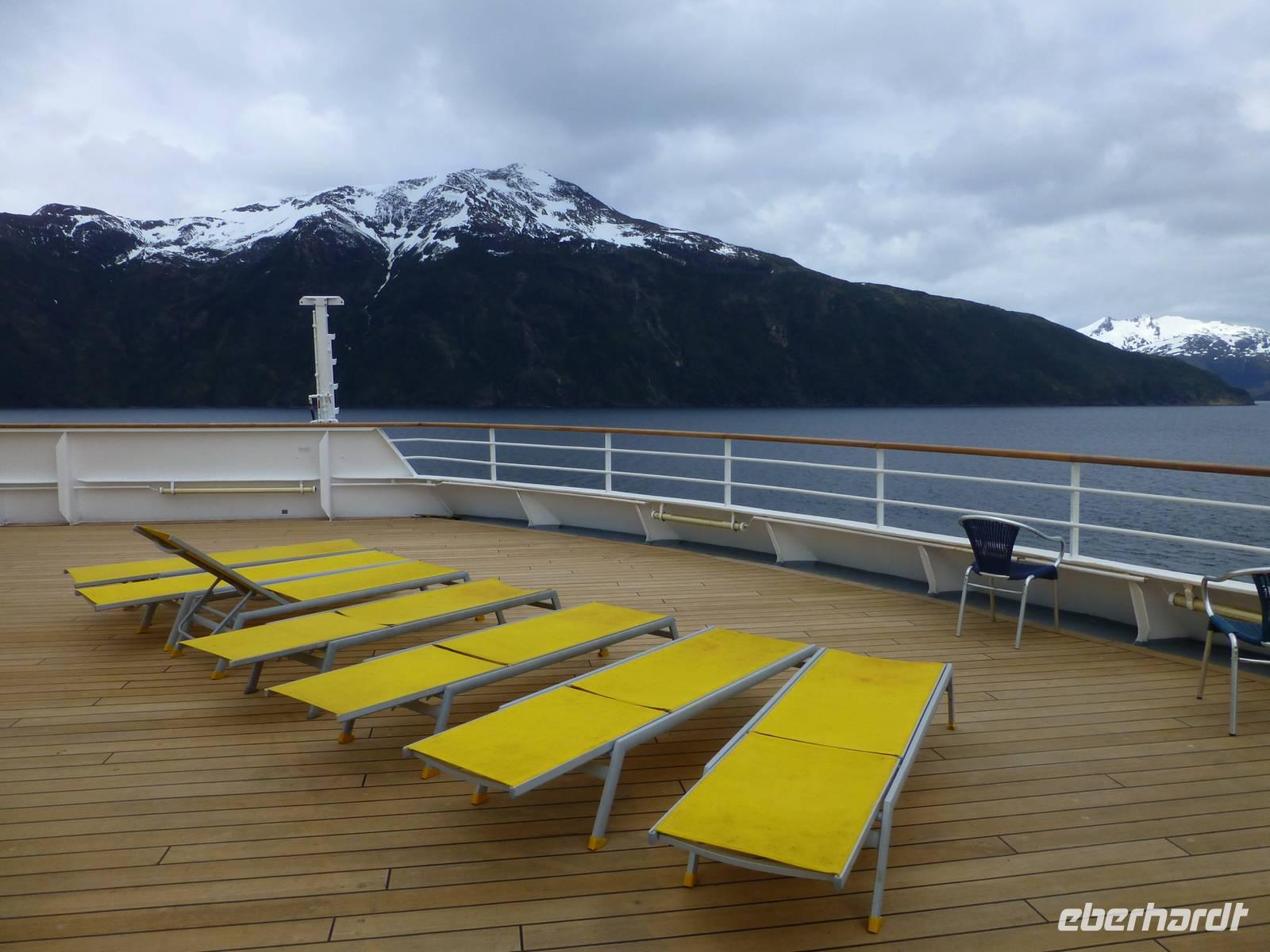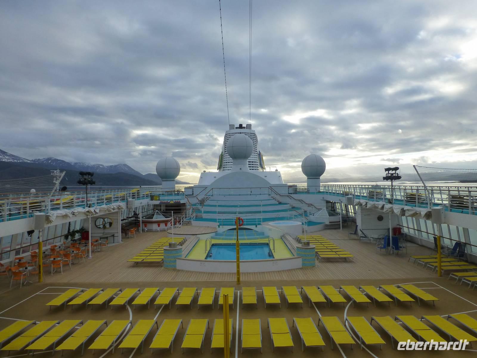 Kaum zu glauben, dass wir vor ein paar Tagen auf dem südlichen Kurs derartigen Seegang hatten. Dieser Tage gleitet das Schiff herrlich ruhig über den Atlantik. Bei strahlend blauem Himmel und Sonnenschein kann man sich in die warme Decke einkuscheln und auf dem Pooldeck die Seeluft um die Nase wehen lassen oder ein gutes Buch lesen. Spiel und Spaß haben wir beim Eberhardt-Shuffleboard-Turnier - es ist der älteste Schiffssport und wurde auf der Titanic erfunden... aber die Eisberge haben wir ja schon hinter uns gelassen. Bei all dem guten Essen an Bord beruhigt der eine oder andere sein Gewissen bei Sportkursen oder auf dem Fahrrad. Sport frei!