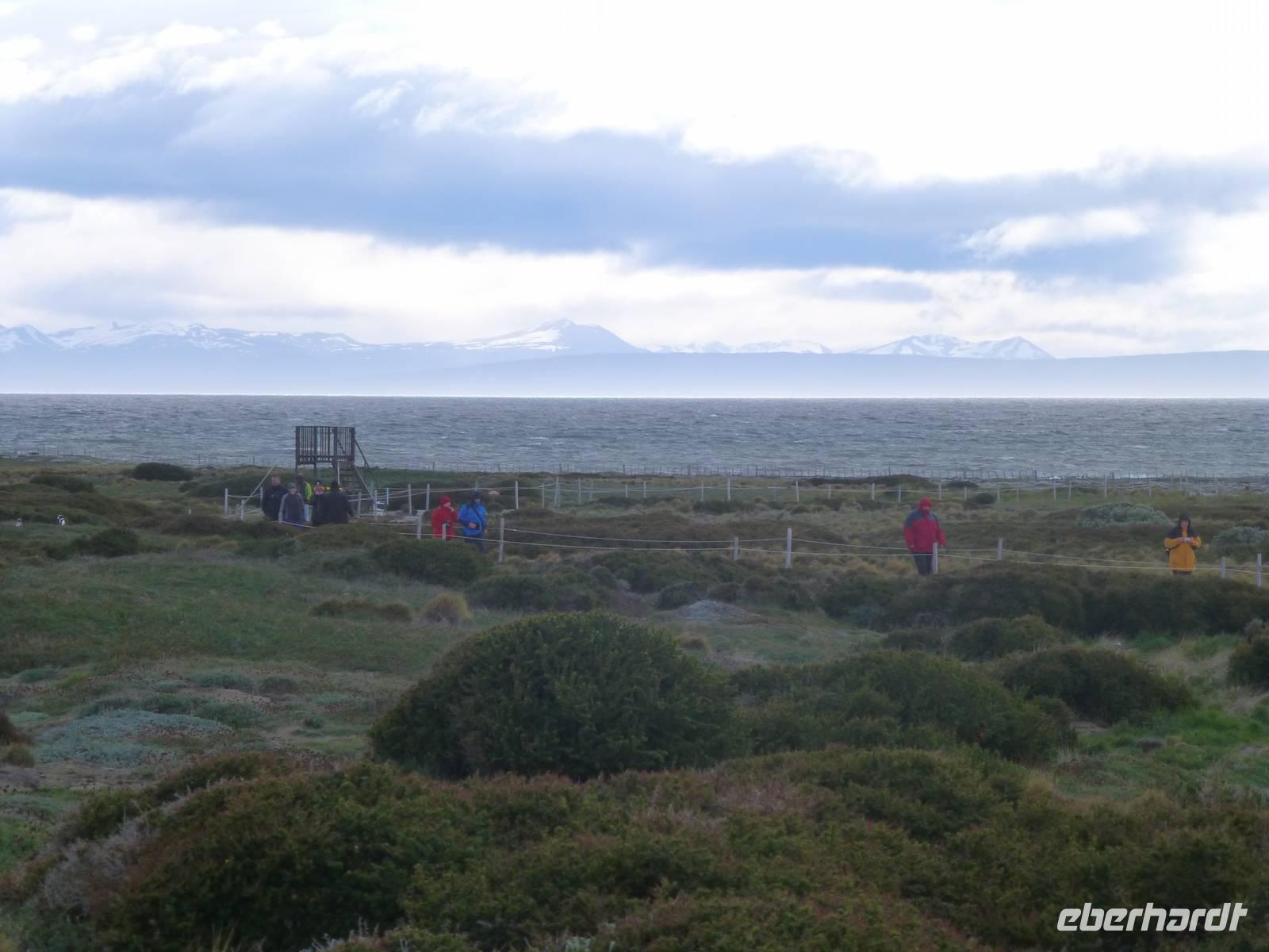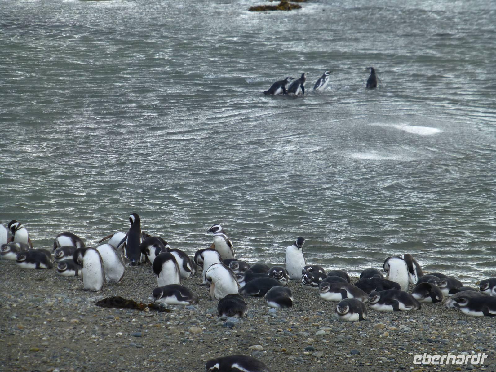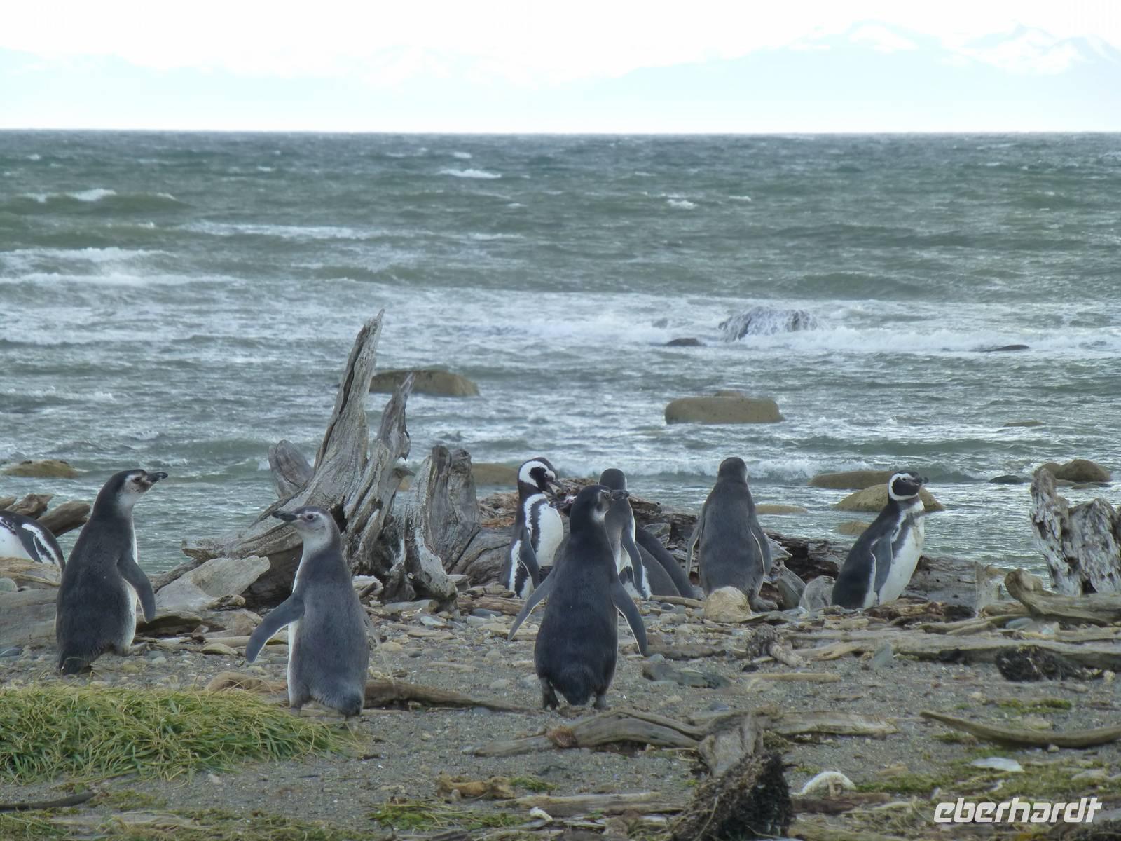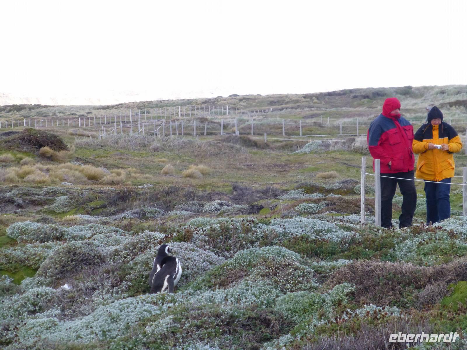 Noch ein Höhepunkt steht uns anschließend bevor - über eine Schotterpiste fahren wir durch die patagonische Steppe zum Seno Otway, wo wir die Bewohner des Strandabschnittes besuchen - die possierlichen Magellan-Pinguine. Ein kräftiger Wind weht uns um die Ohren, aber wir bahnen uns den Weg bis zum Strand, wo uns die putzigen "Frack-Träger" erwarten und uns Porträt stehen.