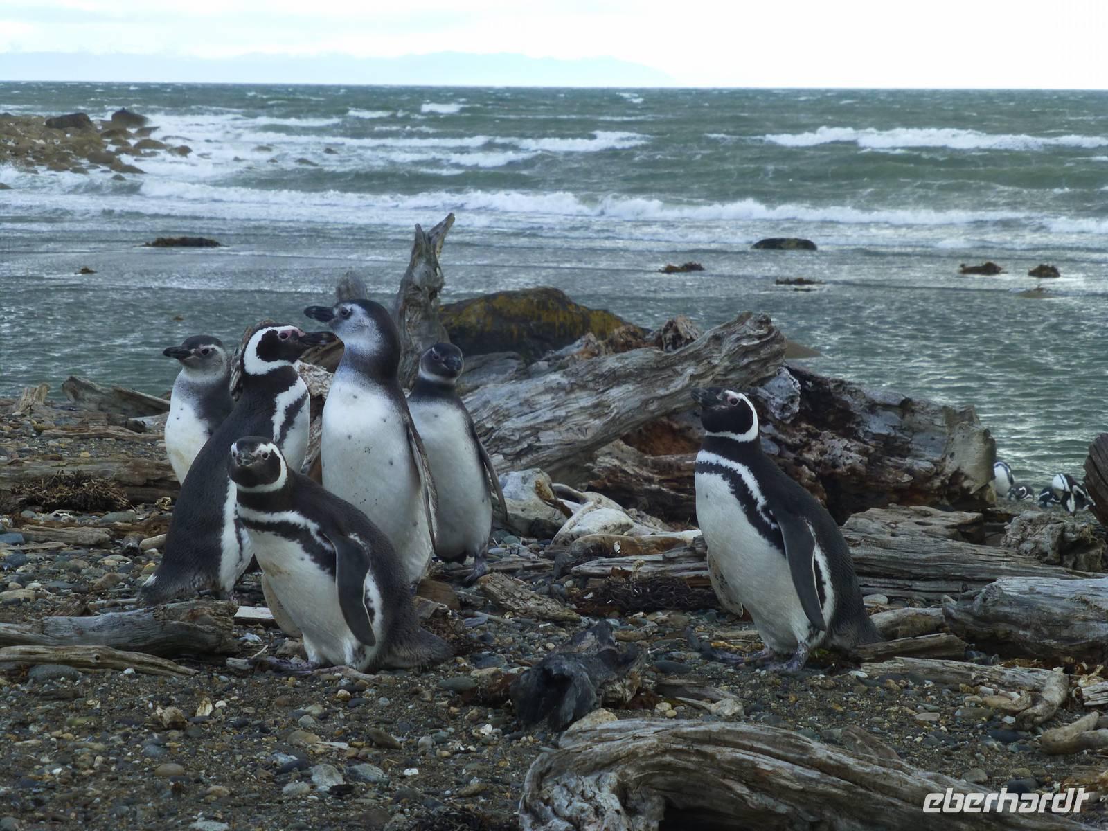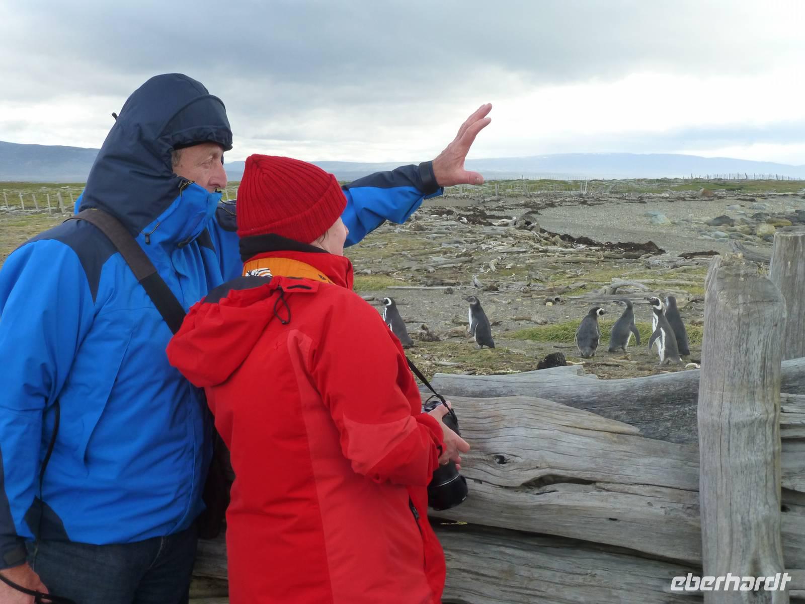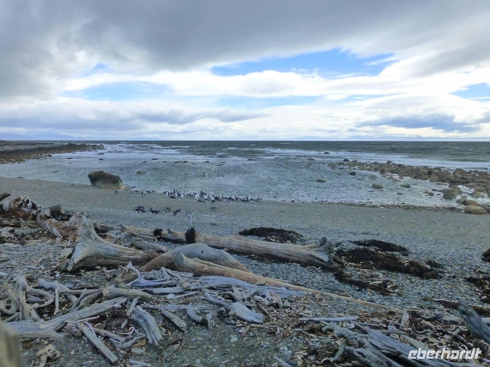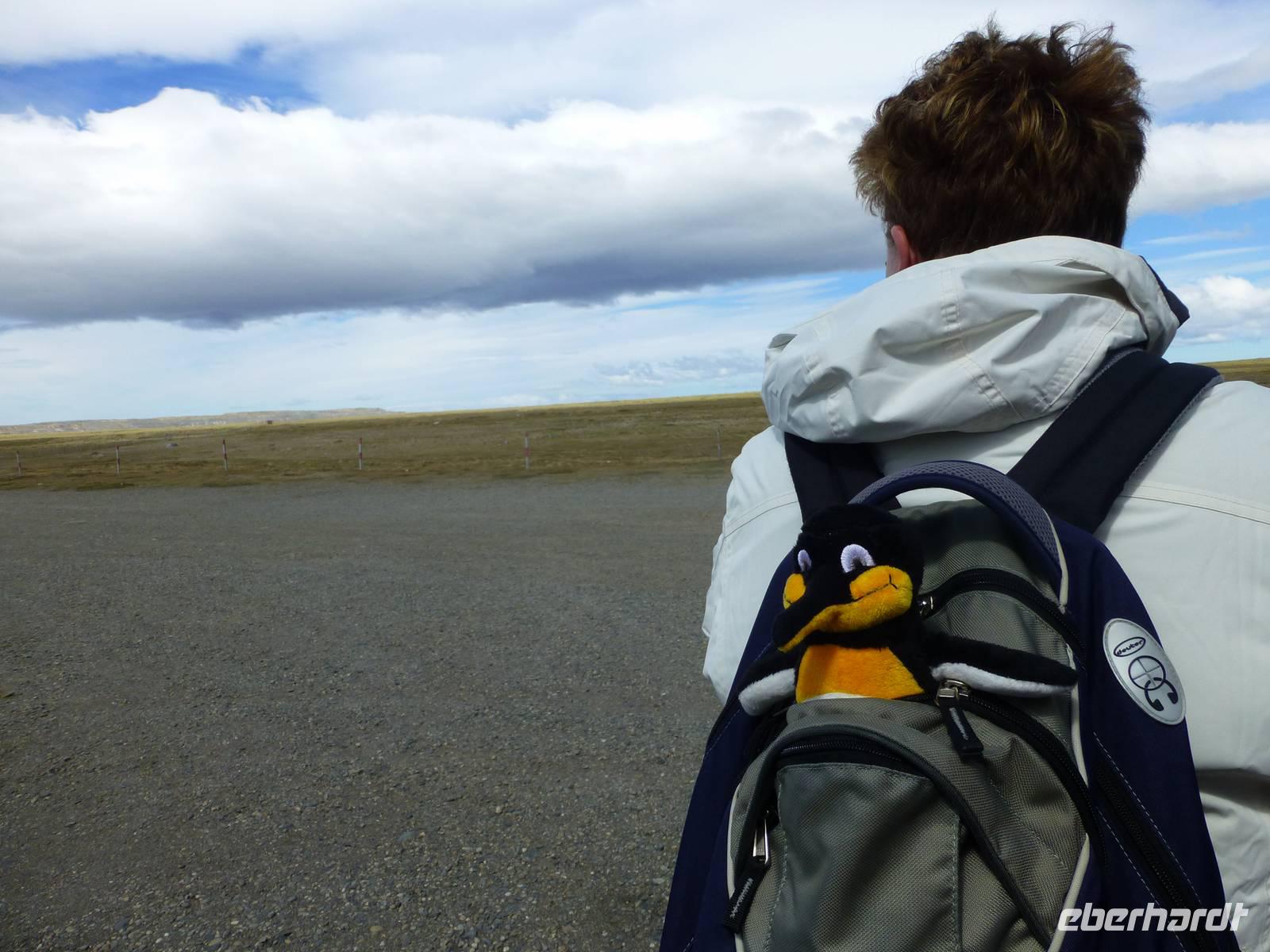 Noch ein Höhepunkt steht uns anschließend bevor - über eine Schotterpiste fahren wir durch die patagonische Steppe zum Seno Otway, wo wir die Bewohner des Strandabschnittes besuchen - die possierlichen Magellan-Pinguine. Ein kräftiger Wind weht uns um die Ohren, aber wir bahnen uns den Weg bis zum Strand, wo uns die putzigen "Frack-Träger" erwarten und uns Porträt stehen.