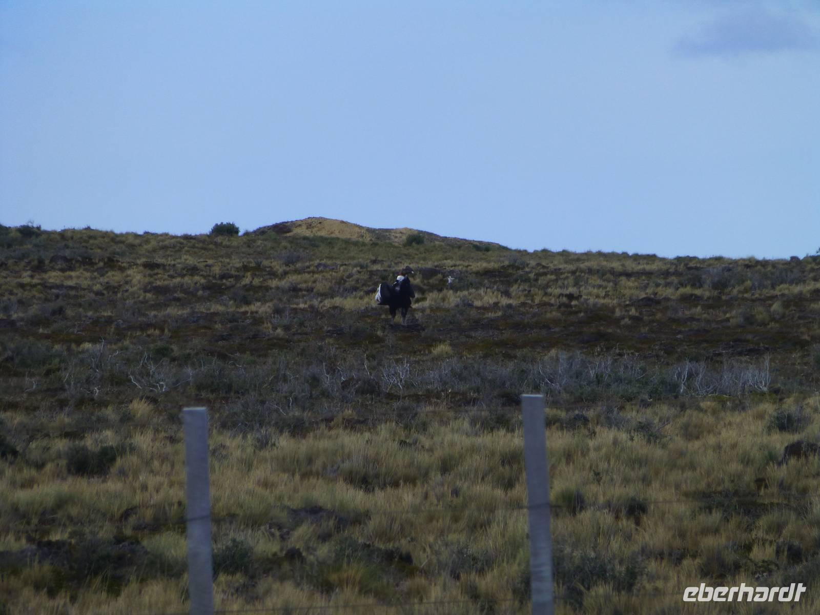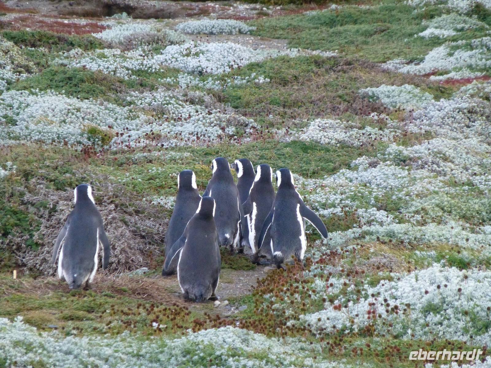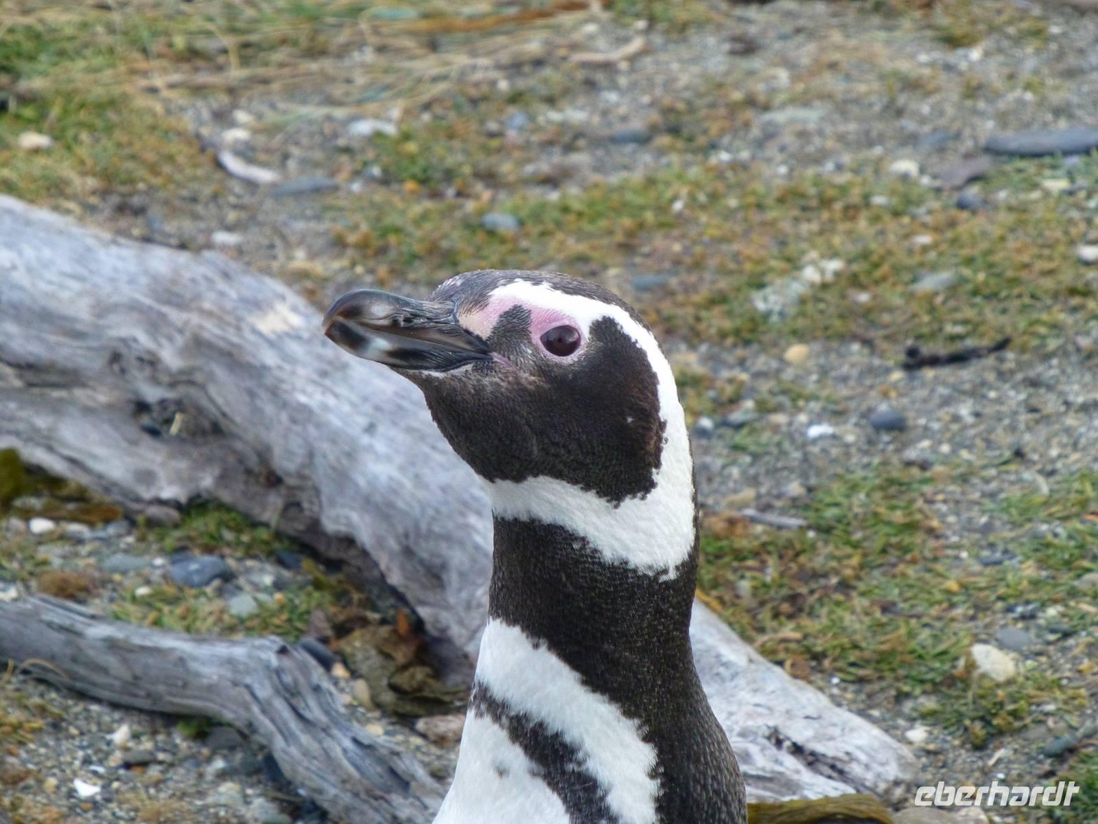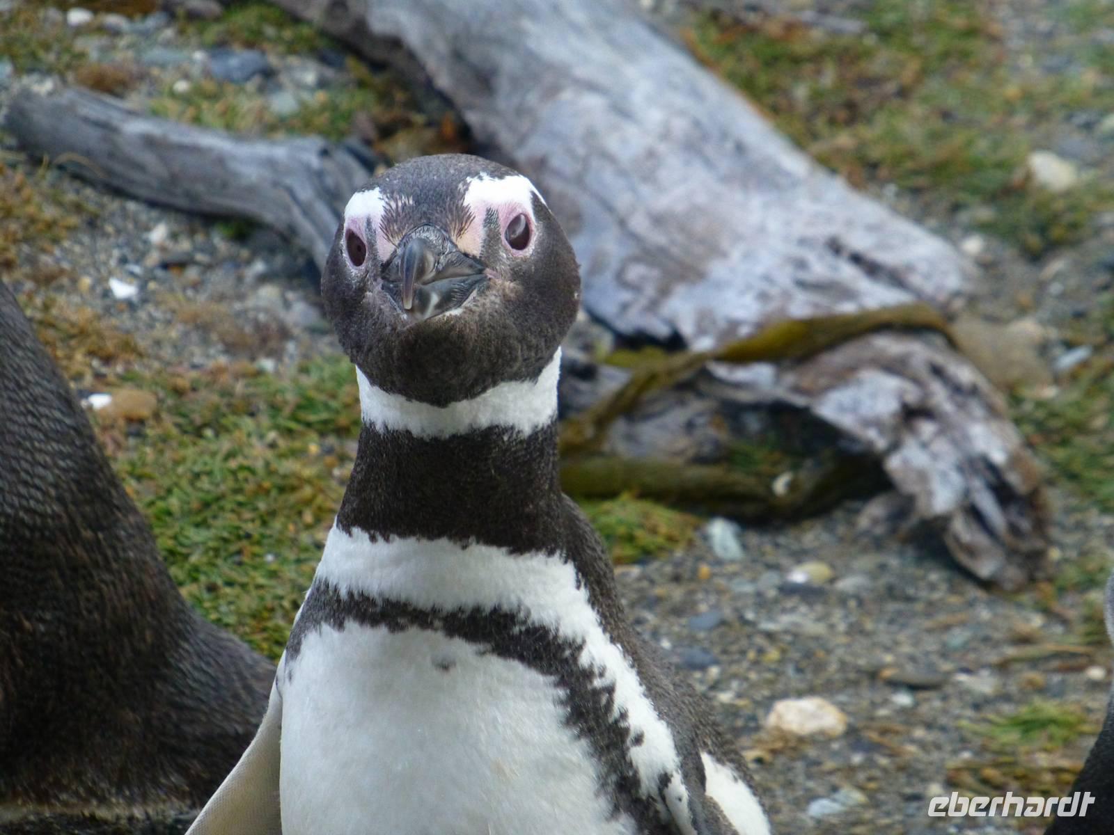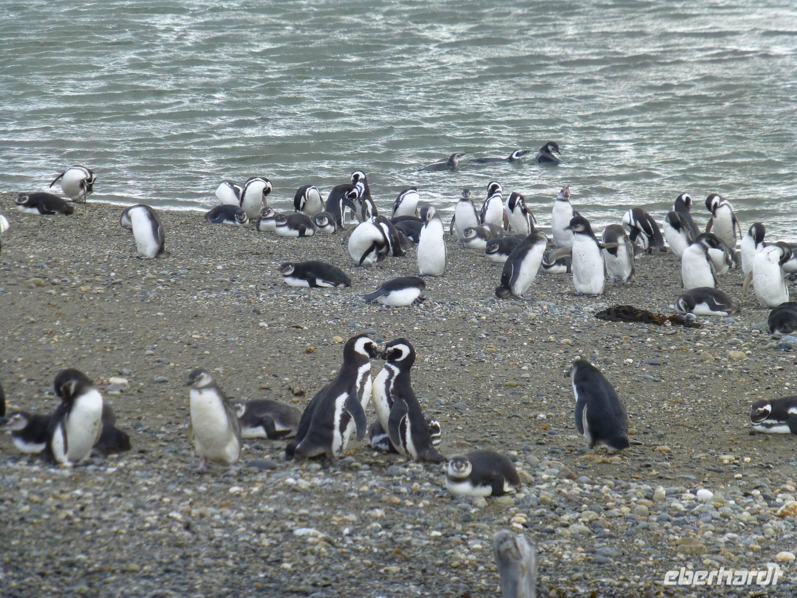 Noch ein Höhepunkt steht uns anschließend bevor - über eine Schotterpiste fahren wir durch die patagonische Steppe zum Seno Otway, wo wir die Bewohner des Strandabschnittes besuchen - die possierlichen Magellan-Pinguine. Ein kräftiger Wind weht uns um die Ohren, aber wir bahnen uns den Weg bis zum Strand, wo uns die putzigen "Frack-Träger" erwarten und uns Porträt stehen.