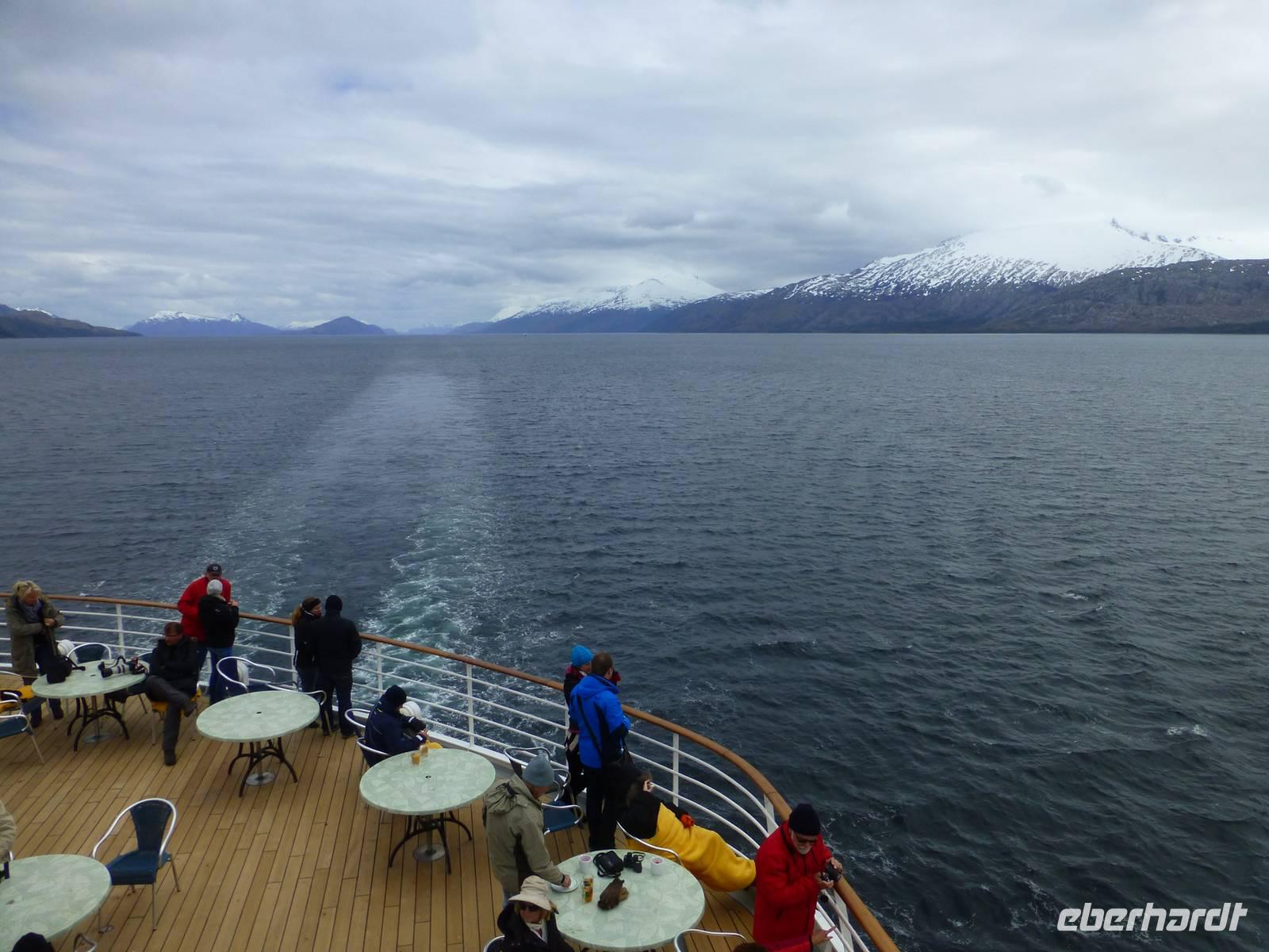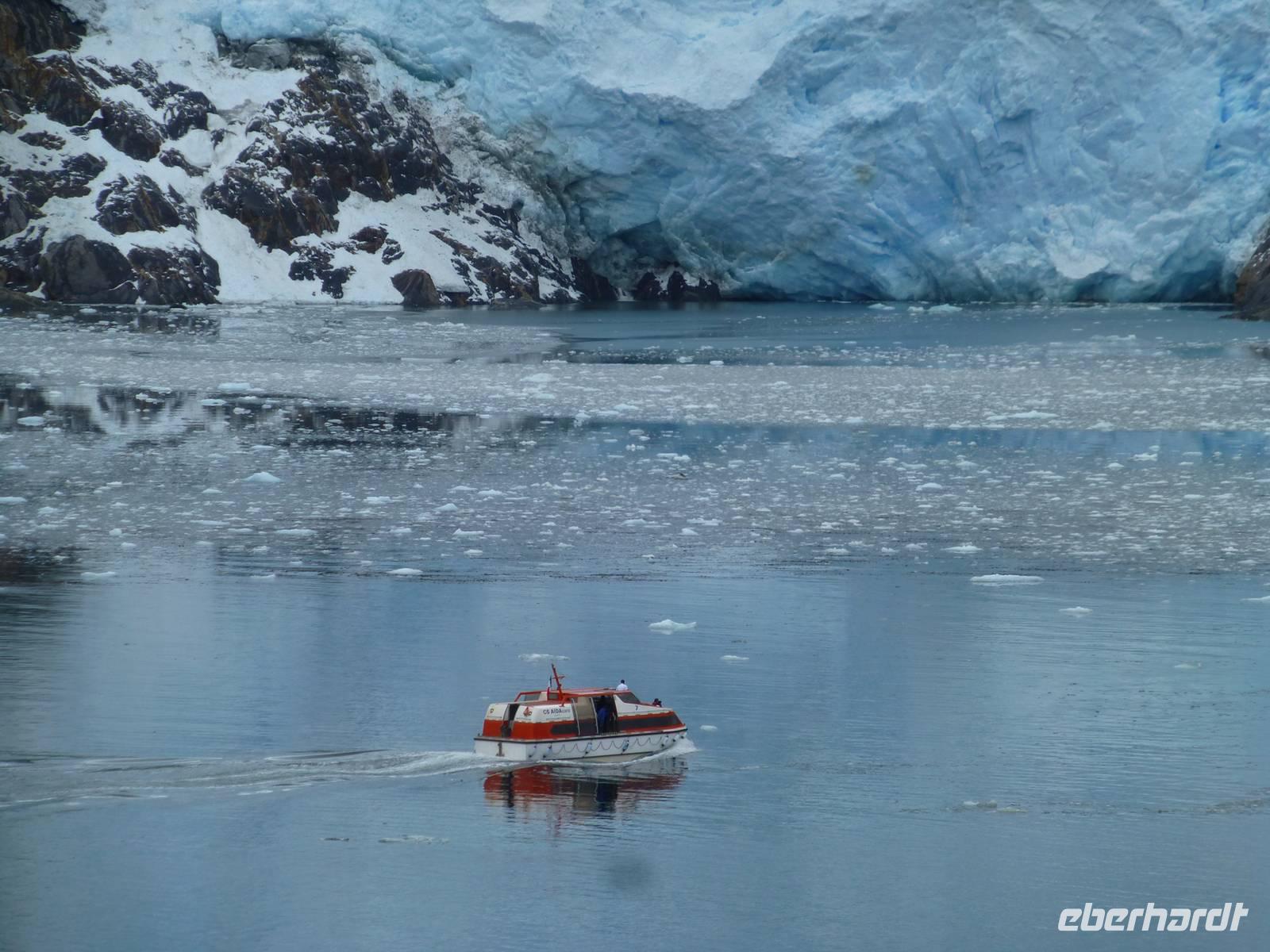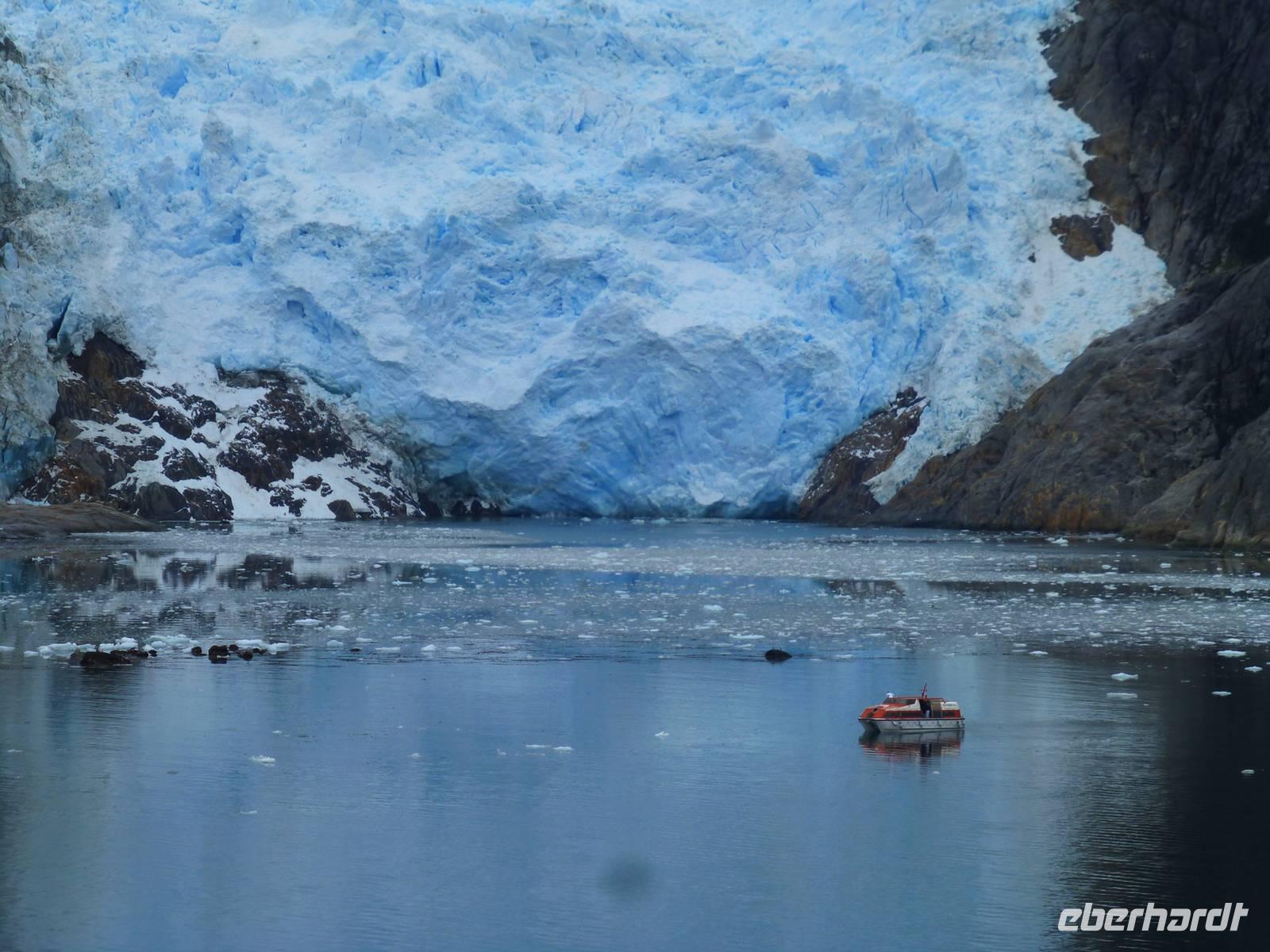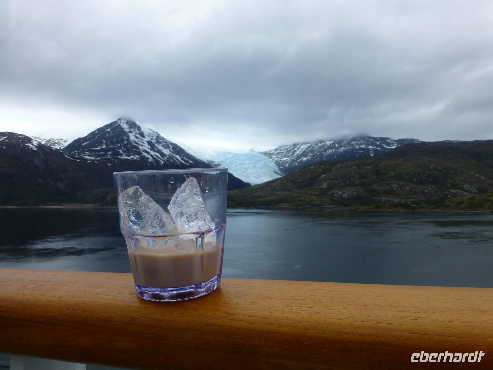 Am Vormittag gibt sich unser Kapitän die Ehre und lädt zum Eberhardt-Gruppenfoto. Bitte recht freundlich ! Angesichts der bevorstehenden Ereignisse fällt uns dies gar nicht schwer, denn zweifelsohne ist heute ein unvergesslicher Tag: AIDAcara manövriert durch die Straße der Gletscher in der Magellanstraße hinein in den Beagle-Kanal. Man kommt aus dem Staunen gar nicht mehr heraus! Auf der Backbordseite präsentieren sich uns nacheinander die unterschiedlichen Gletscher. Wir passieren den Roma-Gletscher, den Holländischen Gletscher, den Deutschen Gletscher und erreichen schließlich den Italienischen Gletscher, den größten und wohl eindrucksvollsten der eisigen Giganten. Als besonderes Highlight wird ein Tenderboot zu Wasser gelassen, das ganz nah an das Eis heran fährt. Der Bootsmann kommt nicht mit leeren Händen zurück und die Bar-Crew reicht auf dem Pooldeck Whiskey und Baileys on the Rocks mit echtem, tausende Jahre alten Gletschereis. WOW!